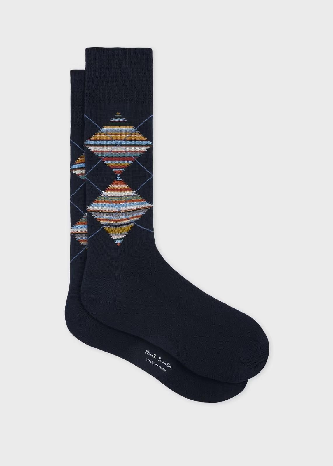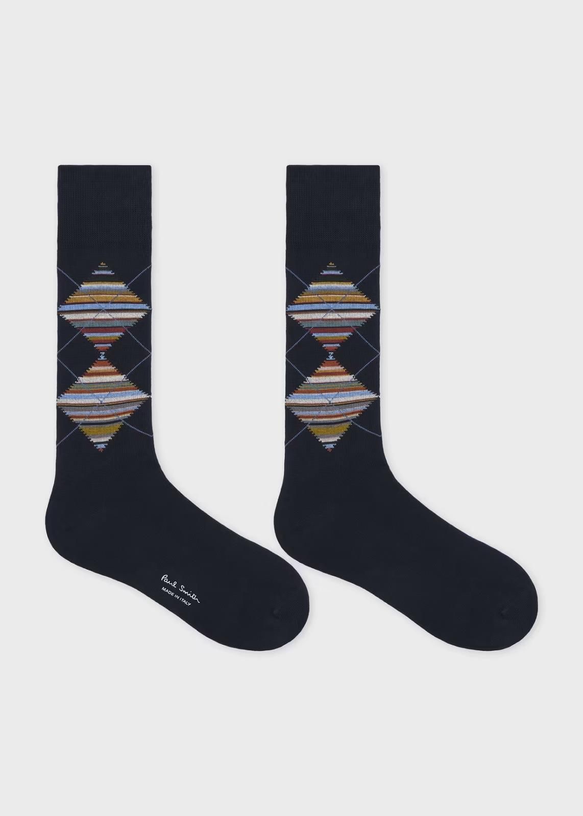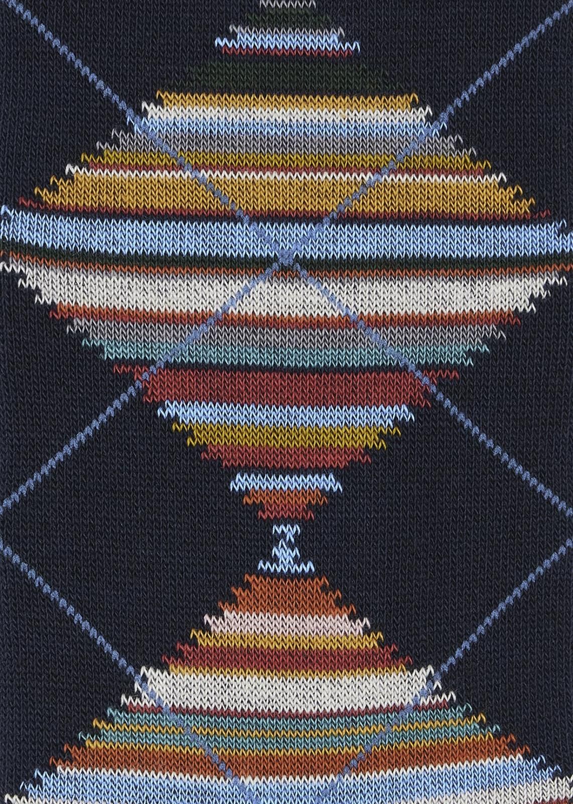 Sokken Signature Stripe Argyle Socks van Paul Smith voor heren. Deze blauwe sokken zijn gemaakt in Italië van een zachte katoenmix. Zijn voorzien van de 'Signature Stripe Argyle’ patroon in het midden van de kous, die voor een vleugje kleur zorgen. Is 1 maat van 40 tot 45.