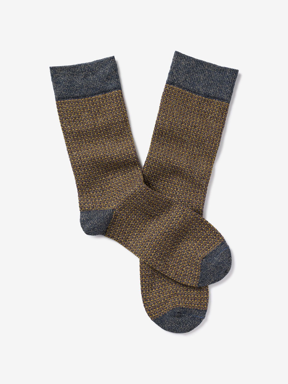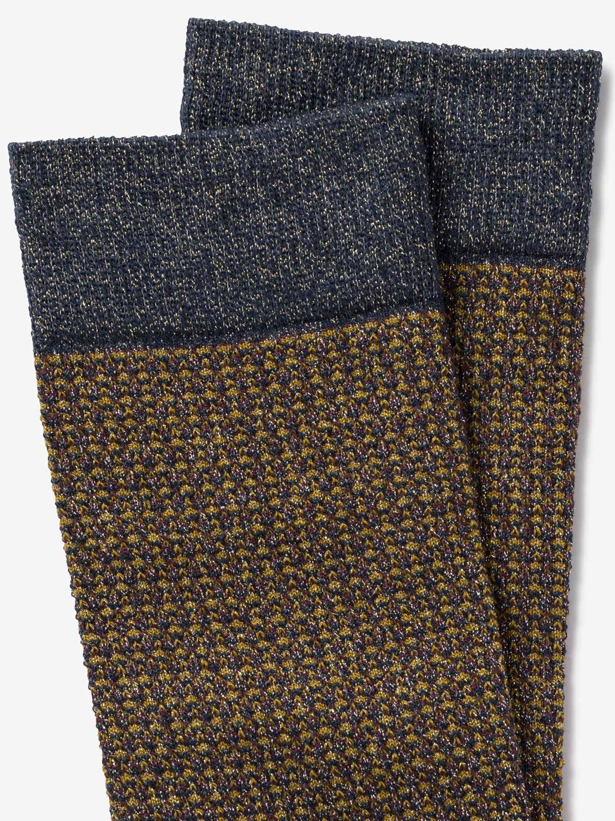 Sokken Honey van Royalties voor dames. Deze mooie paillettensokken in blauw zijn gebreid in een honingraatpatroon met 3 draden. Een spel van glanzende en matte stippen, ideaal voor een stijlvolle touch vol vrouwelijkheid. Combineer ze met mocassins of in je favoriete schoenen. Is one size van 36-41.