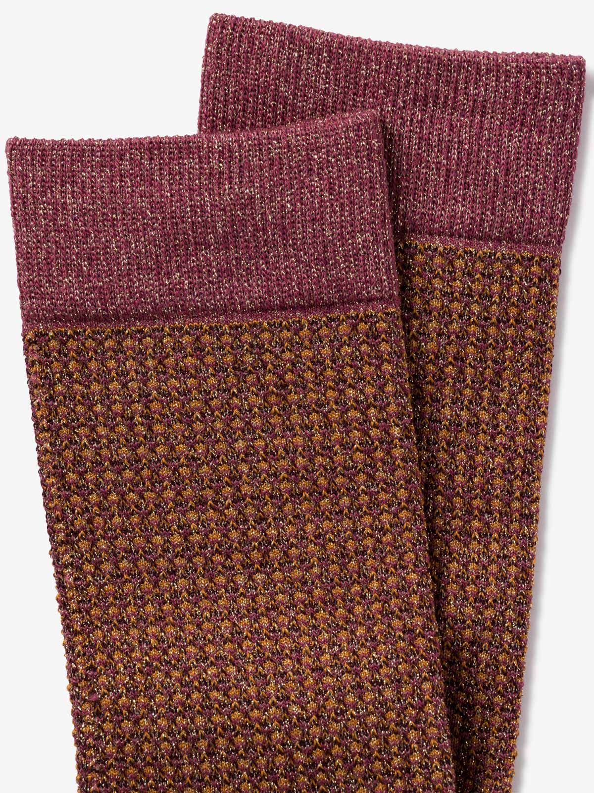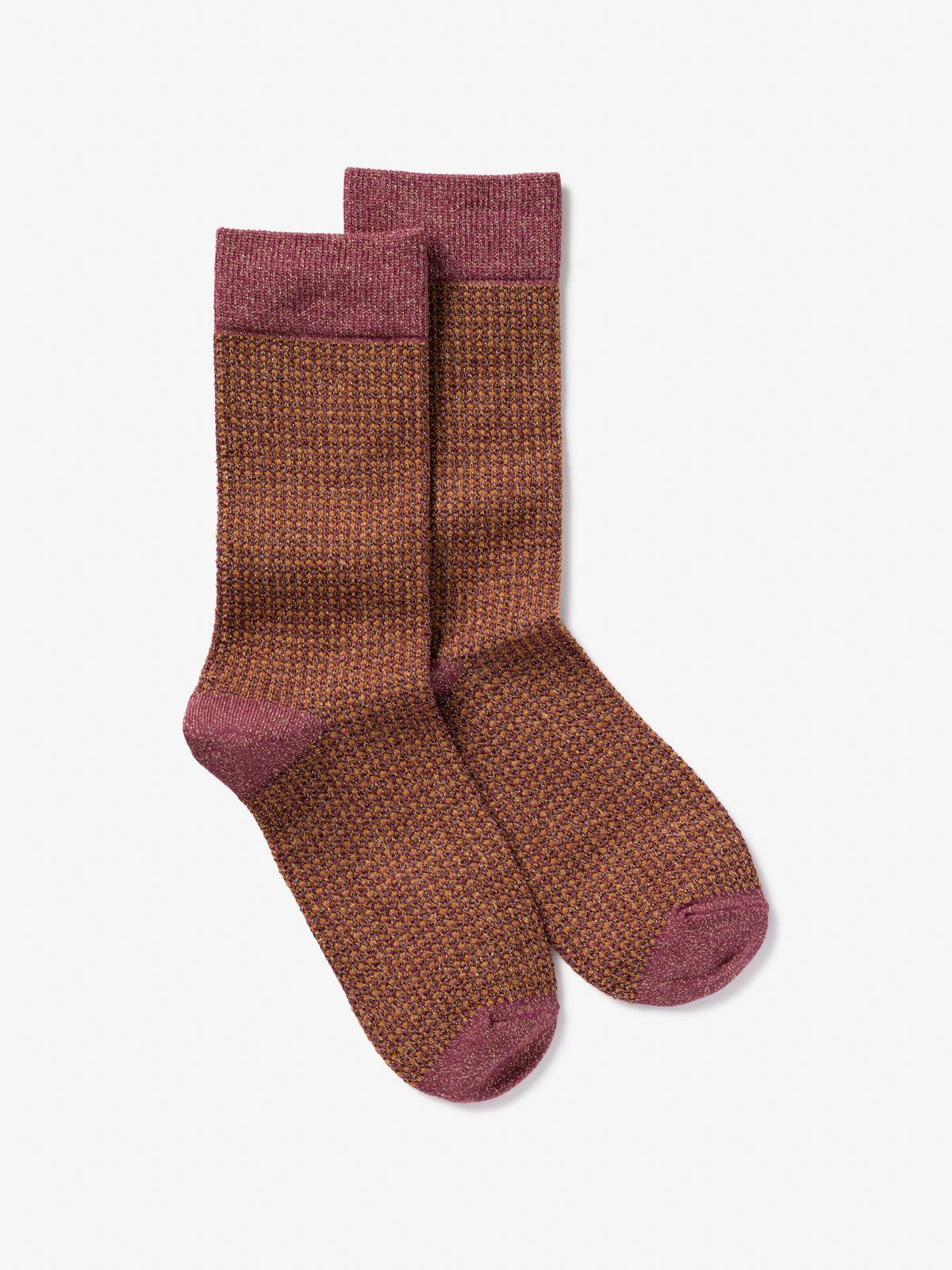 Sokken Honey van Royalties voor dames. Deze mooie paillettensokken in bordeaux zijn gebreid in een honingraatpatroon met 3 draden. Een spel van glanzende en matte stippen, ideaal voor een stijlvolle touch vol vrouwelijkheid. Combineer ze met mocassins of in je favoriete schoenen. Is one size van 36-41.