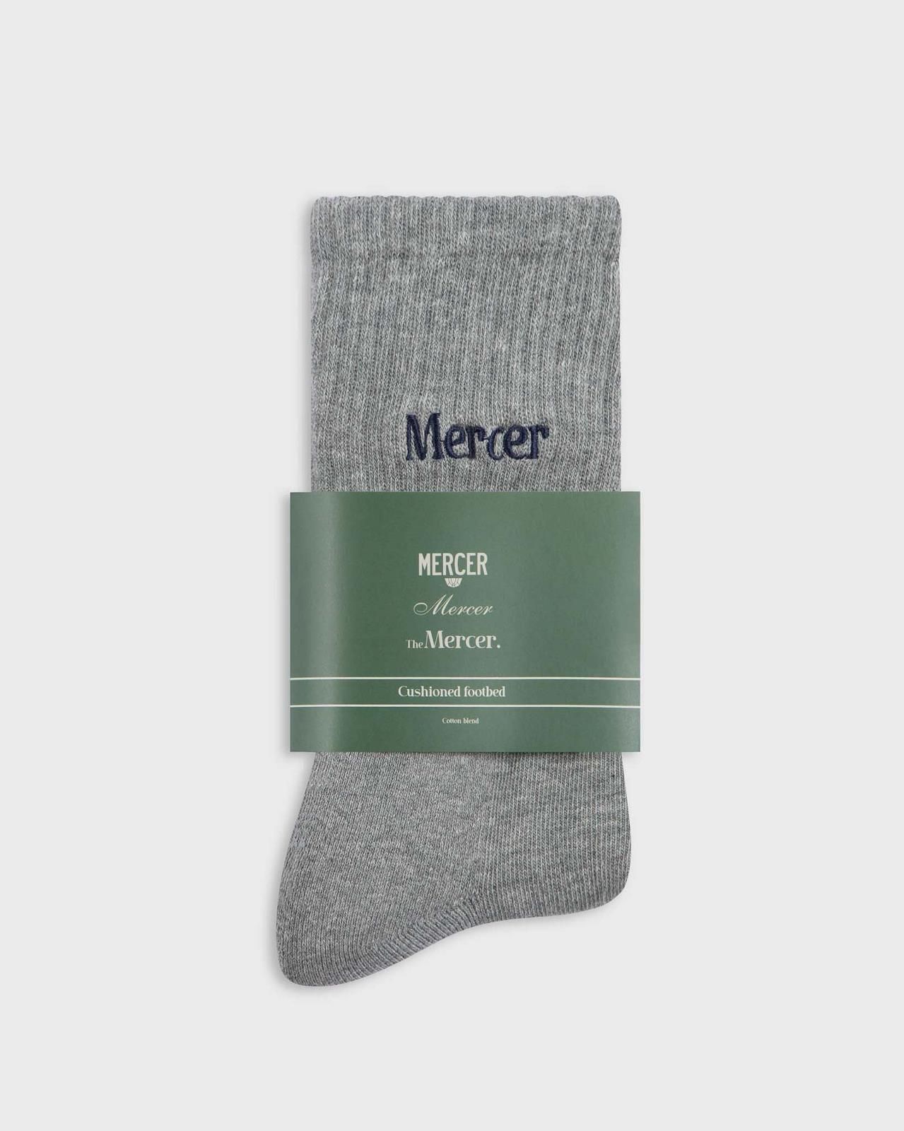 Sokken van Mercer voor heren. Deze grijze crew sokken zijn gemaakt van een premium katoenmix voor een zachte pasvorm. Mooi afgewerkt met het blauw Mercer borduursel.