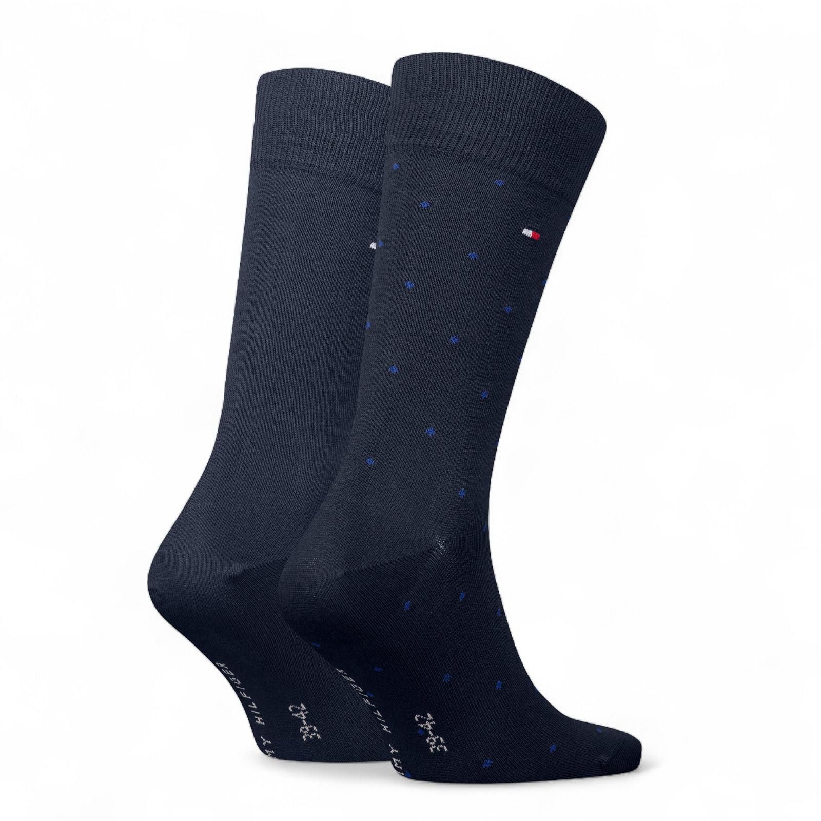 Sokken Dot van Tommy Hilfiger voor heren. Deze geklede sokken zijn vervaardigt uit 75% katoen , 23% Polyamide en 2% Elastaan. Zitten per 2 in een pak waarvan 1 paar effen blauwe sokken en 1paar blauwe met ‘Dot’ bolletjes structuur. Is in 2 maten te verkrijgen.