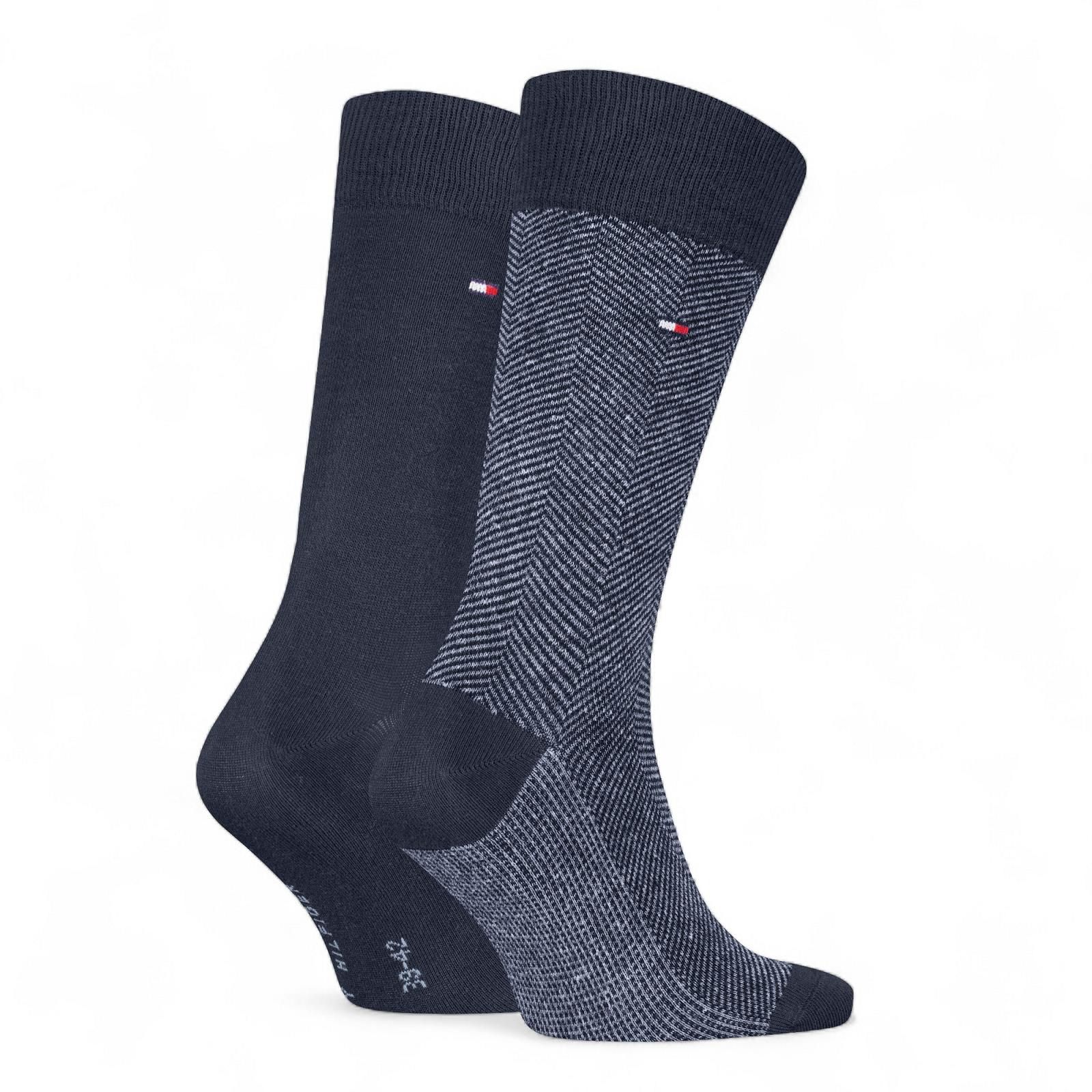 Sokken Nappy Herringbone van Tommy Hilfiger voor heren. Deze geklede sokken zijn vervaardigt uit 67% katoen , 19% Polyamide en 1% Elastaan. Zitten per 2 in een pak waarvan 1 paar effen blauwe sokken en 1paar blauwe in ‘nappy herringbone’ een frisse stijl aan het tijdloze visgraatpatroon. Is in 2 maten te verkrijgen.