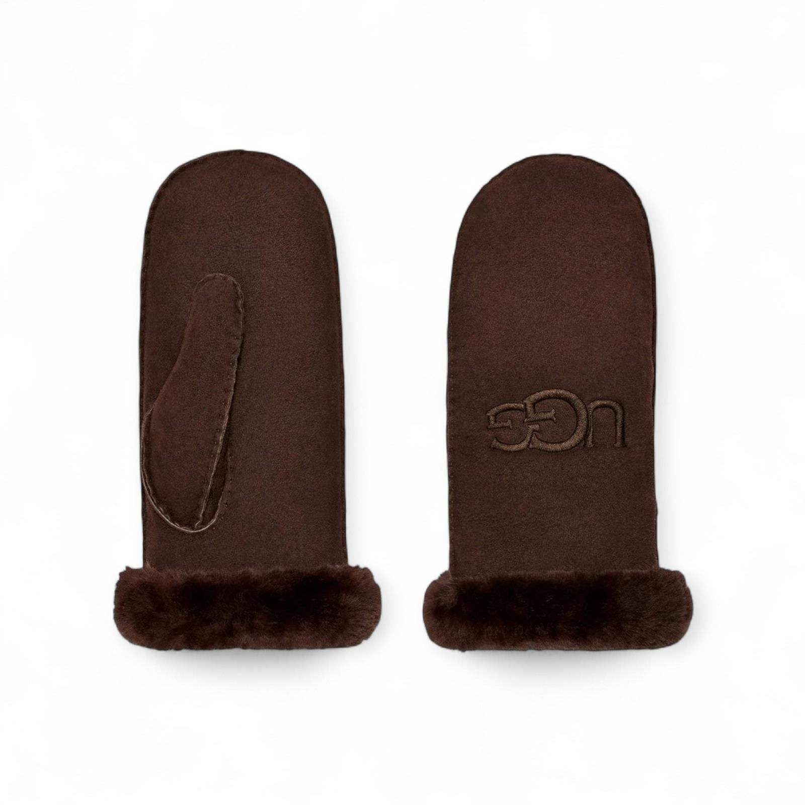 Handschoen Sheepskin Embroidered Mid van UGG voor dames. Deze wanten zijn gemaakt van bruin leer en waterafstotende schapenvacht. Houdt je handen het hele seizoen warm en comfortabel door het wol binnenin. Is afgewerkt met geborduurd UGG logo. Combineer ze met de toffe enkellaarzen, sjaal en muts van UGG.
