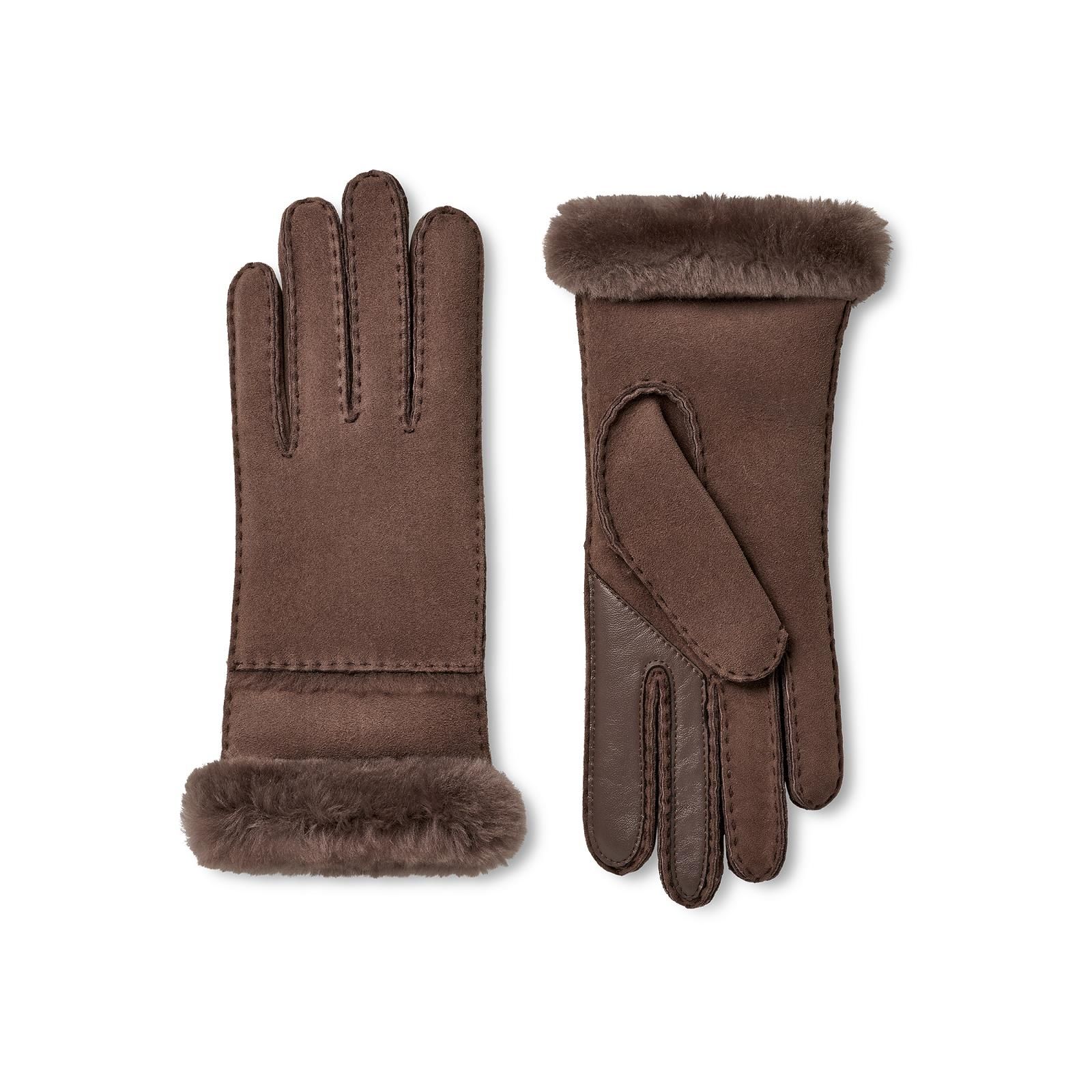 Handschoen Sheepskin Seamed Glove van Ugg voor dames. Deze handschoenen zijn gemaakt in bruin suède mooi afgewerkt met wol en tot aan de pols. Houdt je handen het hele seizoen warm en comfortabel door het wol binnenin. Is voorzien van een geleidende leren patch op de handpalm voor probleemloos smartphone gebruik. Bestaat in 2 maten: