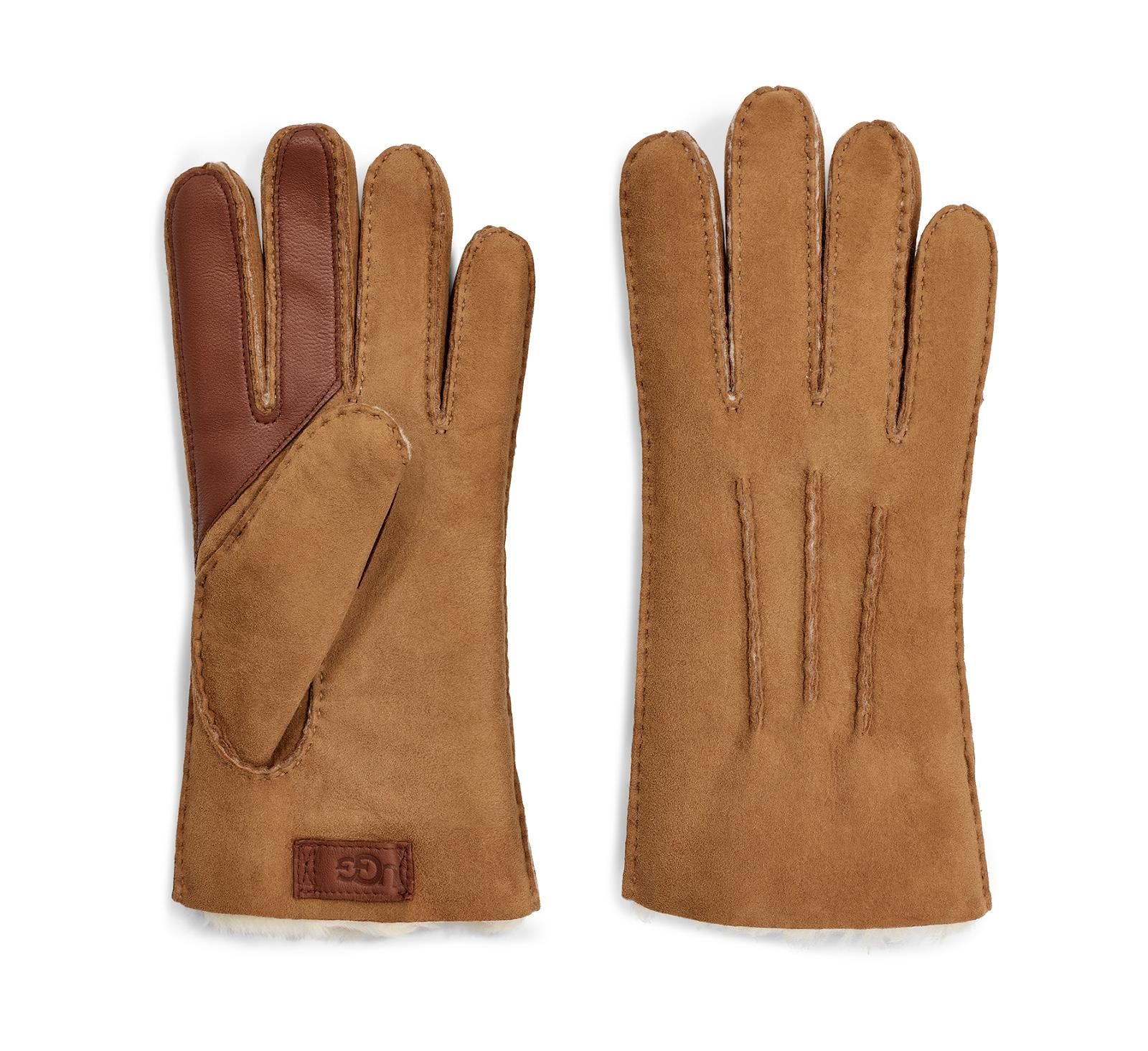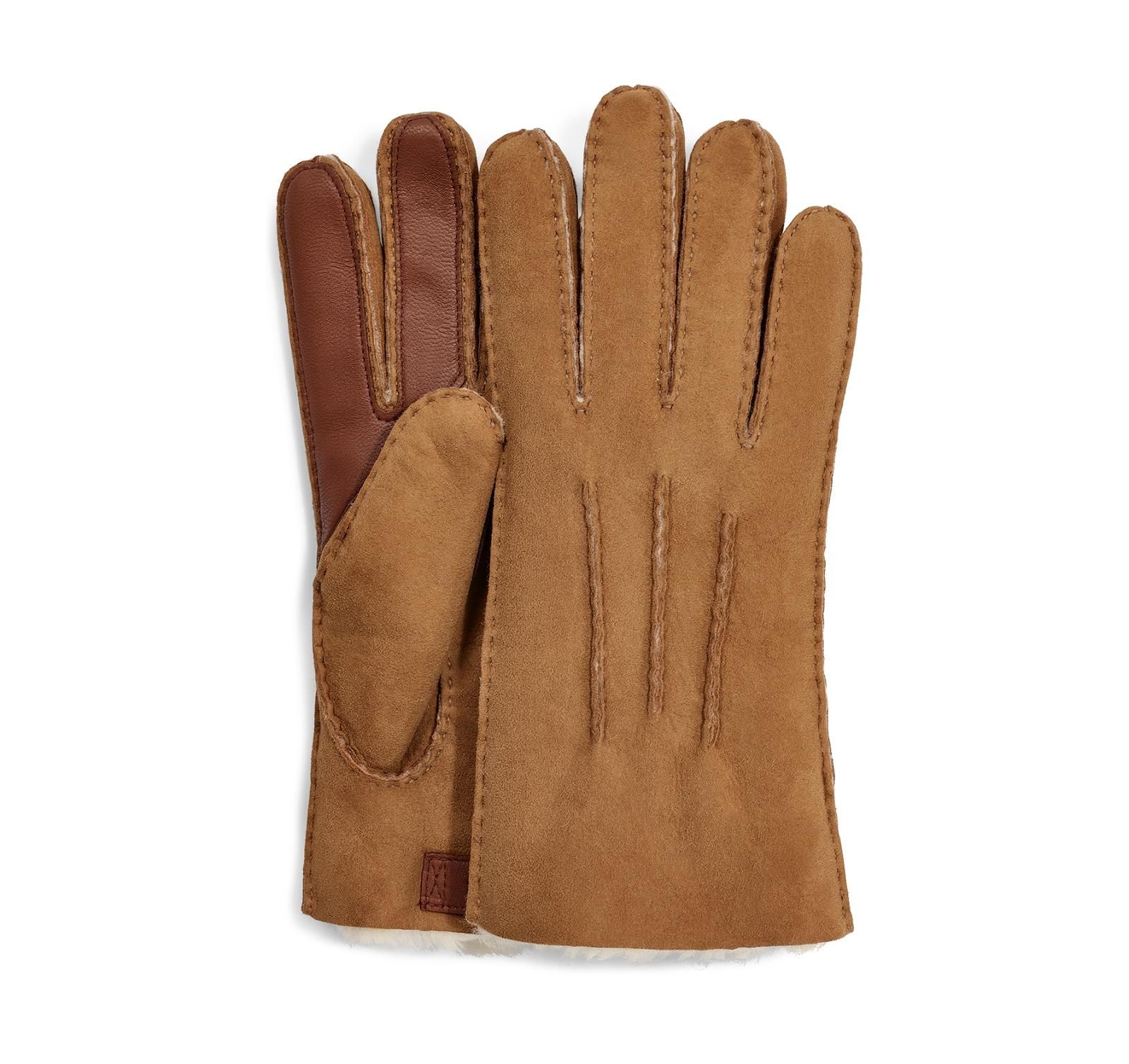 Handschoen Sheepskin Tech Glove van UGG voor heren. Deze handschoen is in cognac suède met mooi stiksel op de bovenkant. Is voorzien van een geleidende leren patch op de handpalm voor probleemloos smartphone gebruik. Bestaat in 2 maten: Medium en Large