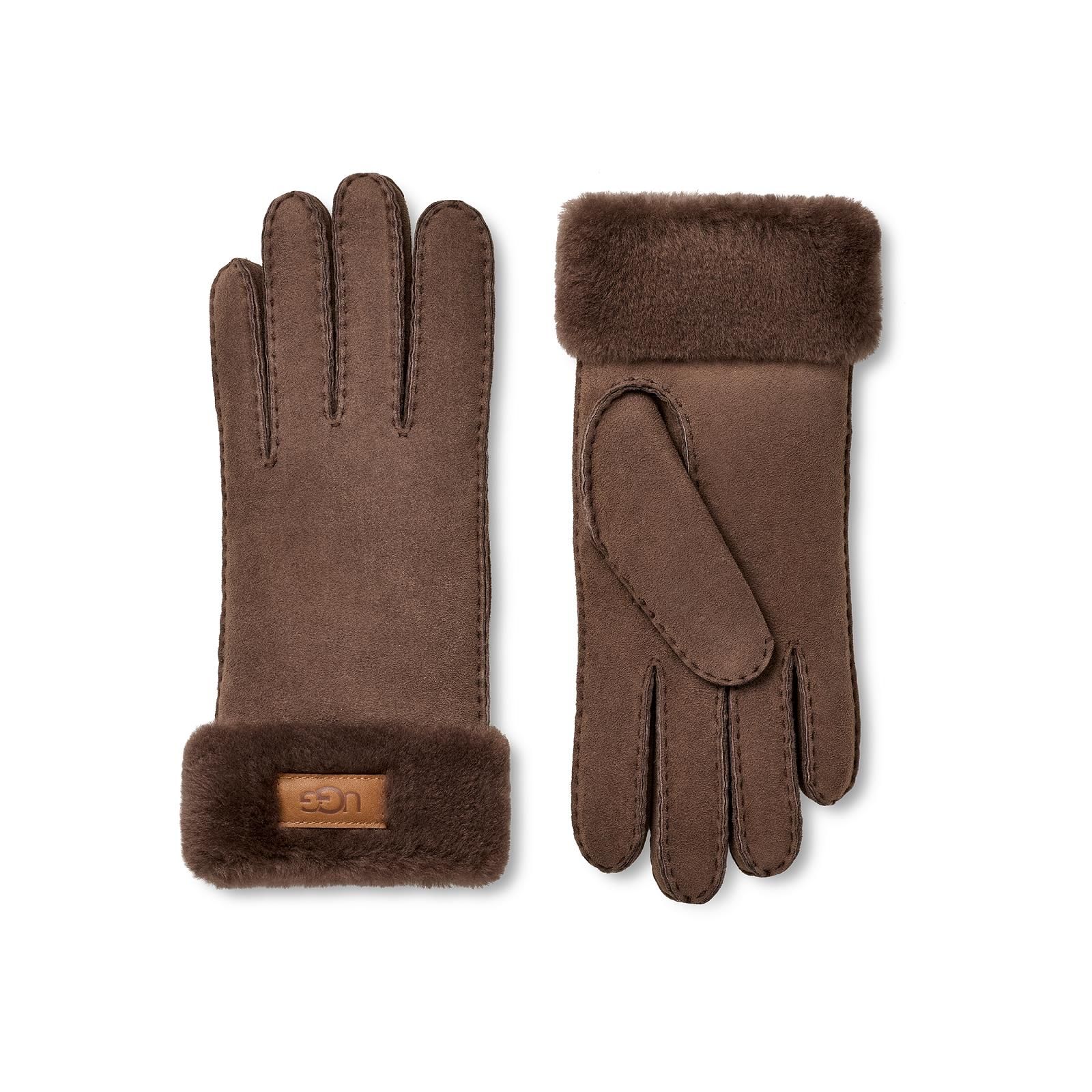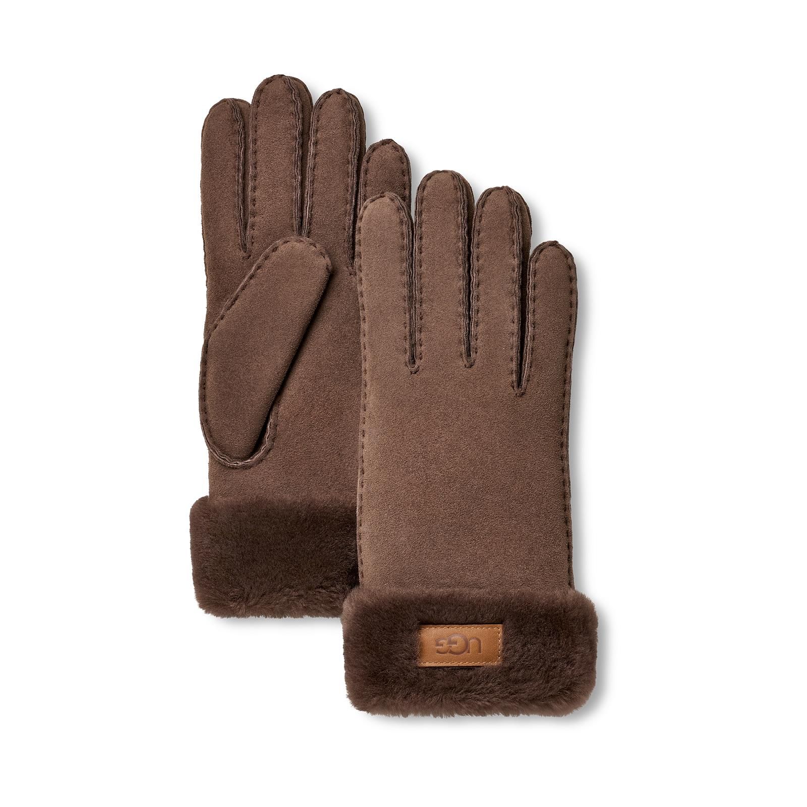 Handschoen Turn Cuff Glove van UGG voor dames. Deze handschoen is gemaakt van lichtbruin suède leer en waterafstotende schapenvacht tot aan de pols. Houdt je handen het hele seizoen warm en comfortabel door het wol binnenin. Combineer ze met de toffe enkellaarzen, sjaal en muts van UGG