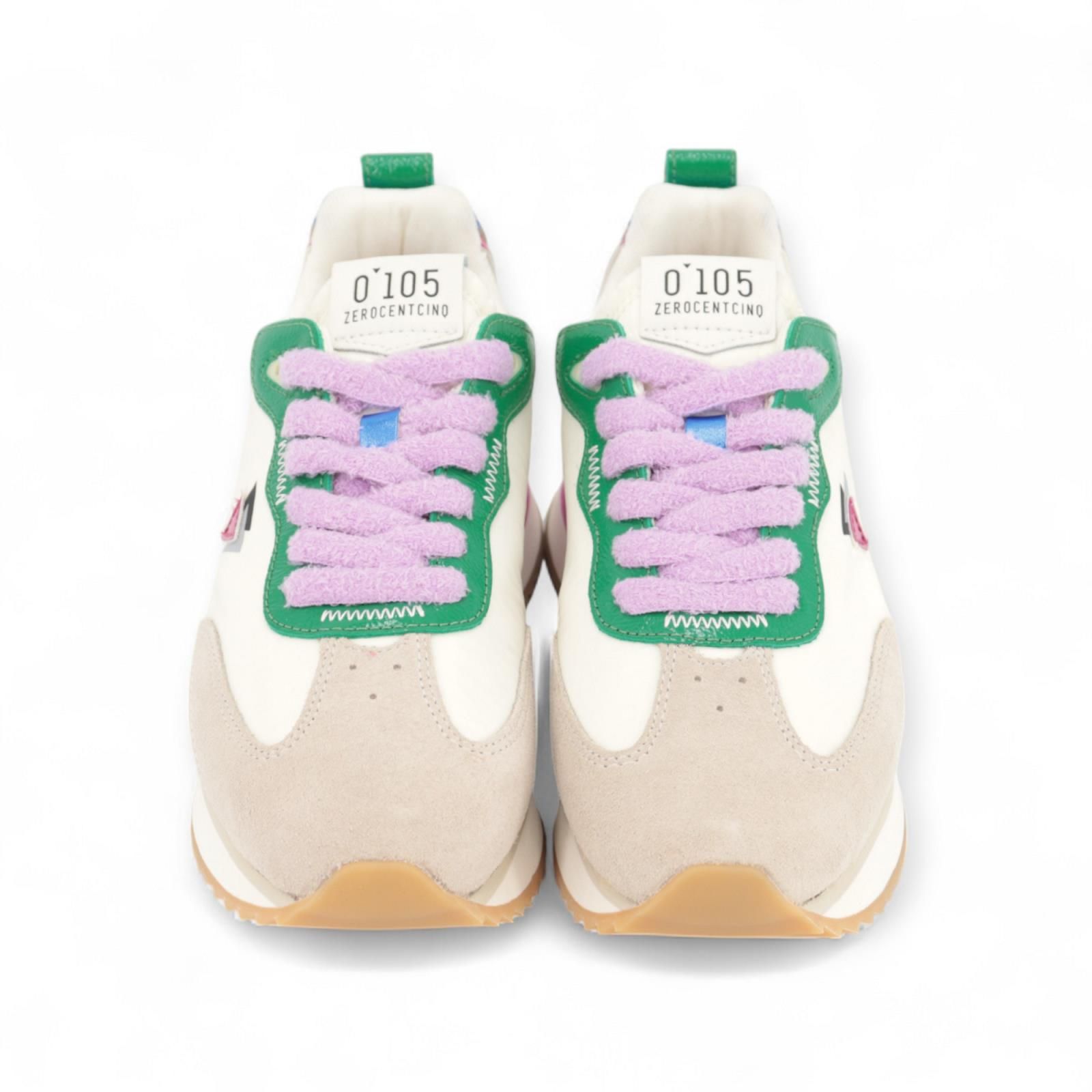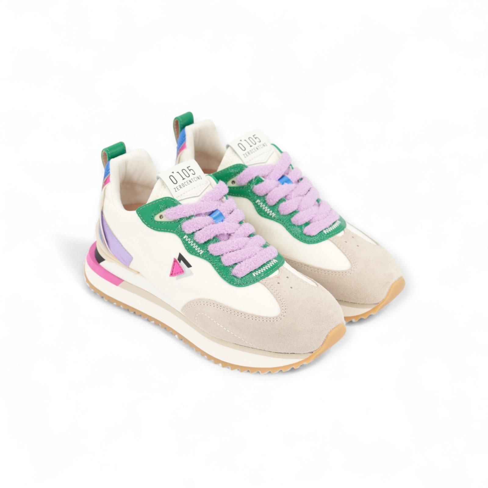 Lenox Rink sneaker van 0’105 voor dames. Deze gewaagde runner combineert lakgroen, metallic paars, elektrisch blauw en warm roze leer, waardoor een visuele harmonie ontstaat die even energiek als evenwichtig is. De witte nylon basis zorgt voor contrast, waardoor deze unieke kleurencombinatie opvalt. Extra paarse veters meegeleverd. De binnenzool is uitneembaar.