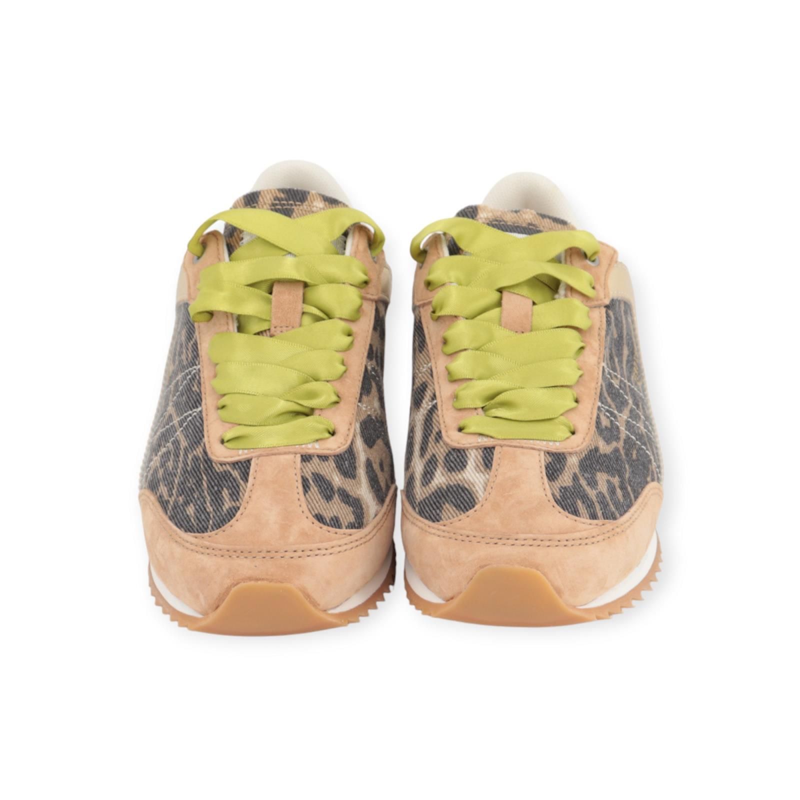 Sneaker Lina Leo van 0’105 voor dames. Deze sneaker is in denim leopard versterkt met beige suède stukken. De gouden metallic accenten aan de zijkanten zijn mooi afgewerkt met gekartelde randen en zorgen voor extra vorm aan deze toffe sneaker. De kenmerkende zool met een bruin, wit en blauw is zowel licht als comfortabel, de binnenzool is uitneembaar. Geleverd met 2 paar veters: 1 paar satijn groene en 1 paar beige.