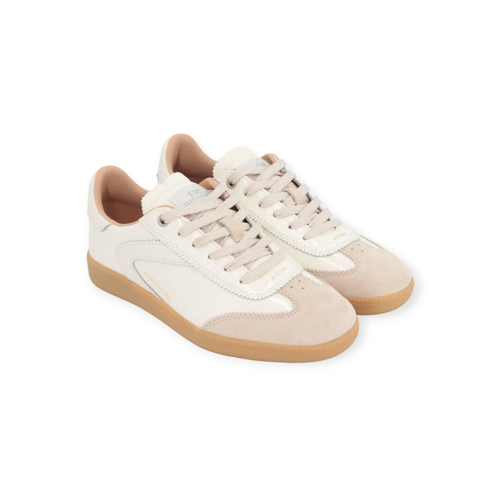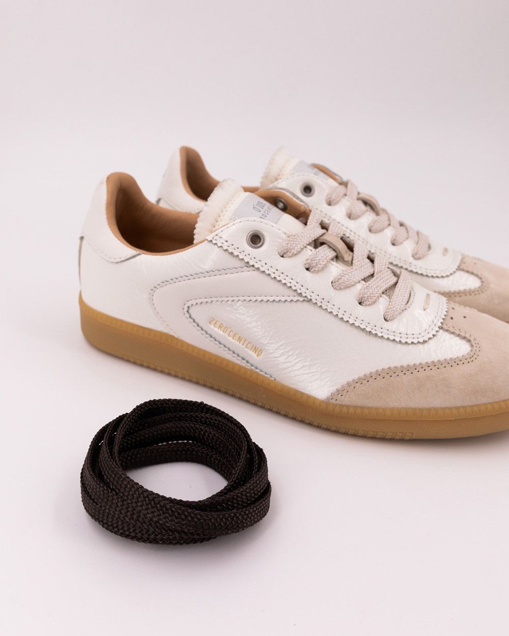 Sneaker Nova Pure Polish van 0’105 voor dames. Deze lage sneaker is in off wit lakleer en beige suède. Is mooi afgewerkt met gekartelde randen. De lage gummyzool is zowel licht als comfortabel en absoluut modieus. De binnenzool is uitneembaar. Geleverd met 2 paar veters: 1 paar shining witgoud en 1 paar bruine.