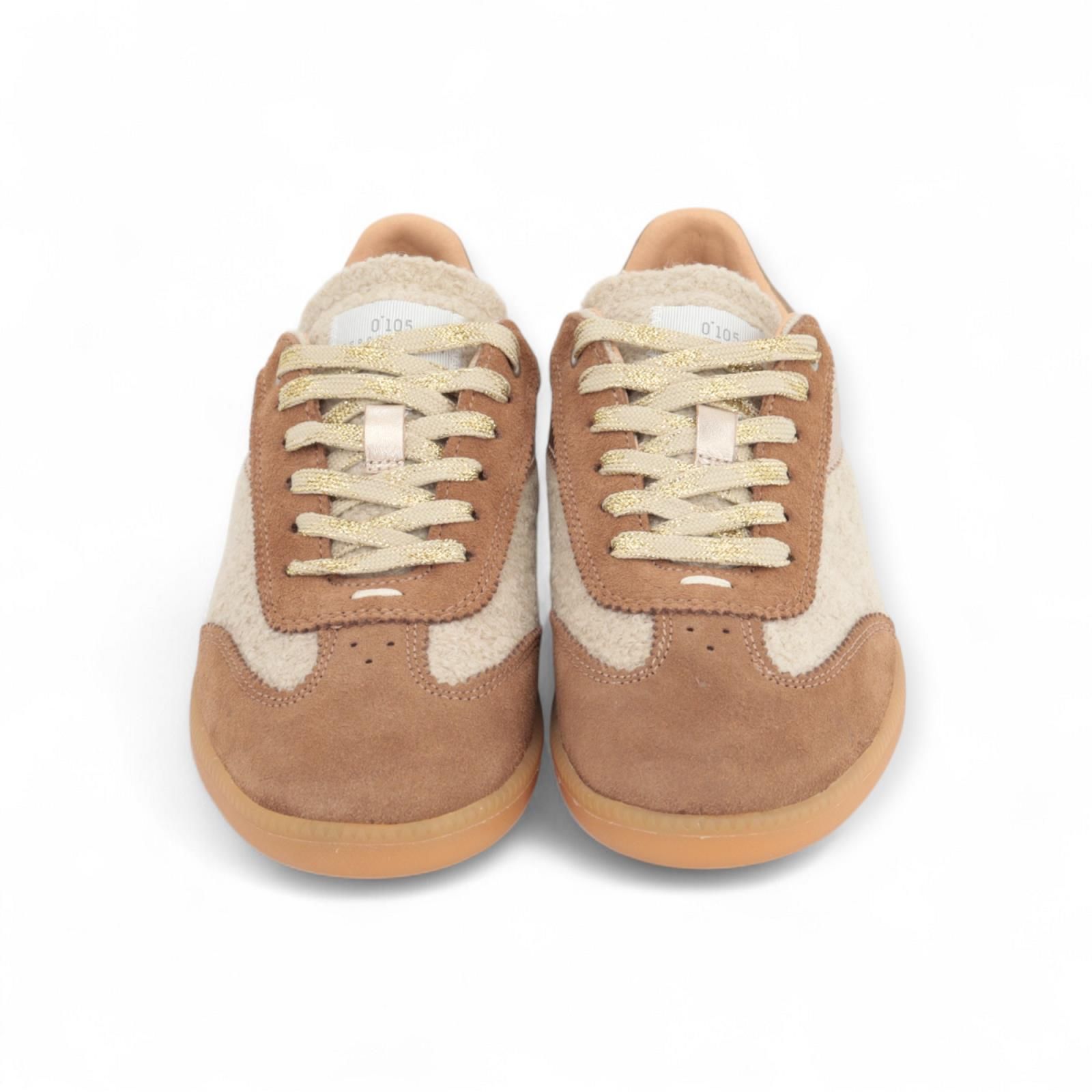 Sneaker Nova Sheep van 0’105 voor dames. Deze sneaker is de perfecte balans tussen comfort en stijl. Het wollen materiaal geeft een warme touch en valt op door de gouden leren details en glinsterende veters. De voorkant en rond de veters is in camel suède. Is op een aangename bruine gummy zool en de binnenzool is uitneeembaar. Heeft nog een extra paar beige veters.
