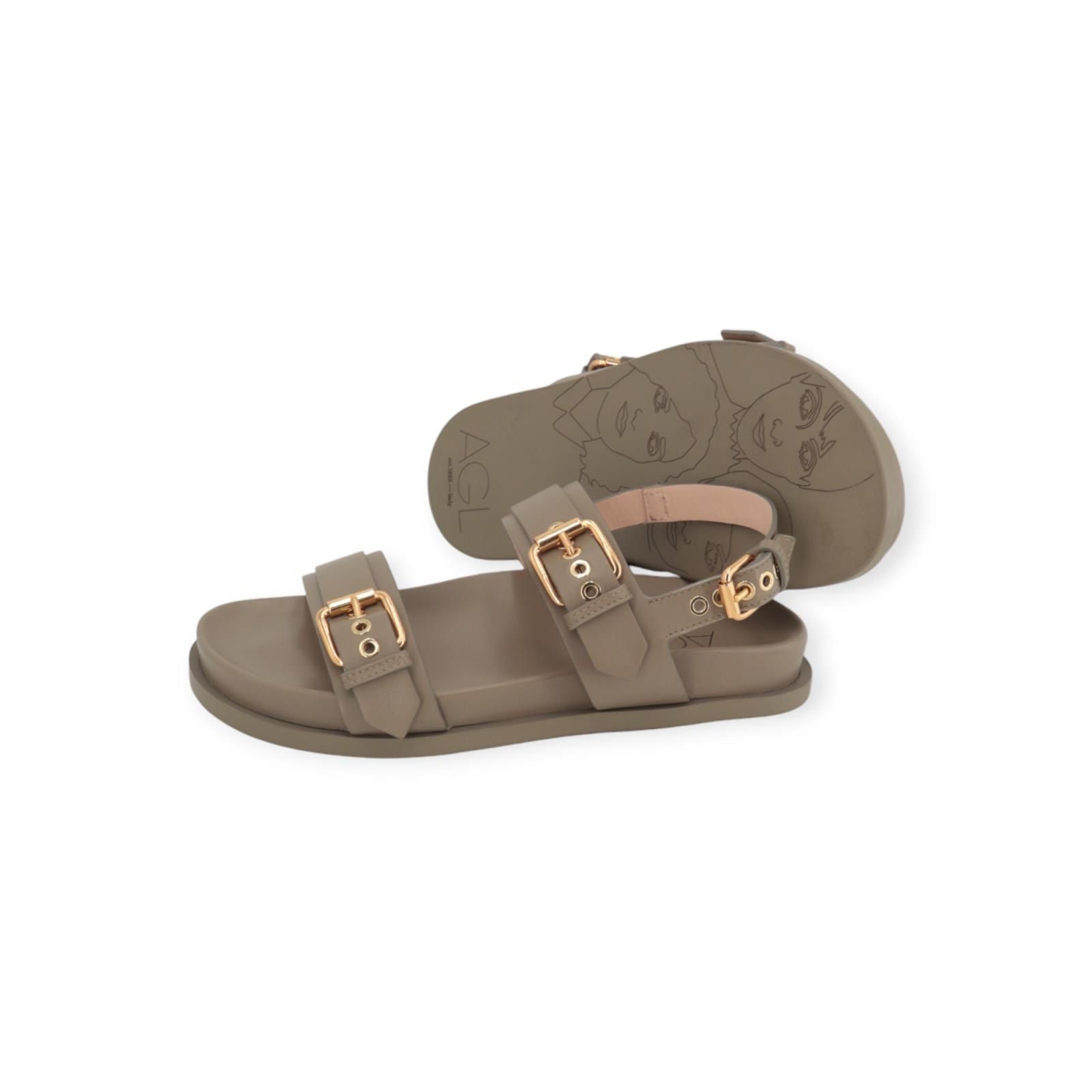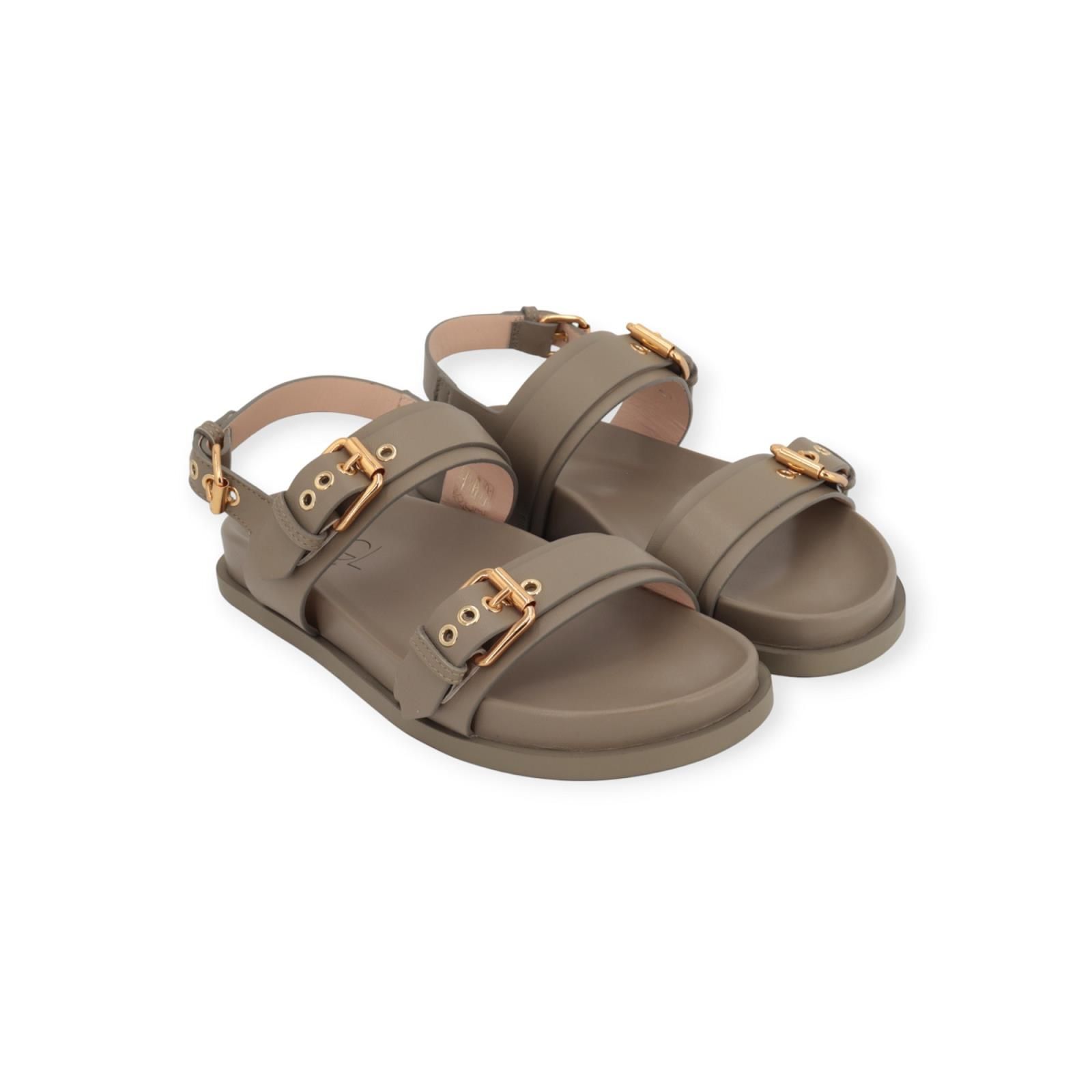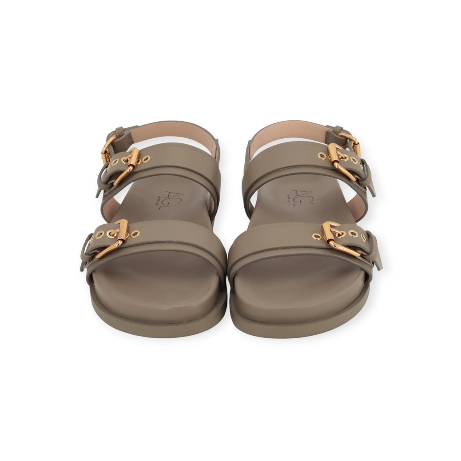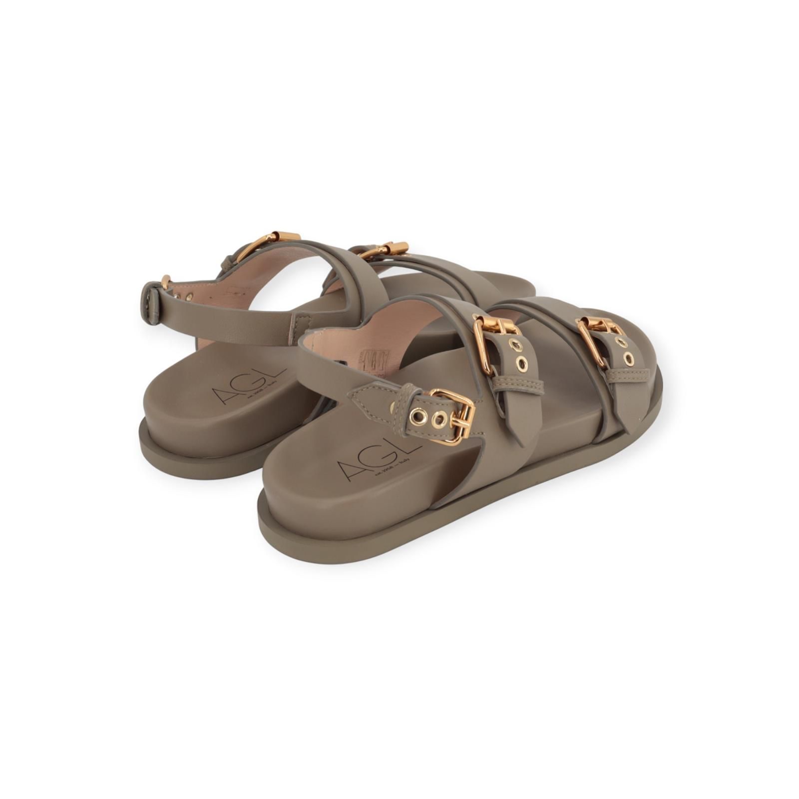 Sandaal Cristina van AGL voor dames in groen (safari kleur). Deze sandaal is volledig in leer. Heeft 2 bandjes over de wreef en een bandje rond de enkel. Afgewerkt met gouden gespsluitingen en verfijnde oogjes die het model een elegante uitstraling geven. Is op een aangenaam voetbed waar je mooi vast inzit.