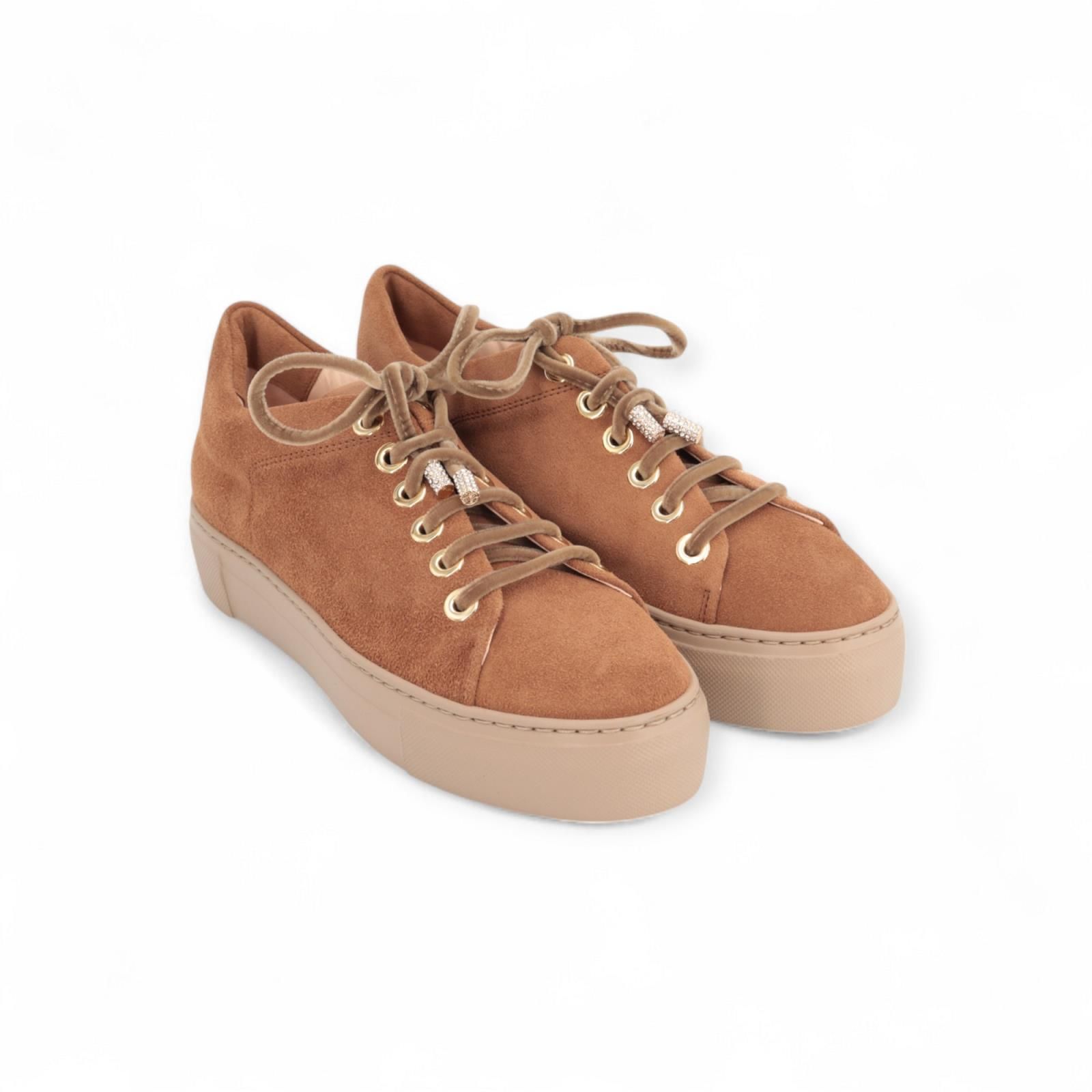 Sneaker Crystal New van AGL voor dames. Deze sneaker is in cognac suède en is zeer elegant door zijn minimalistisch ontwerp. Mooi afgewerkt met een elegante veter met kristallen op de veterpunten en een speelse sprankeling. Is op een plateauzool en de binnenzool is uitneembaar. De binnenzool uitneembaar.
