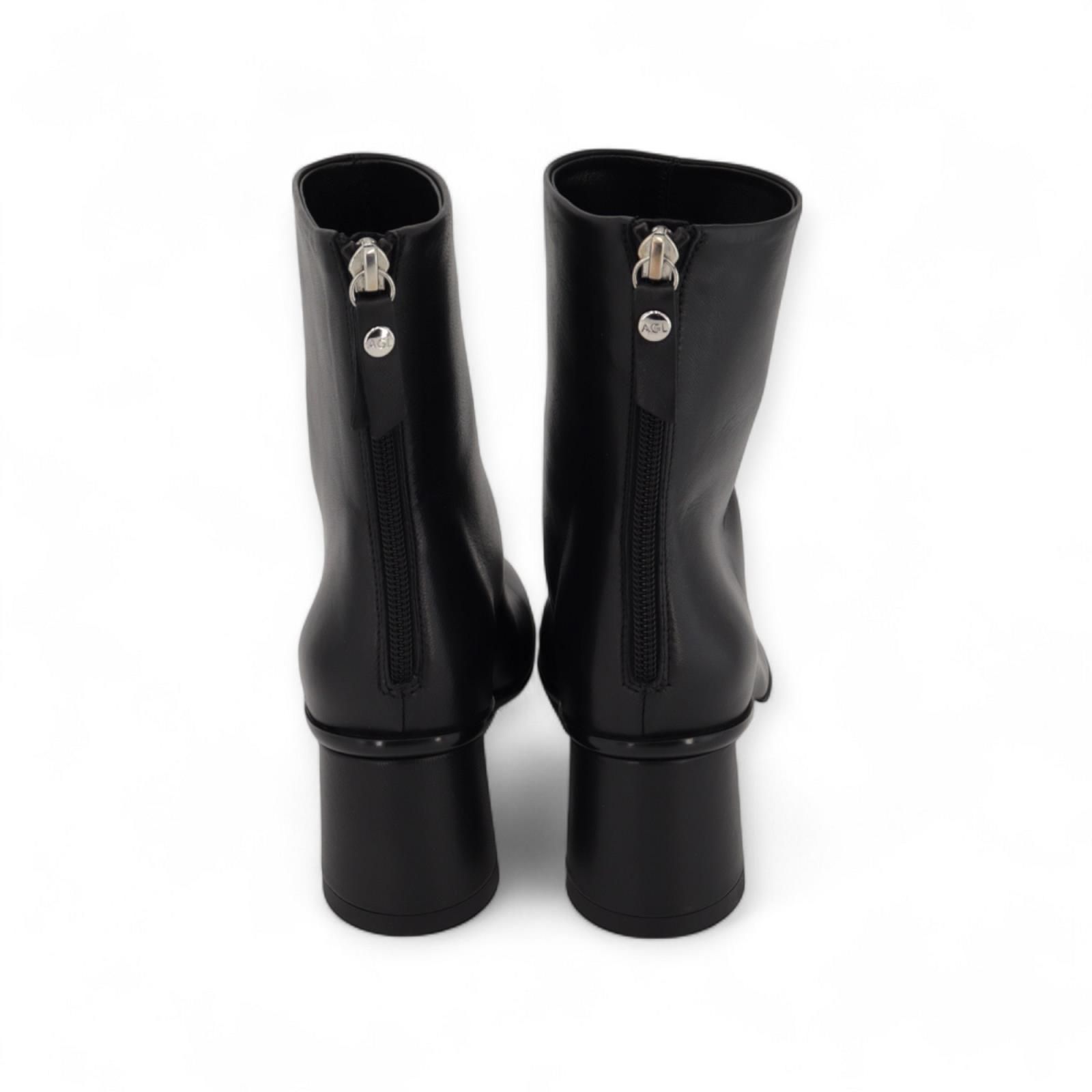 Enkellaars Curvy Bootie van AGL voor dames. Deze prachtige enkellaars is in zwart zacht leer. Heeft ronde vormen en is snel aan te trekken dankzij de praktische rits aan de achterkant. Heeft een cilindrische hak van 5cm hoog. De rubberen zool op dit elegant model zorgt voor nog meer comfort.