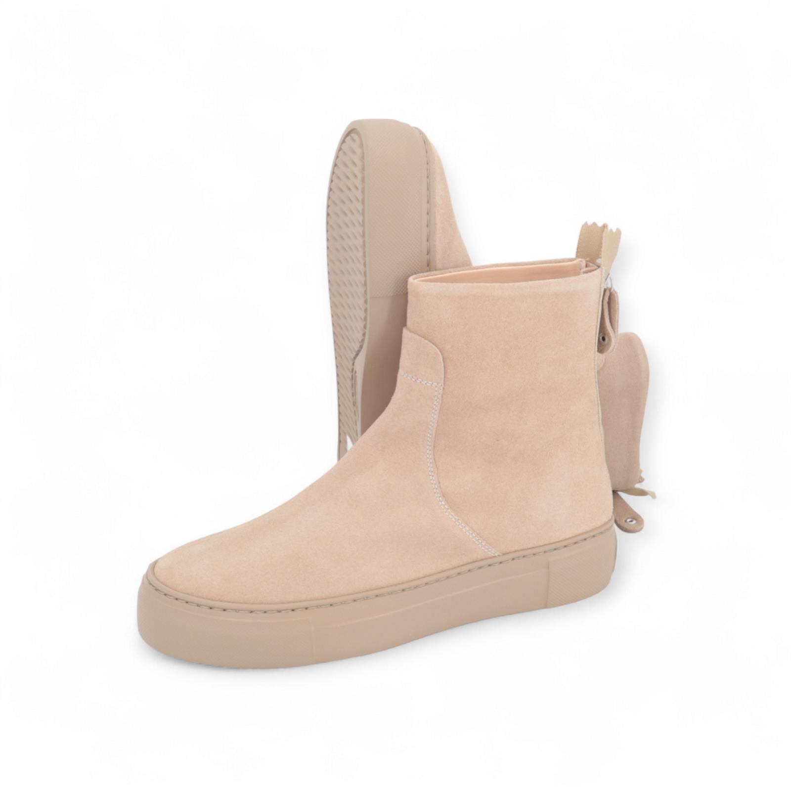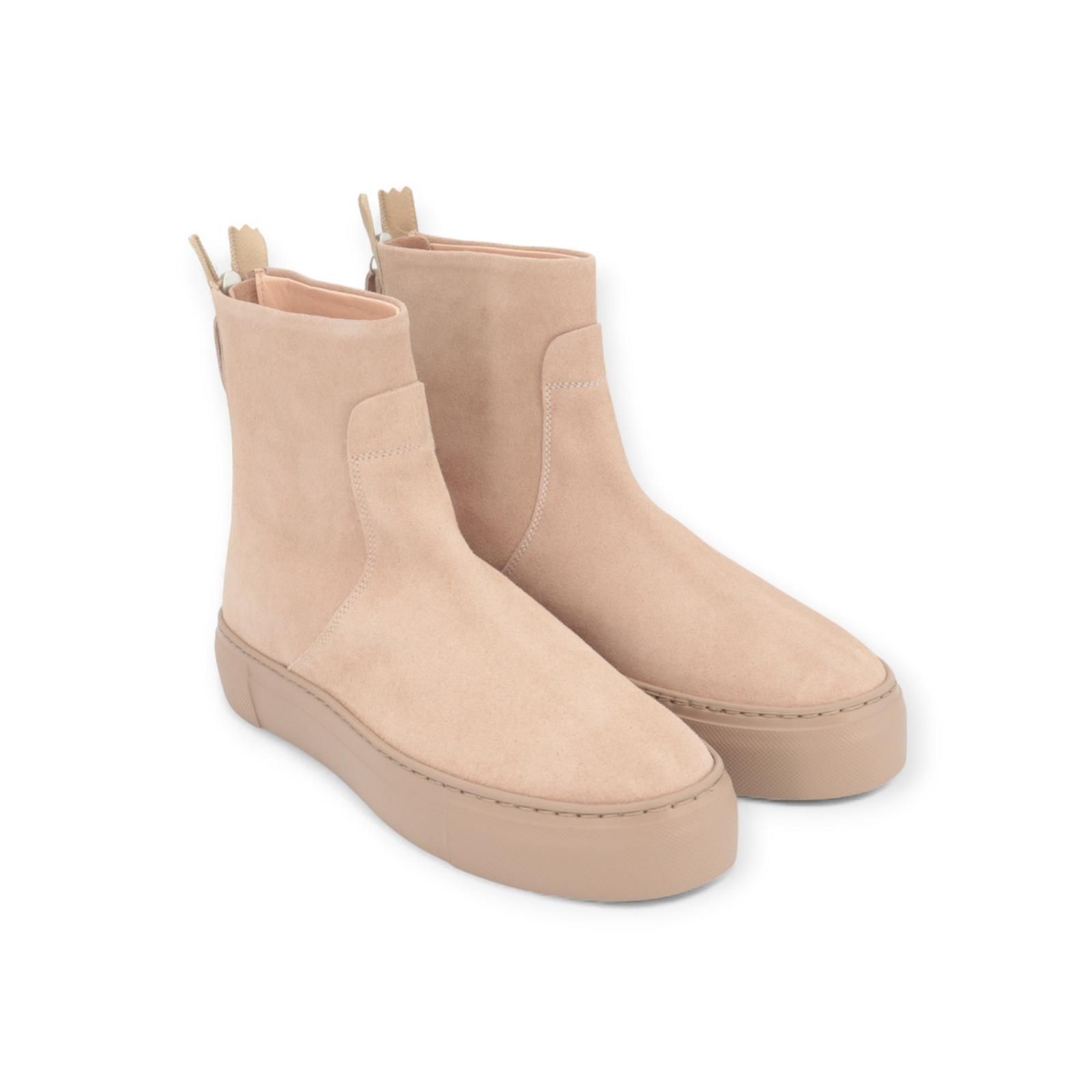 Enkellaars Meghan van AGL voor dames. Deze enkellaars is in zacht nude suède. Heeft een sportieve look en is snel aan te trekken dankzij de rits bij de hiel. De lijnen zijn eenvoudig en de plateauzool is in glad nude kleur. Deze iconische creatie van AGL behoudt de liefde tussen sneakers en enkellaarsje. De binnenzool is uitneembaar.