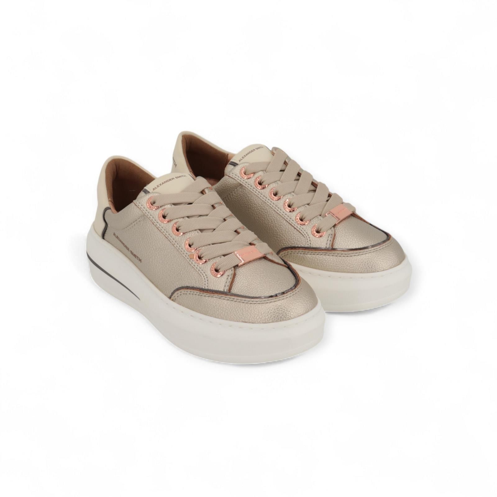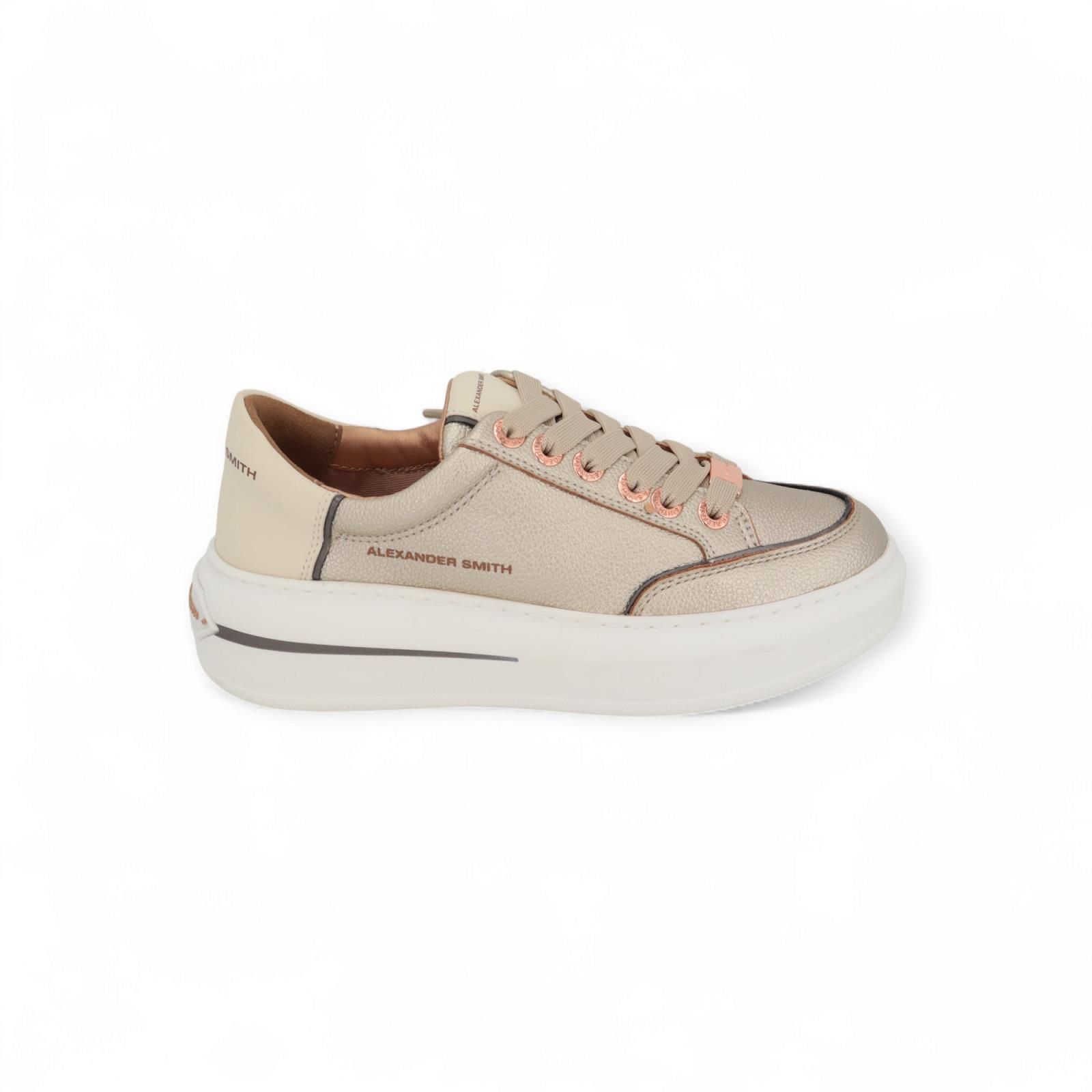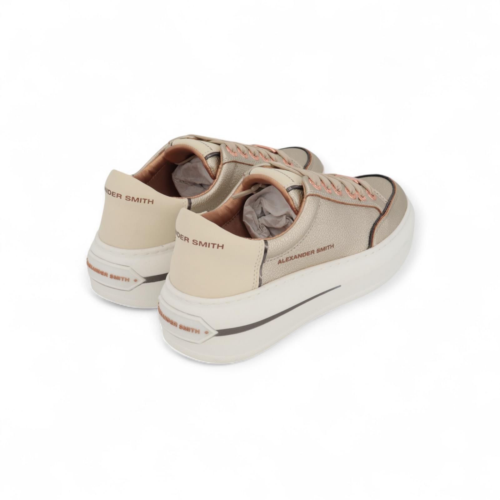 Sneaker Lancaster van Alexander Smith voor dames. Deze sneaker is in goud shining leer met een beige hiel. Is mooi afgewerkt met verfijnde details. Is op een plateauzool met een uitneembare binnenzool. Dit model combineert stijl en elegantie door zijn uniekheid.