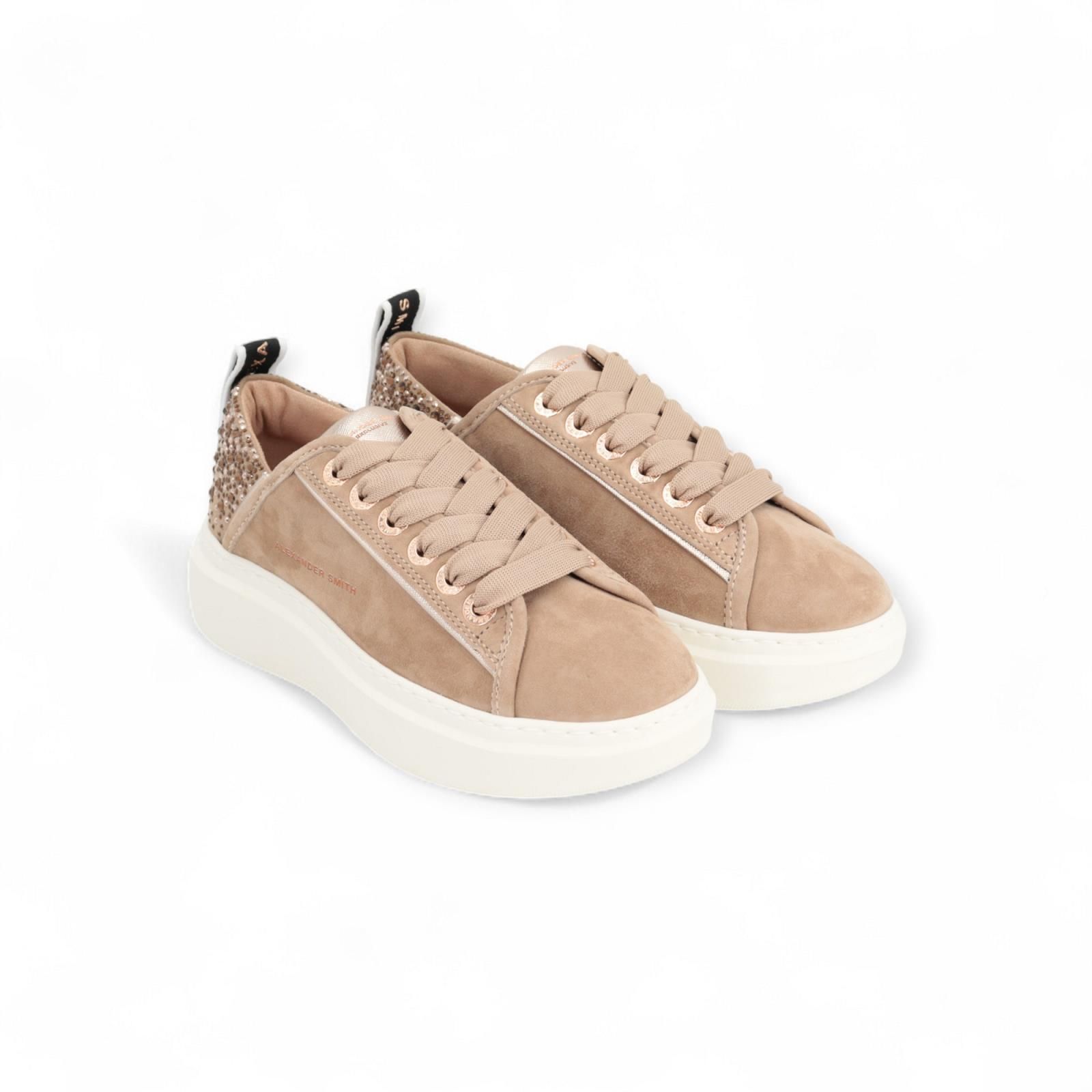 De Wembley dames sneaker van Alexander Smith. Is prachtig afgewerkt op een dikke zool in leder in het wit met camel suède en stenen achteraan. Heeft beige satijnen veter die het model gekleder maakt. Straal als nooit tevoren met deze Alexander Smith. De binnenzool is uitneembaar.