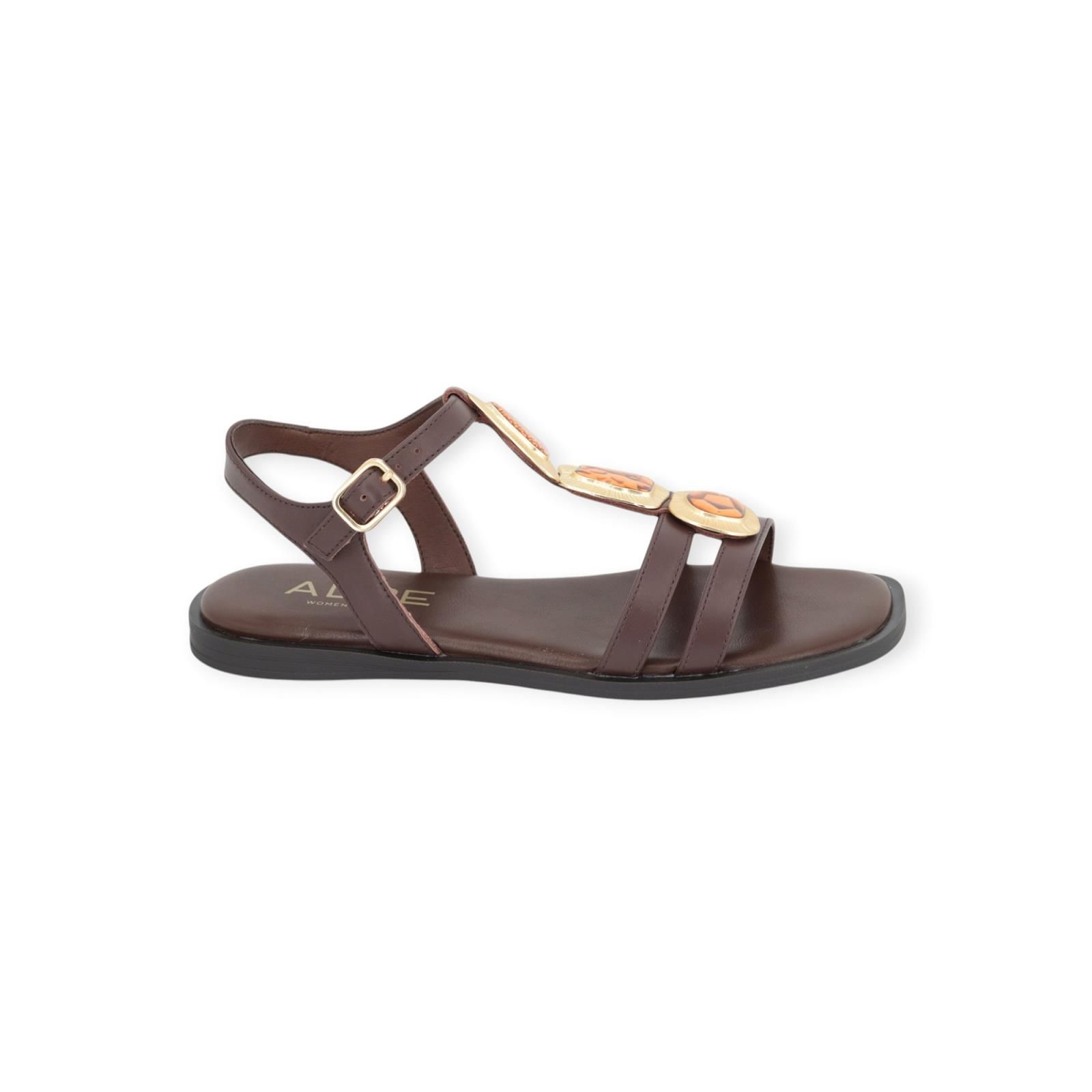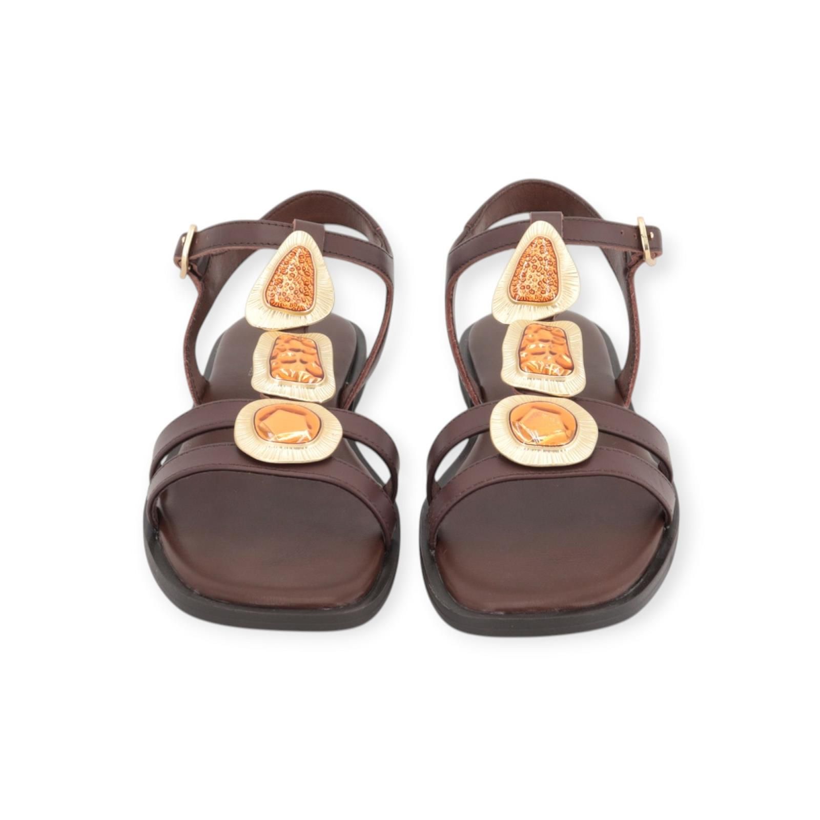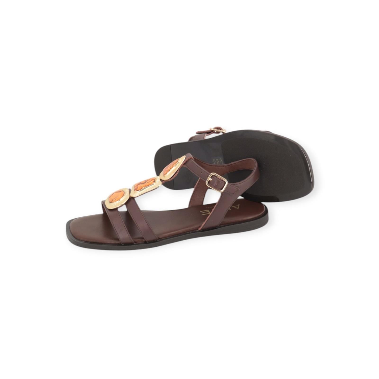 Sandaal 5594 van ALPE voor dames. Deze sandaal is in bruin leer in T-vorm. Is mooi afgewerkt met gouden studs en oranje stenen. Heeft een bandje rond de enkel met een gouden gespsluiting. Heeft een lichte carré top met een donkere antislipzool.