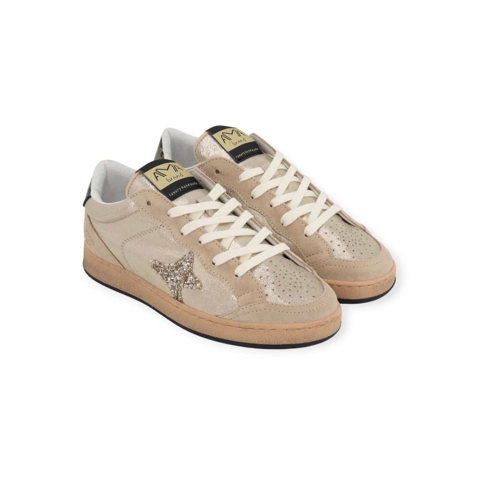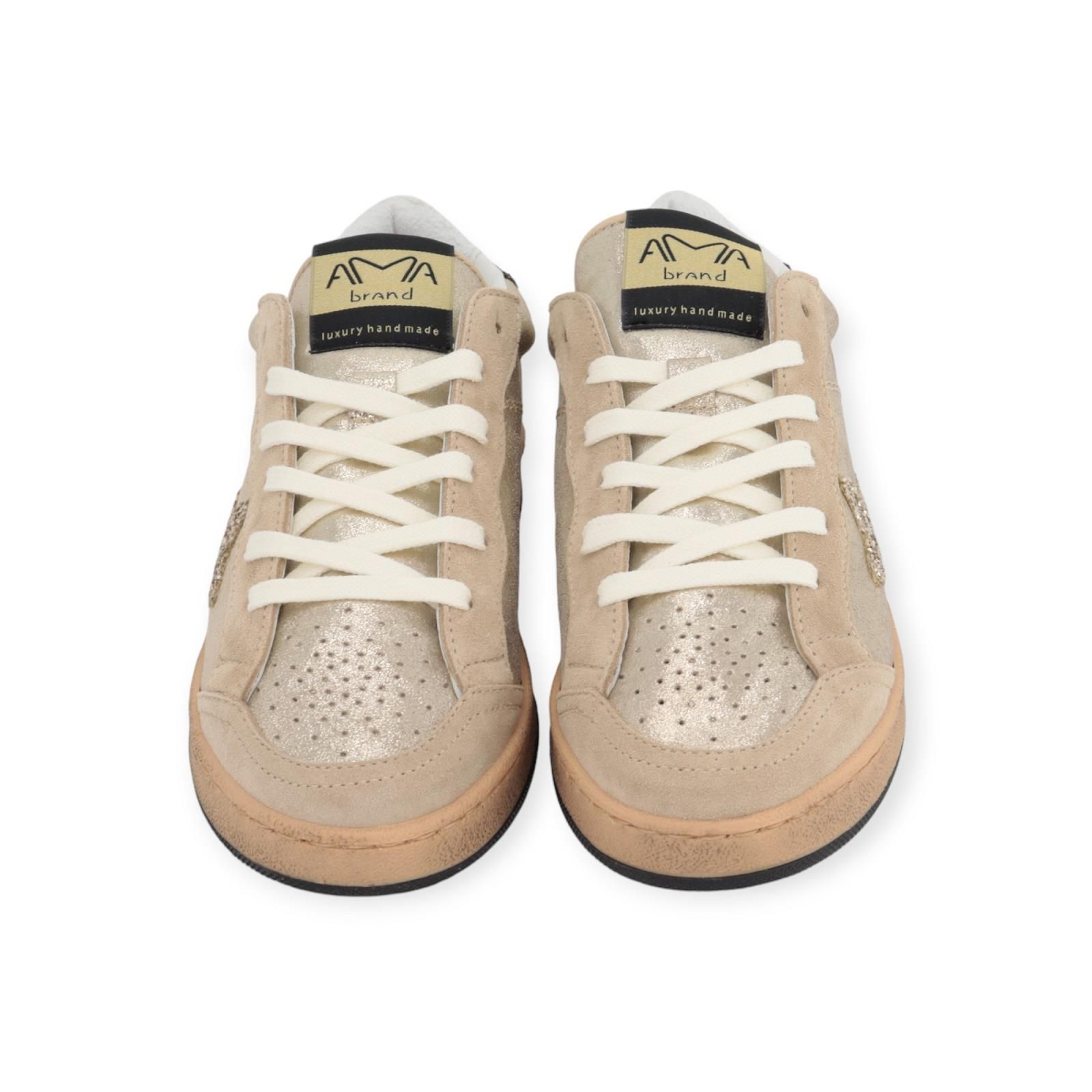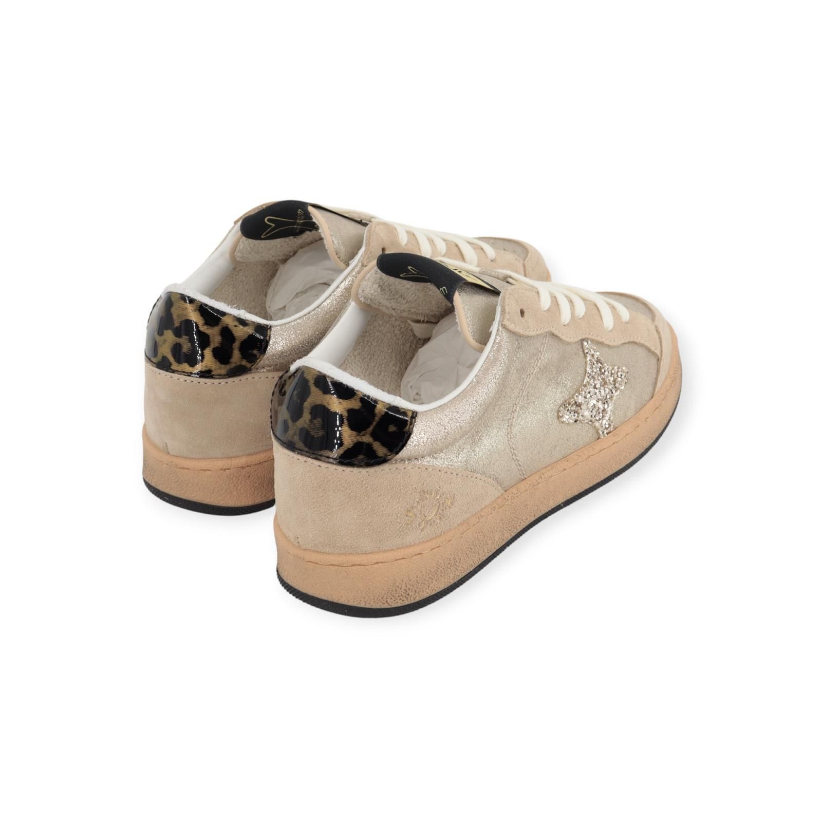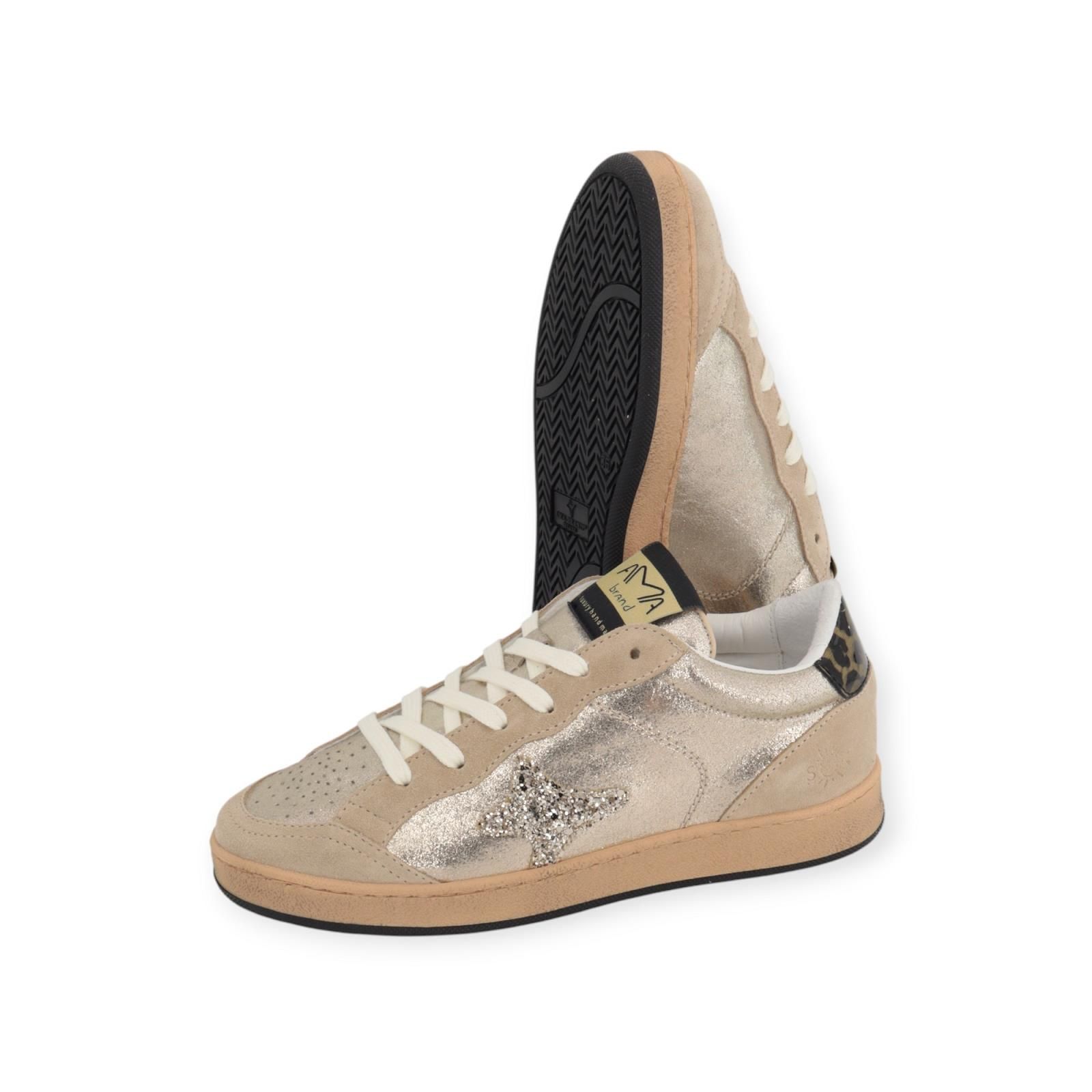 Sneaker Sun 4556 van Ama Brand voor dames. Deze sneaker is in goud shining leer met een geperforeerde neus en beige suède langs de veters en voorkant. Heeft een leopard lak hielflap. Is afgewerkt met Ama Brand logo in gouden pailletjes aan de zijkant. Is op een vintage gele waxed sneakerzool met uitneembare binnenzool.