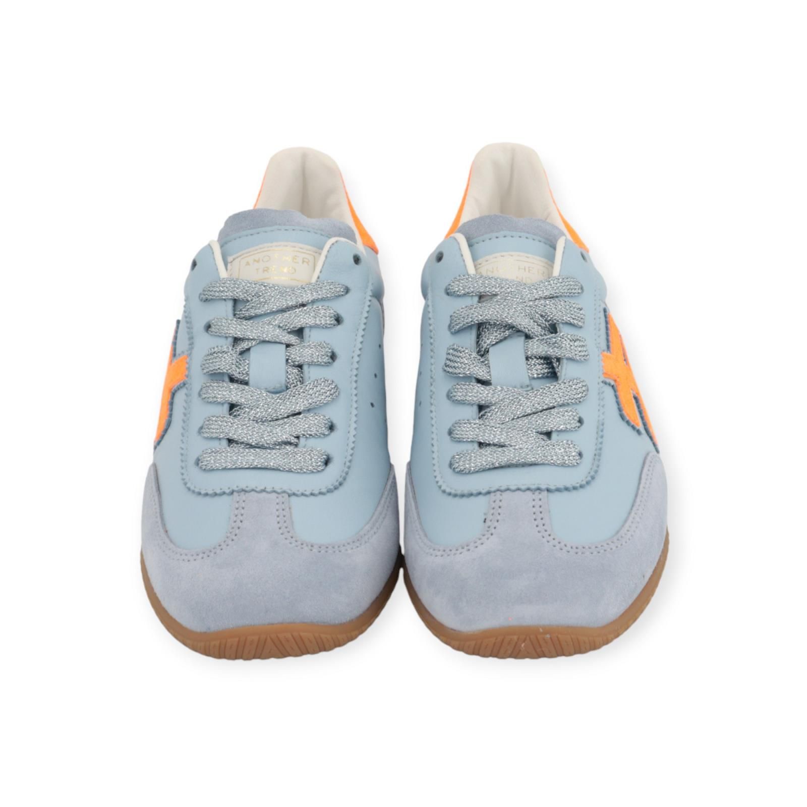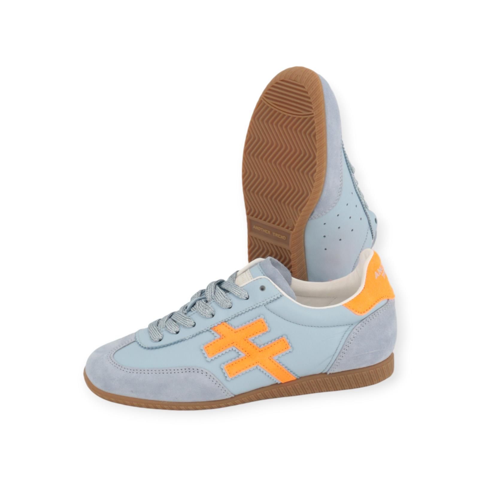 Sneaker A078 van Another Trend voor dames. Deze lage sneaker is een echte eye catcher met zijn prachtige kleuren! De suède is in lichtblauw ‘sky’ en is licht geperforeerd aan de zijkant. De hielflap en het hastag logo zijn in fluo oranje. De shining veters zorgen voor een mooie afwerking. De binnenkant is uit leer vervaardigd met een uitneembare binnenzool.