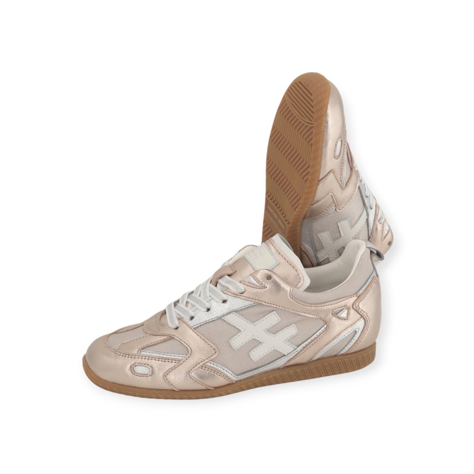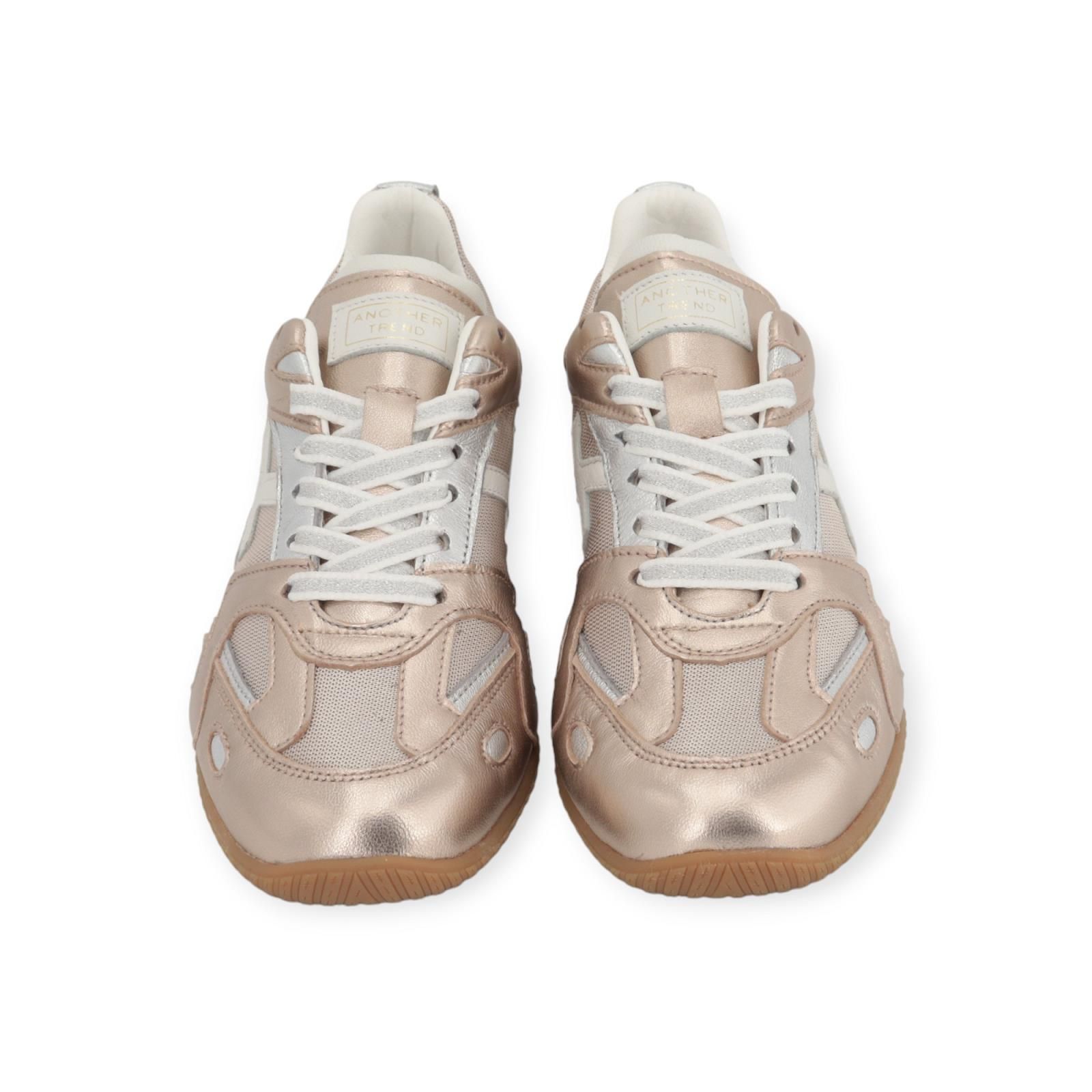 Sneaker A079 van Another Trend voor dames. Deze lage sneaker is in goud shining leer met zilver accenten. Het fijne mesh en off wit leren logo zorgen voor een mooi afwerking. De binnenkant is uit leer vervaardigd met een uitneembare binnenzool.