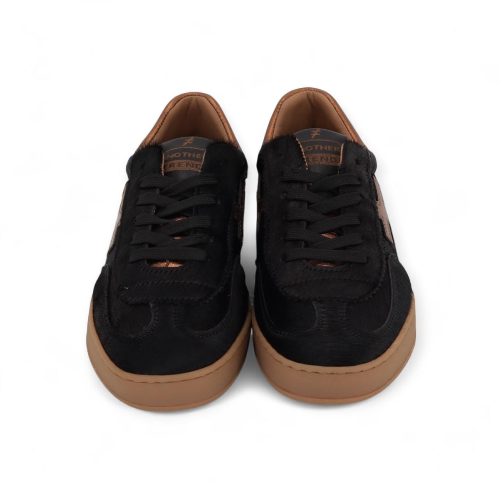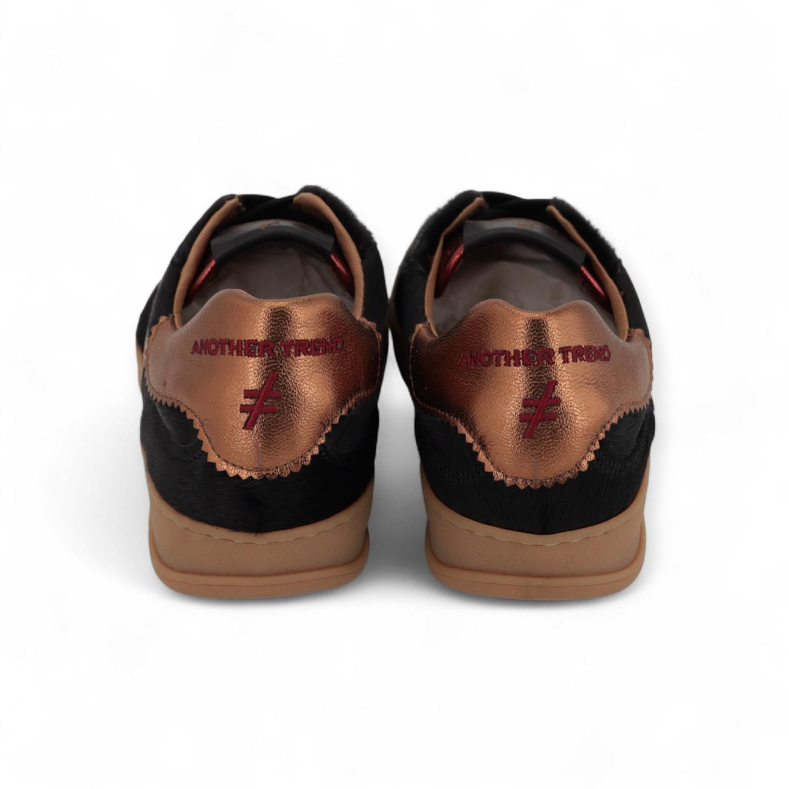 Sneaker Iconic II in zwart met goud van Another Trend. Deze schoen is in zwart pels met warm goud aan de hielflap en aan de zijkant in logo. Binnenkant is uit leder vervaardigd met een uitneembare zool. Is op een aangename bruine gummy zool.