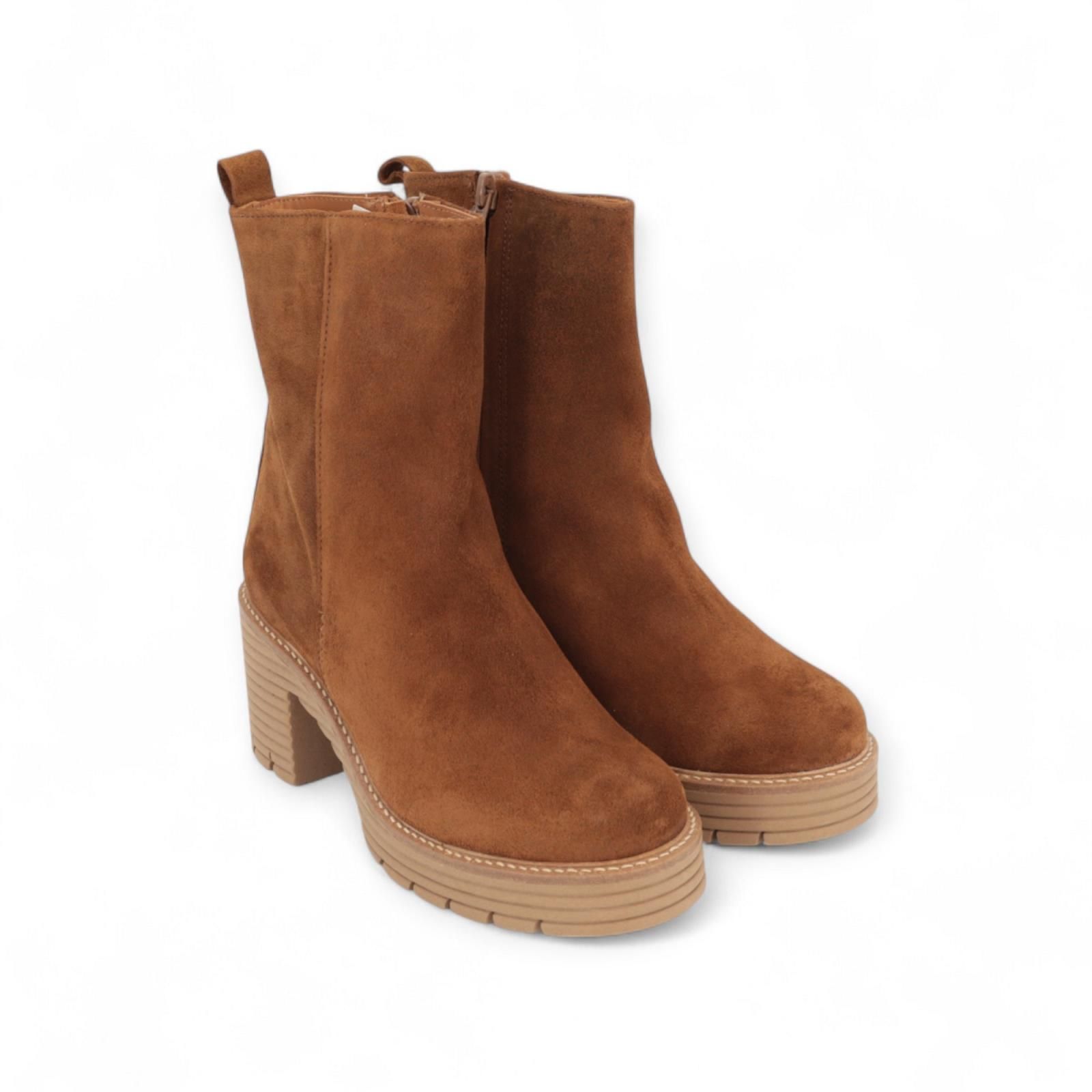 Enkellaars van Belang voor dames. Deze enkellaars is in cognac suède. Heeft een ronde neus met een ritssluiting aan de zijkant. Is op een dikke beige antislipzool met een blokhakje van 5-5,5cm hoog.