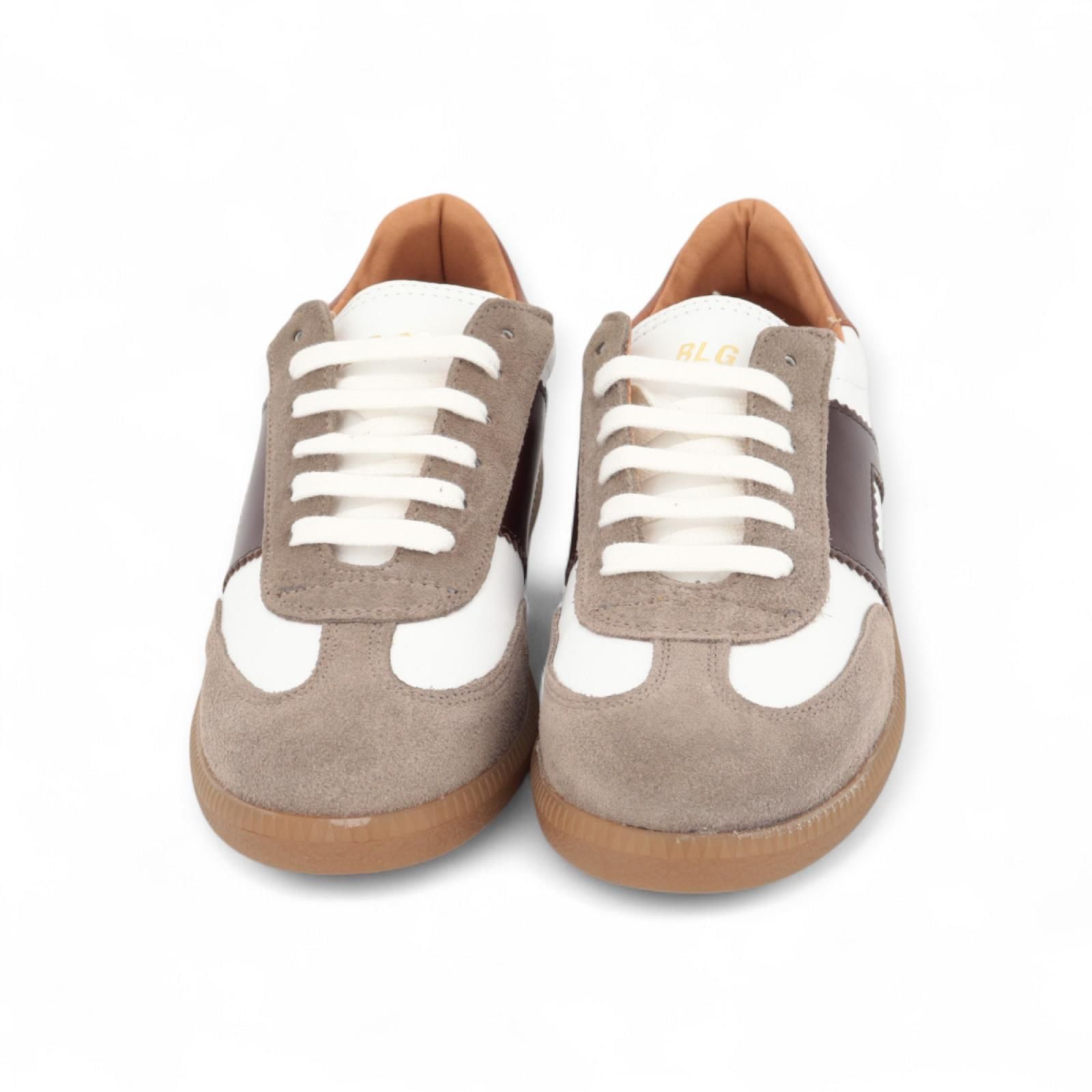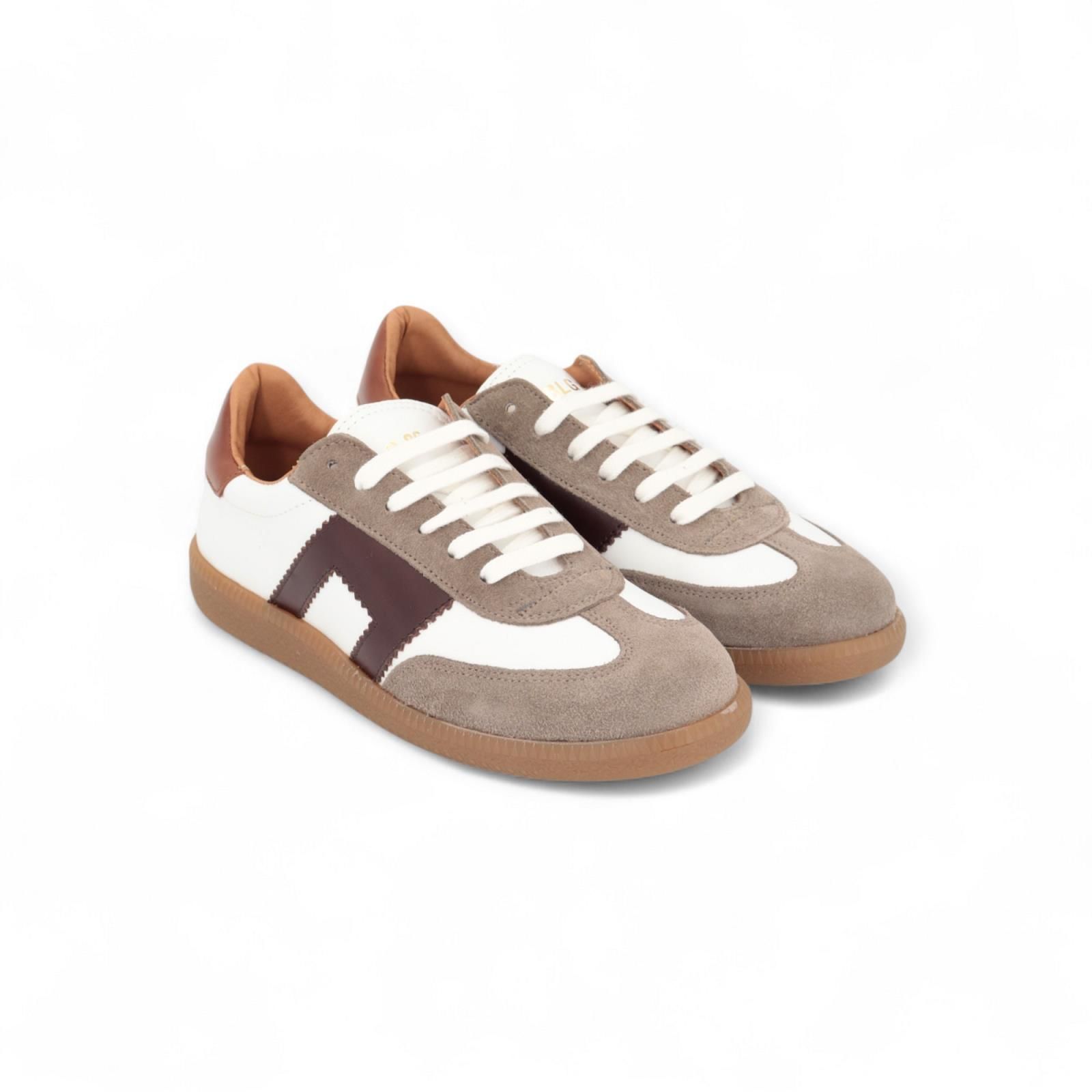 Belang sneaker voor dames. Deze witte lederen sneaker is met een cognac hielflap. Afgewerkt met bruine lederstukken en vooraan taupe suède. Is op een lichte gummyzool en de binnenzool is uitneembaar.