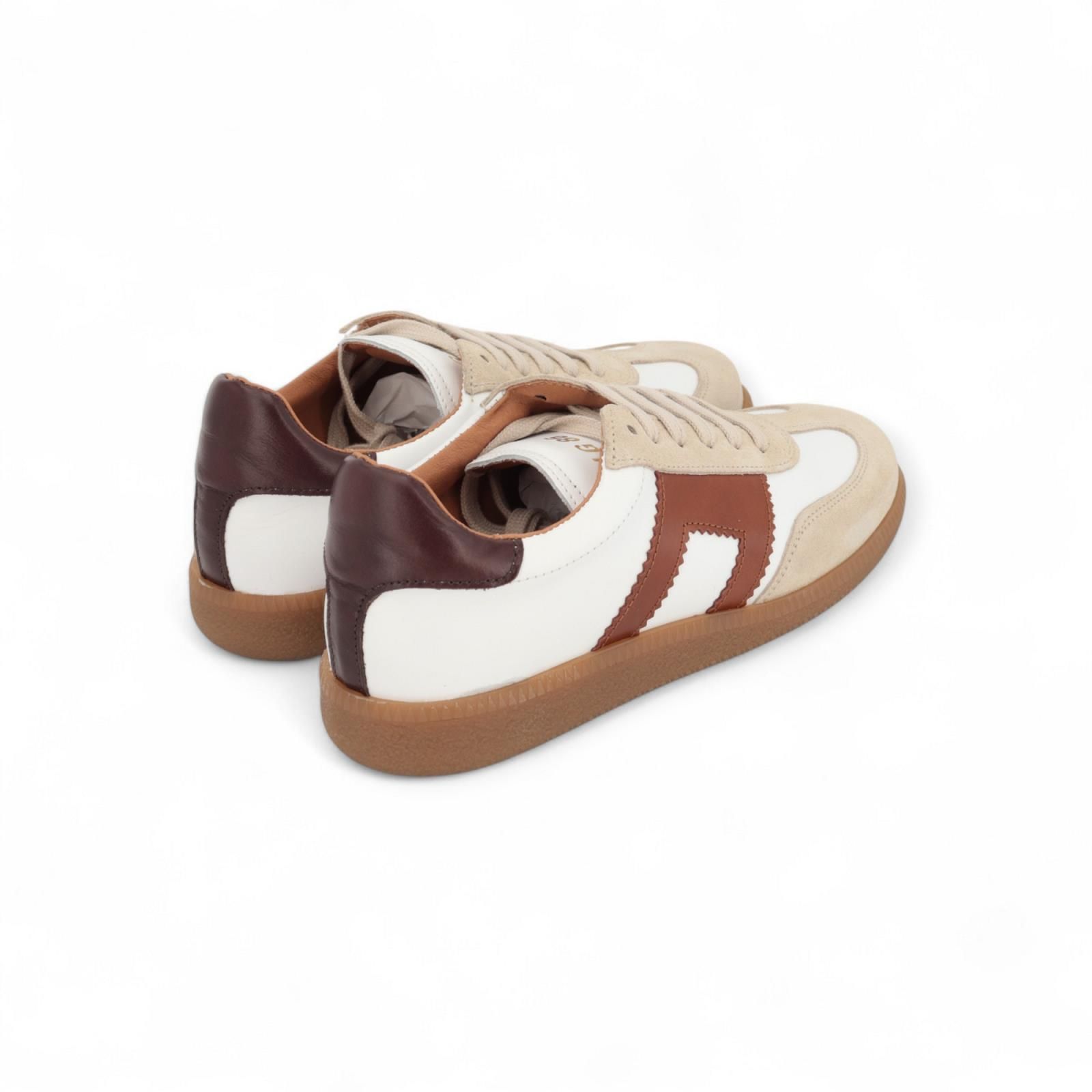 Belang sneaker voor dames. Deze witte lederen sneaker is met een bruine hielflap. Afgewerkt met cognac lederstukken aan de zijkant en vooraan beige suède. Is op een lichte gummyzool en de binnenzool is uitneembaar.