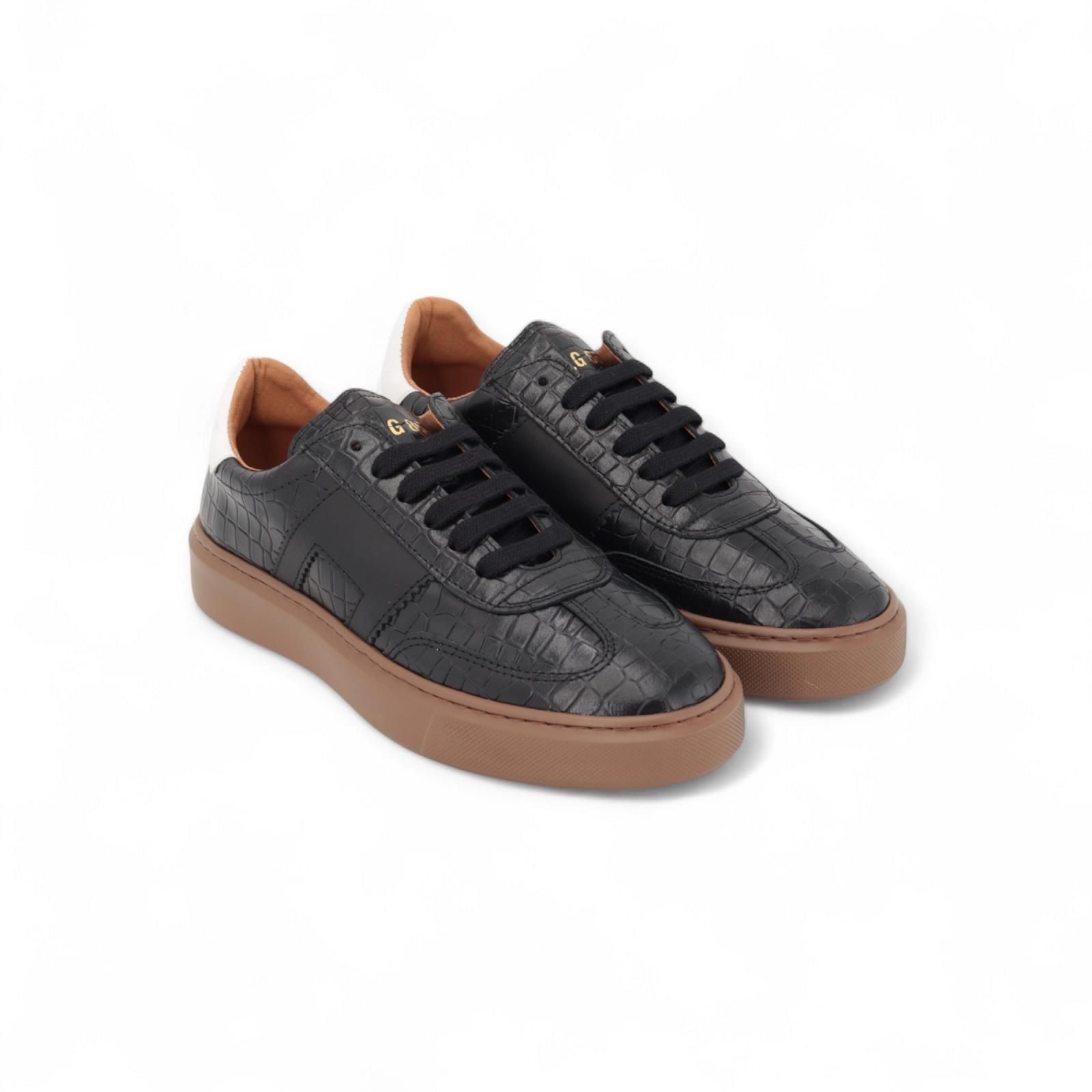 Sneaker 08334 van Belang voor dames. Deze sneaker is in zwart geprint crocco met een witte hielflap. Heeft een bruine antislip gummyzool en de binnenzool is uitneembaar.
