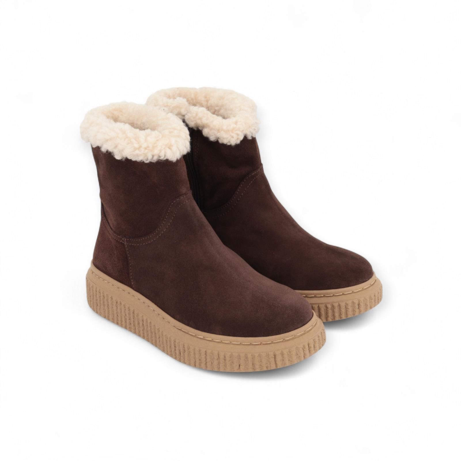 Enkellaars van Belang voor dames. Deze hippe enkellaars is in bruin suède met een dikke geribte beige zool. Heeft een ritssluiting aan de zijkant en is mooi afgewerkt met wol aan de bovenkant. De binnenzool is uitneembaar.