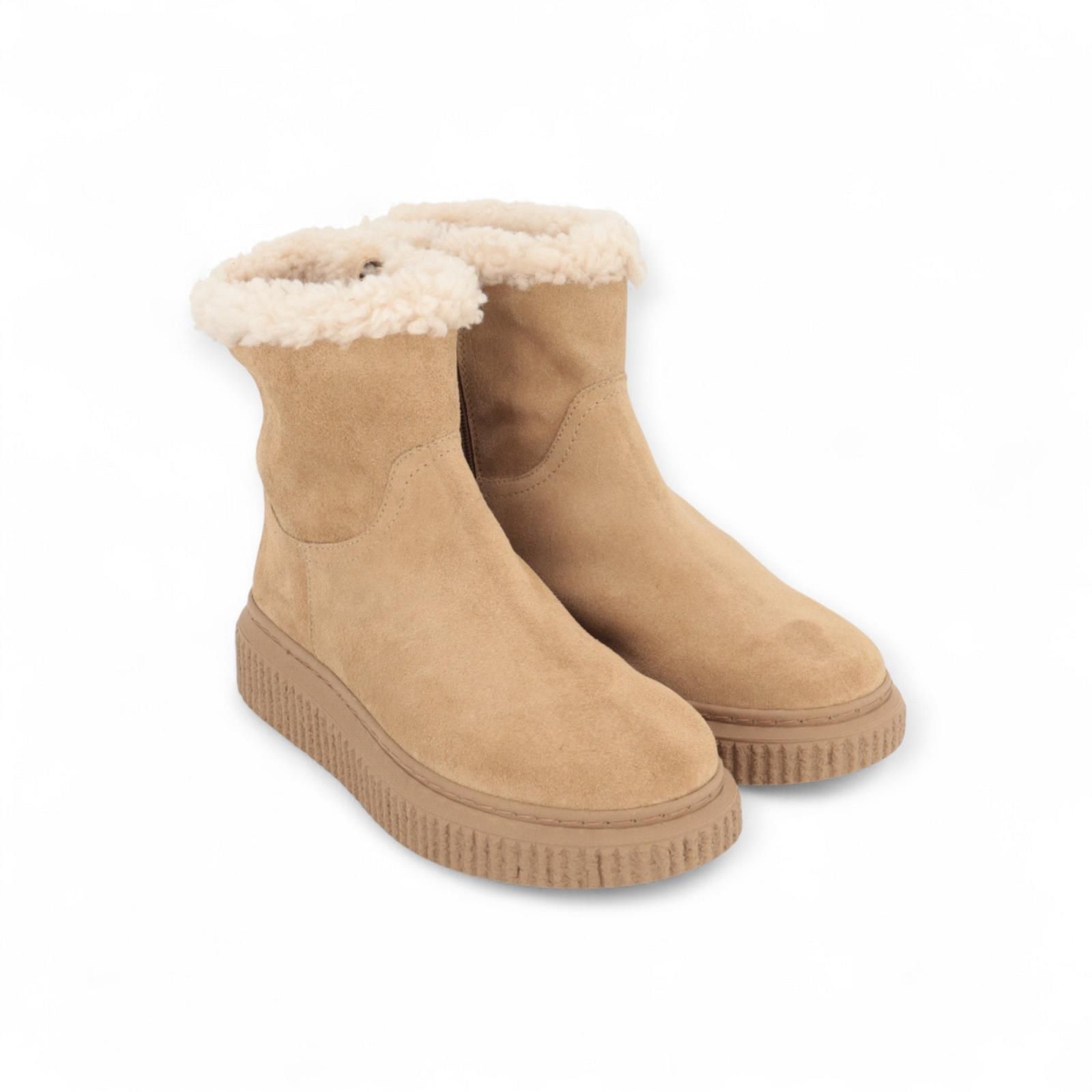 Enkellaars van Belang voor dames. Deze hippe enkellaars is in camel suède met een dikke geribte beige zool. Heeft een ritssluiting aan de zijkant en is mooi afgewerkt met wol aan de bovenkantl. De binnenzool is uitneembaar.