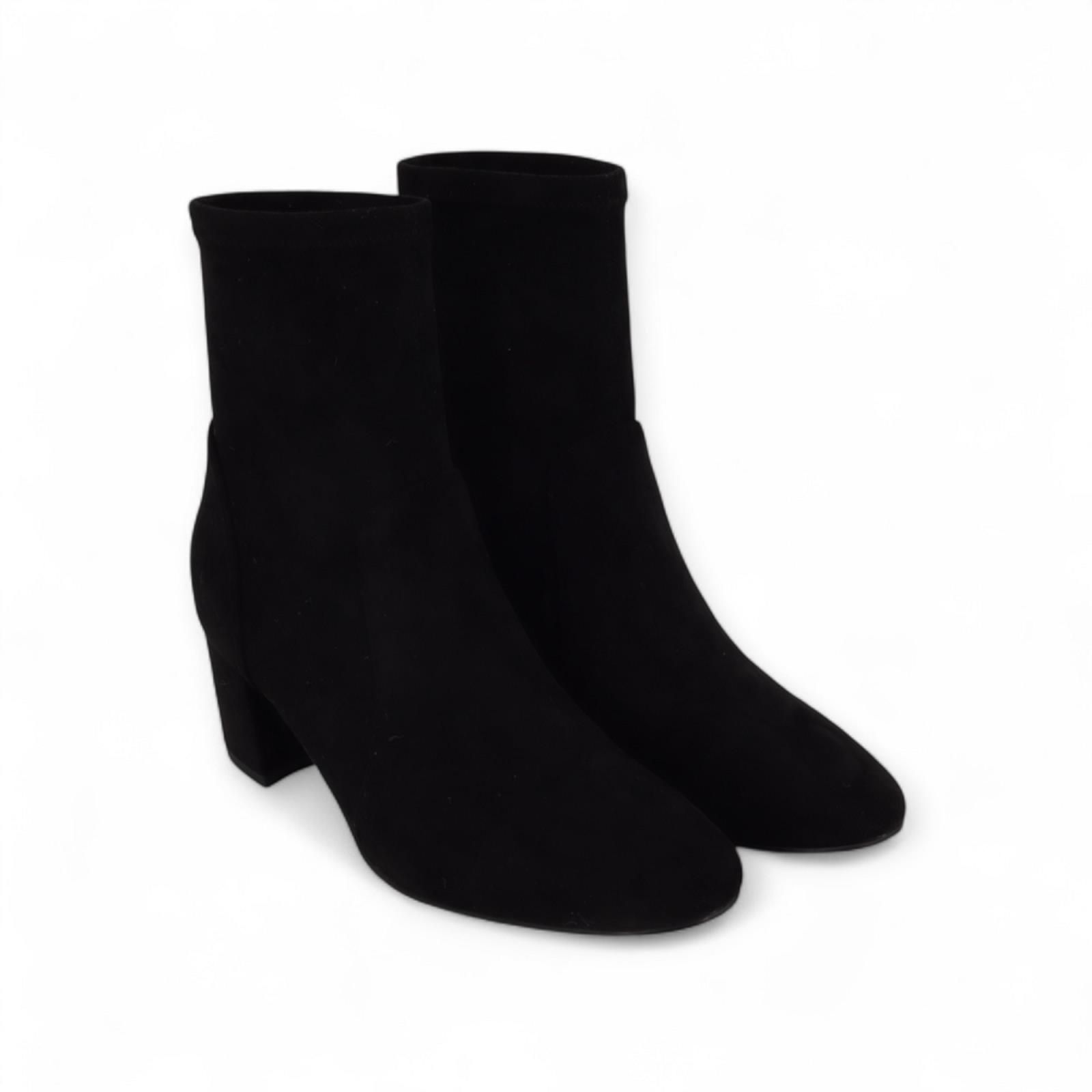 Enkellaars van Bibi Lou voor dames. Deze enkellaars in zwart suède stretchleer. Heeft een ronde neus en stekkingen rond de enkel. Is met een klein blokhakje van 5-5,5cm hoog.
