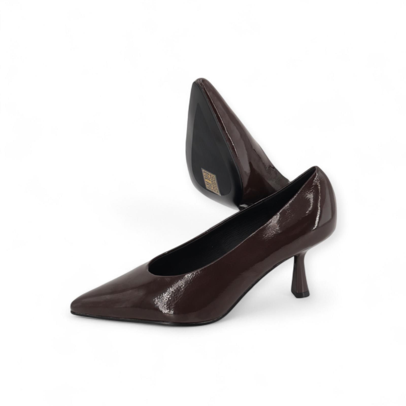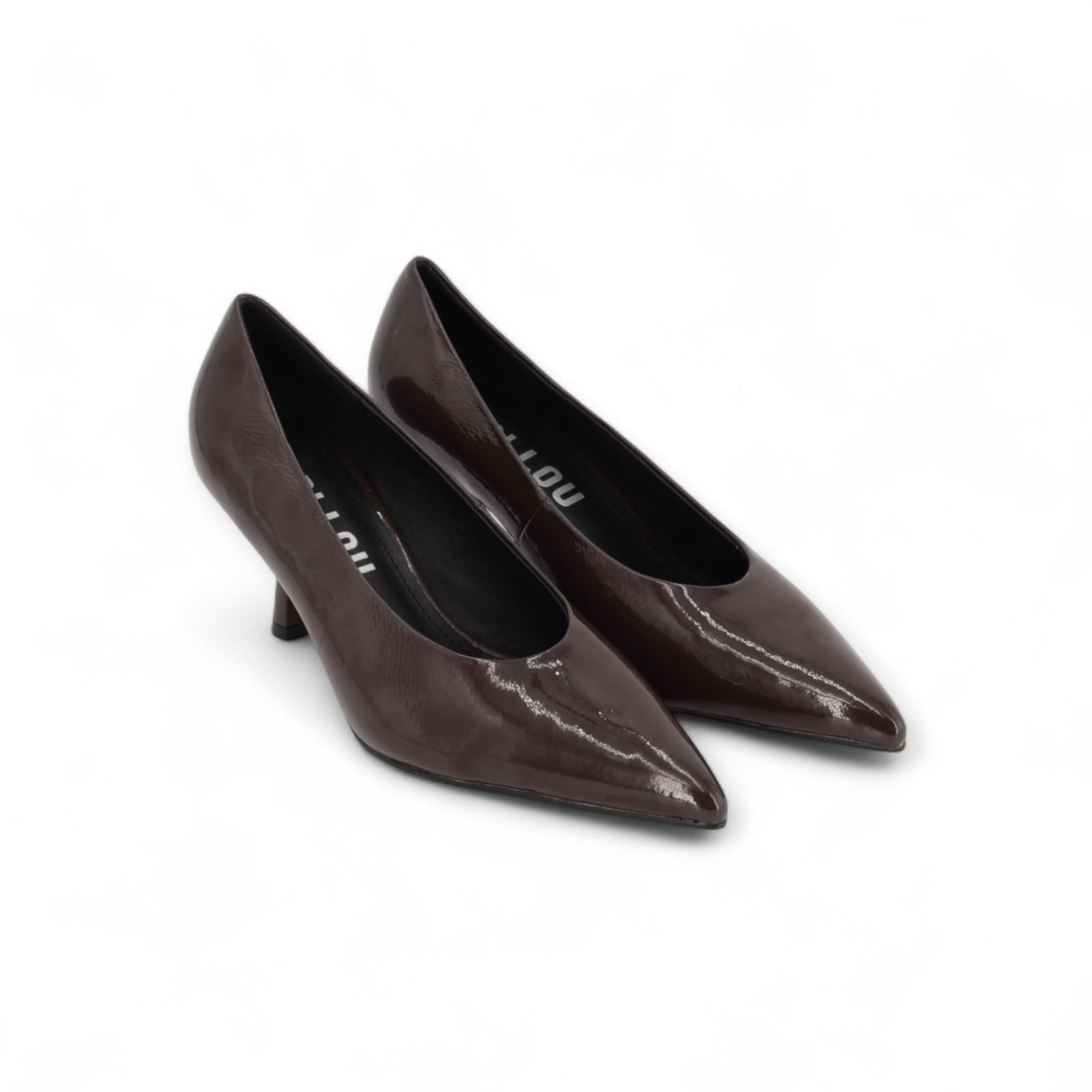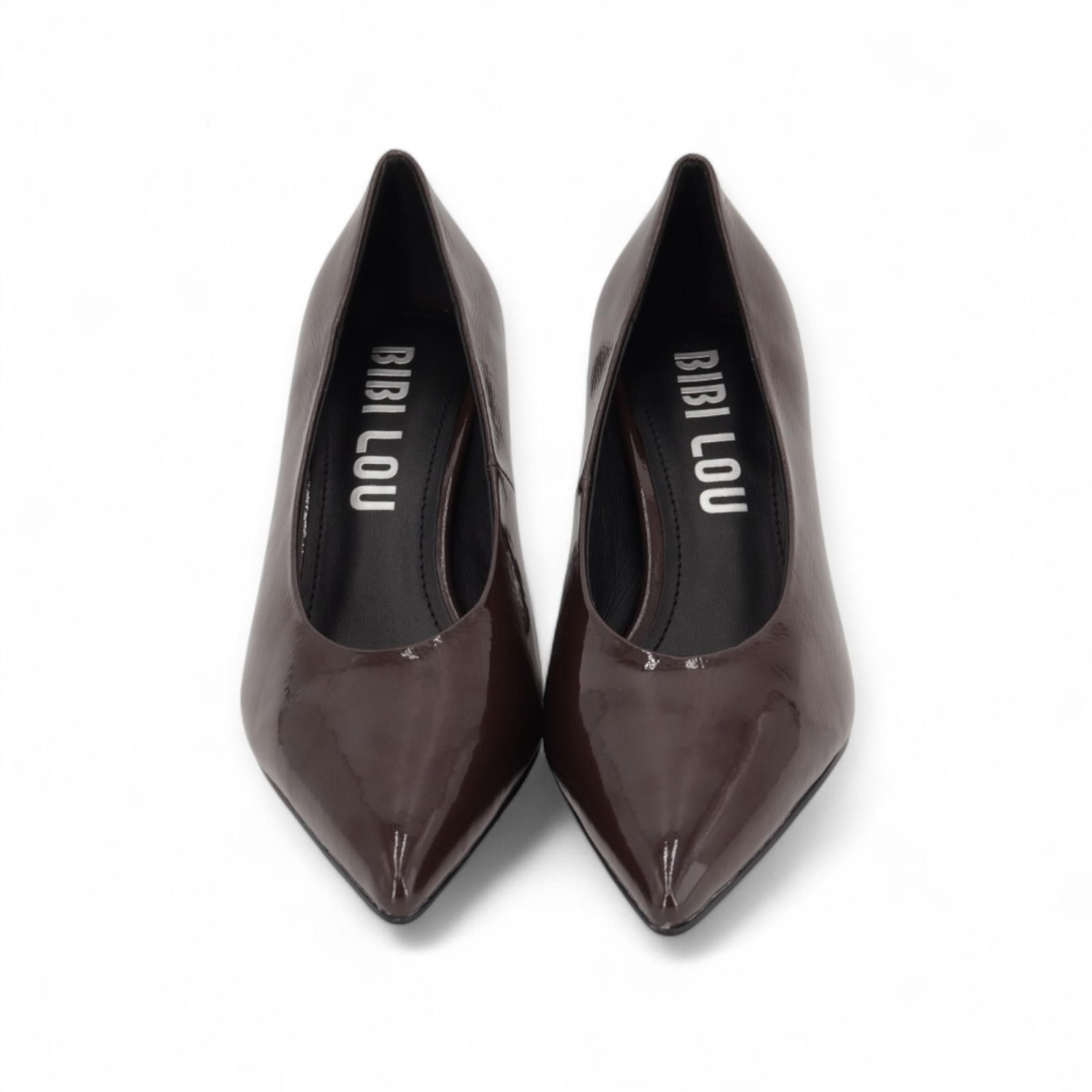 Pump van Bibi Lou voor dames. Deze pump is in bruin lakleer. Heeft een scherpe neus en een fijne naaldhak van 7-7.5cm hoog met een antislipzool.