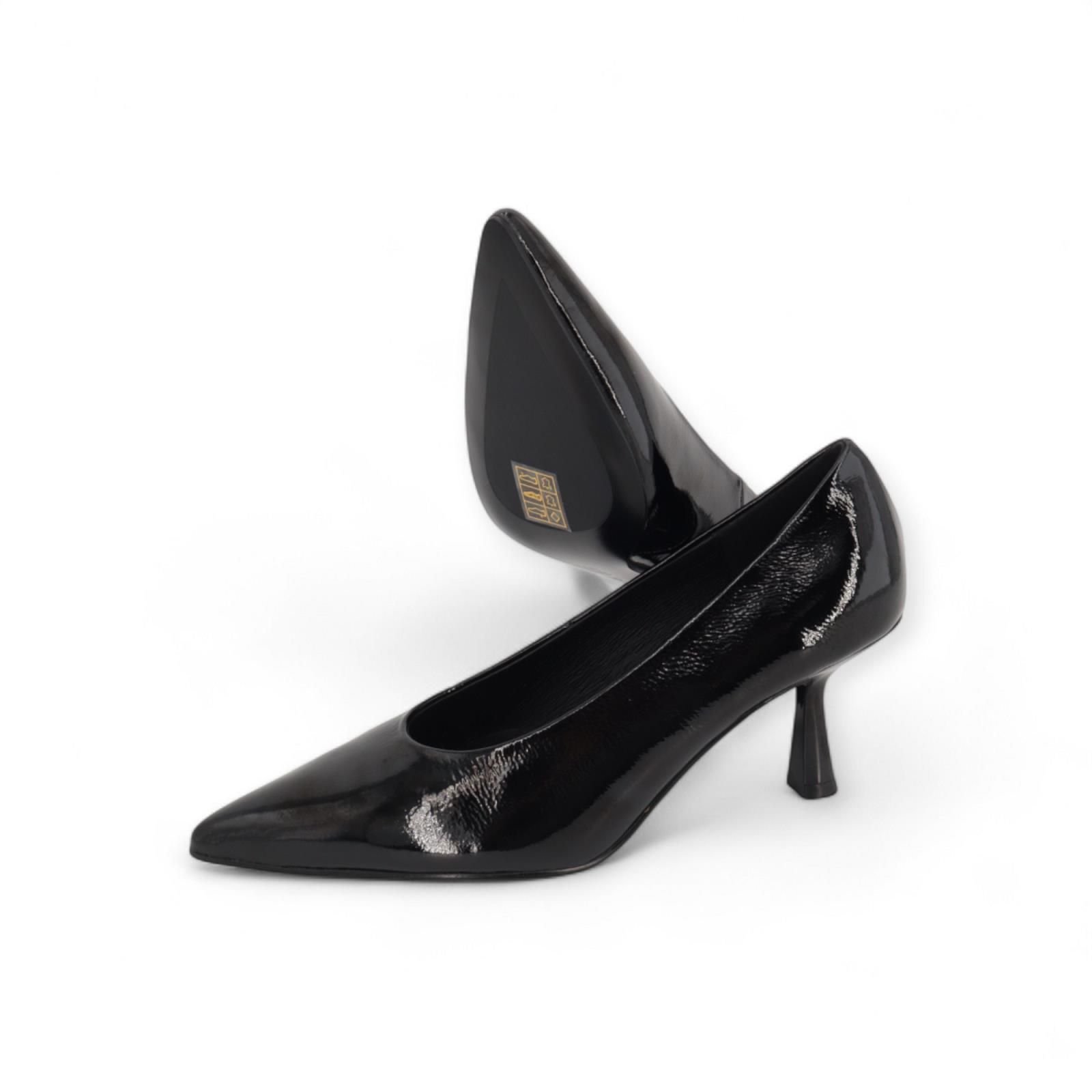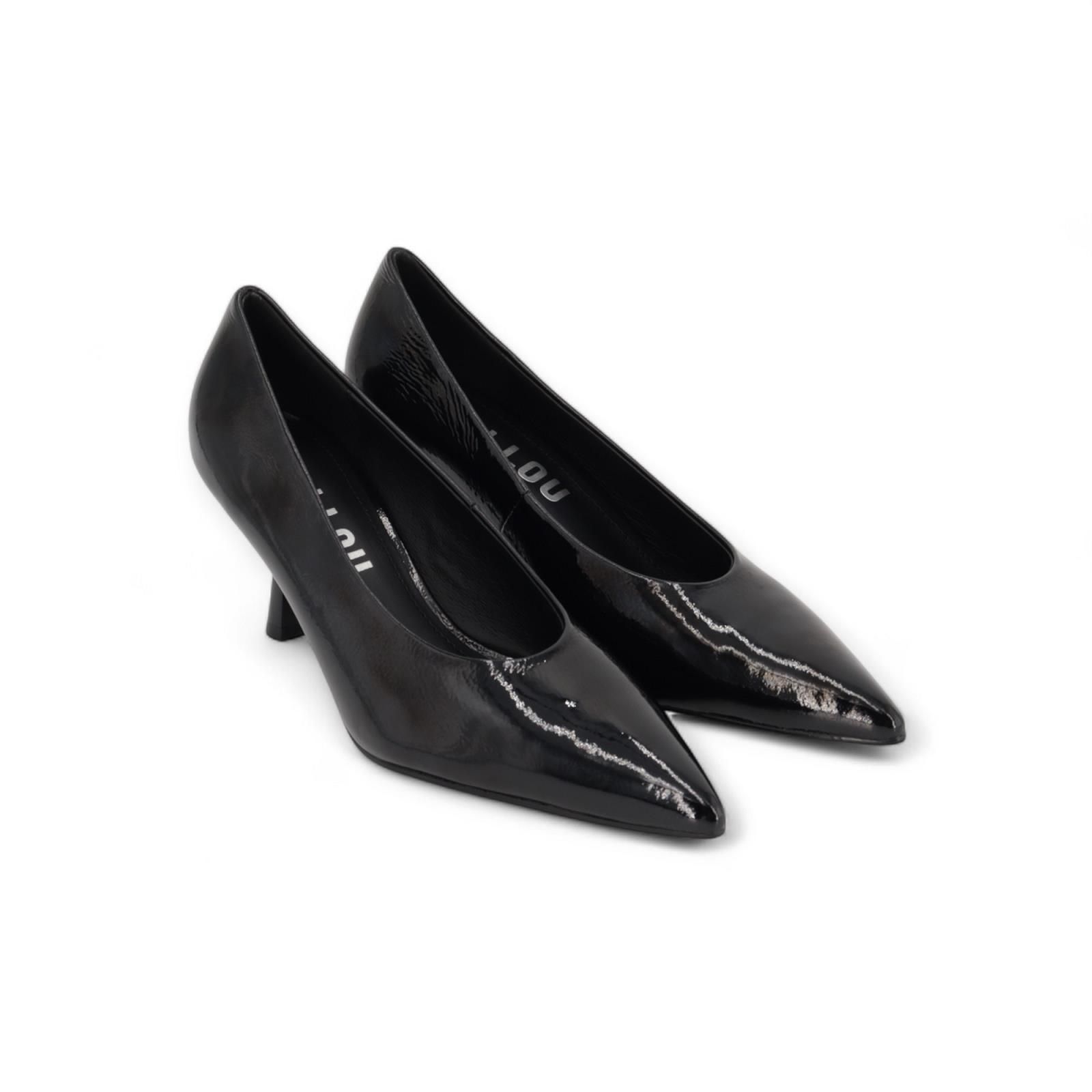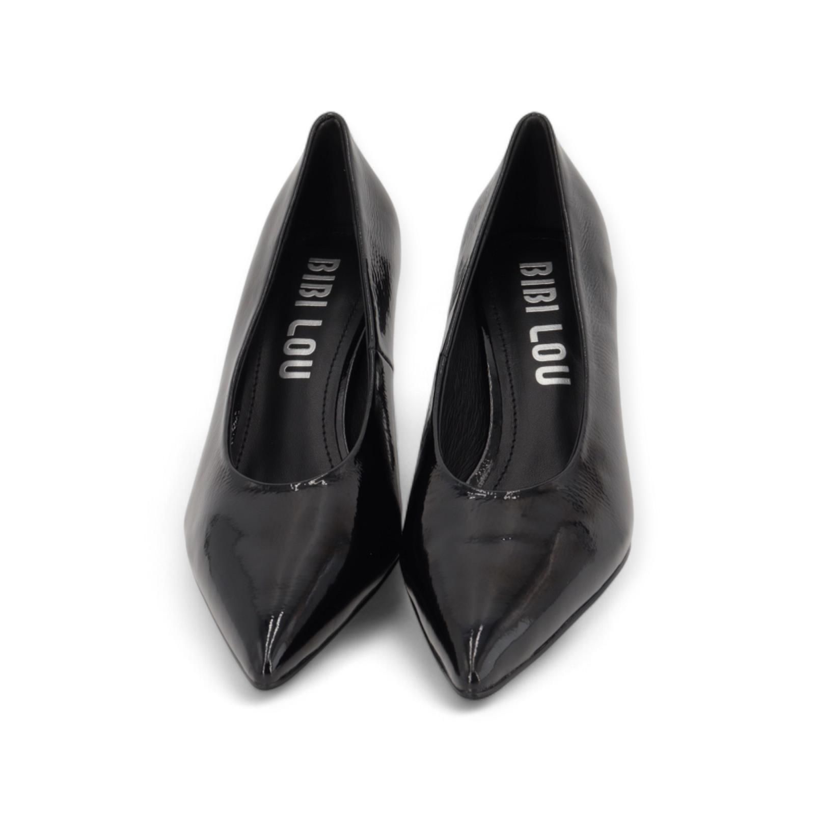 Pump van Bibi Lou voor dames. Deze pump is in zwart lakleer. Heeft een scherpe neus en een fijne naaldhak van 7-7.5cm hoog met een antislipzool.