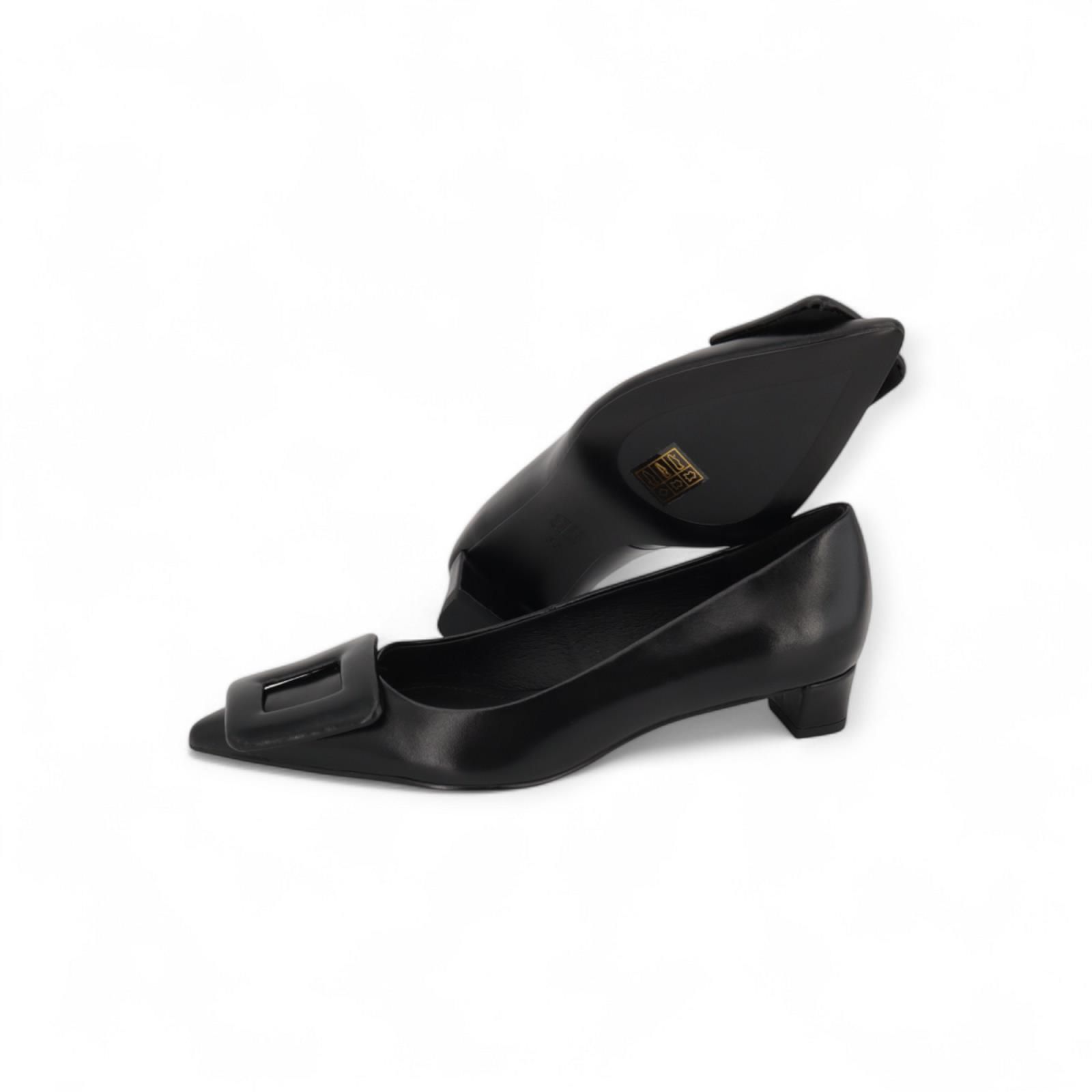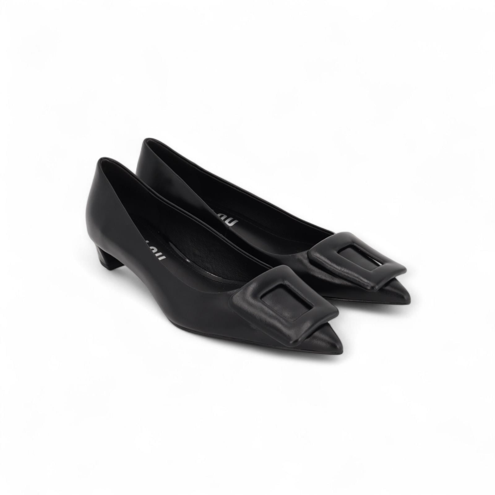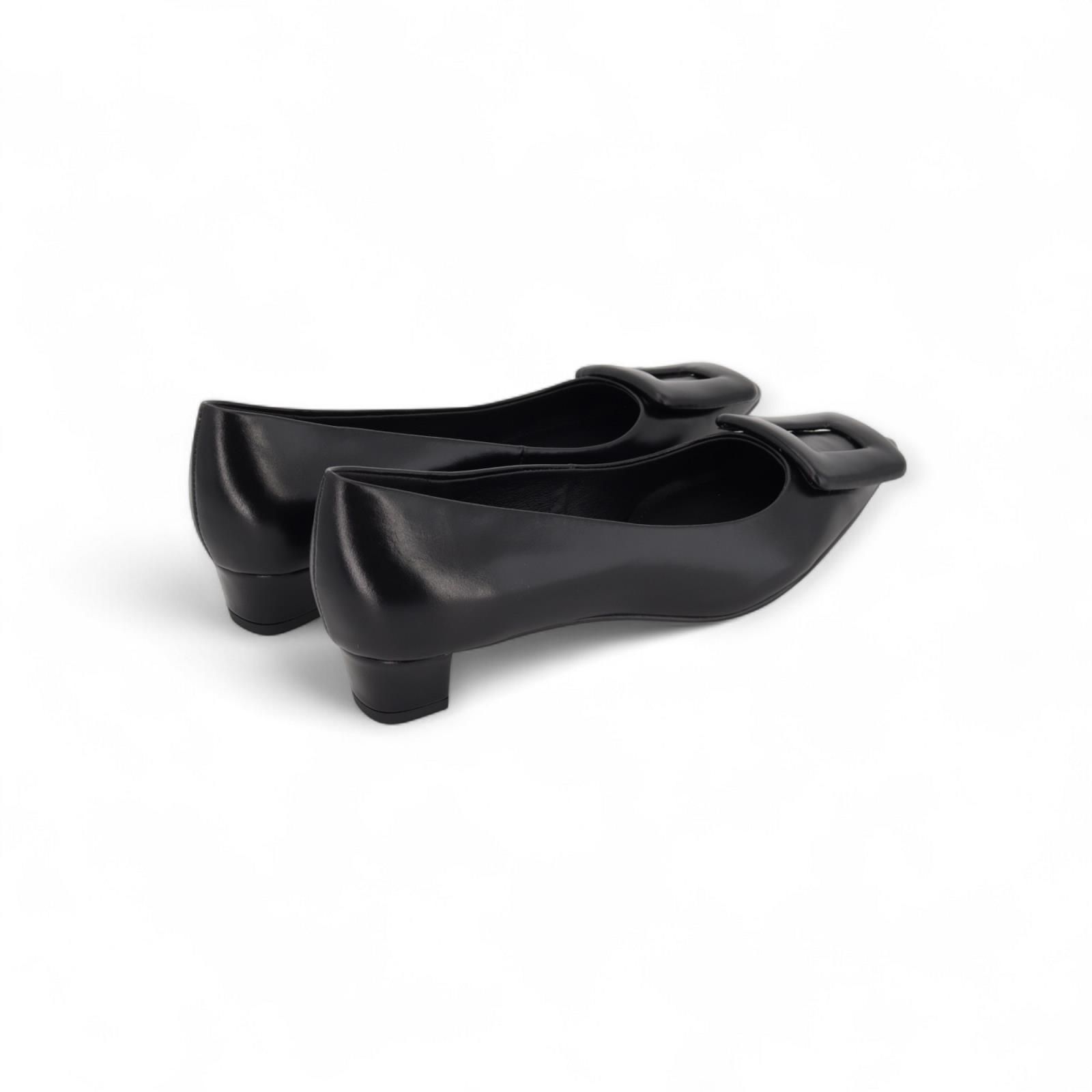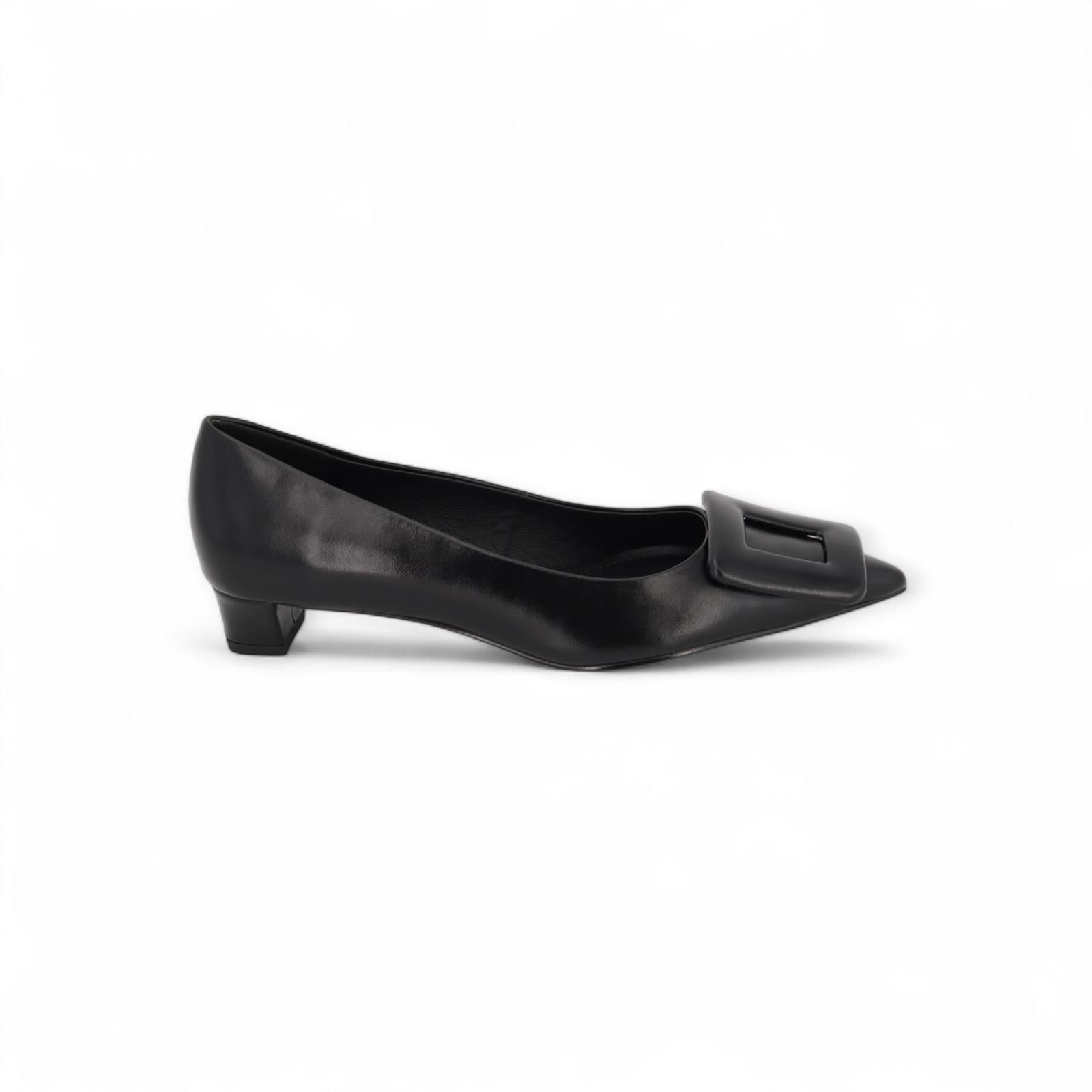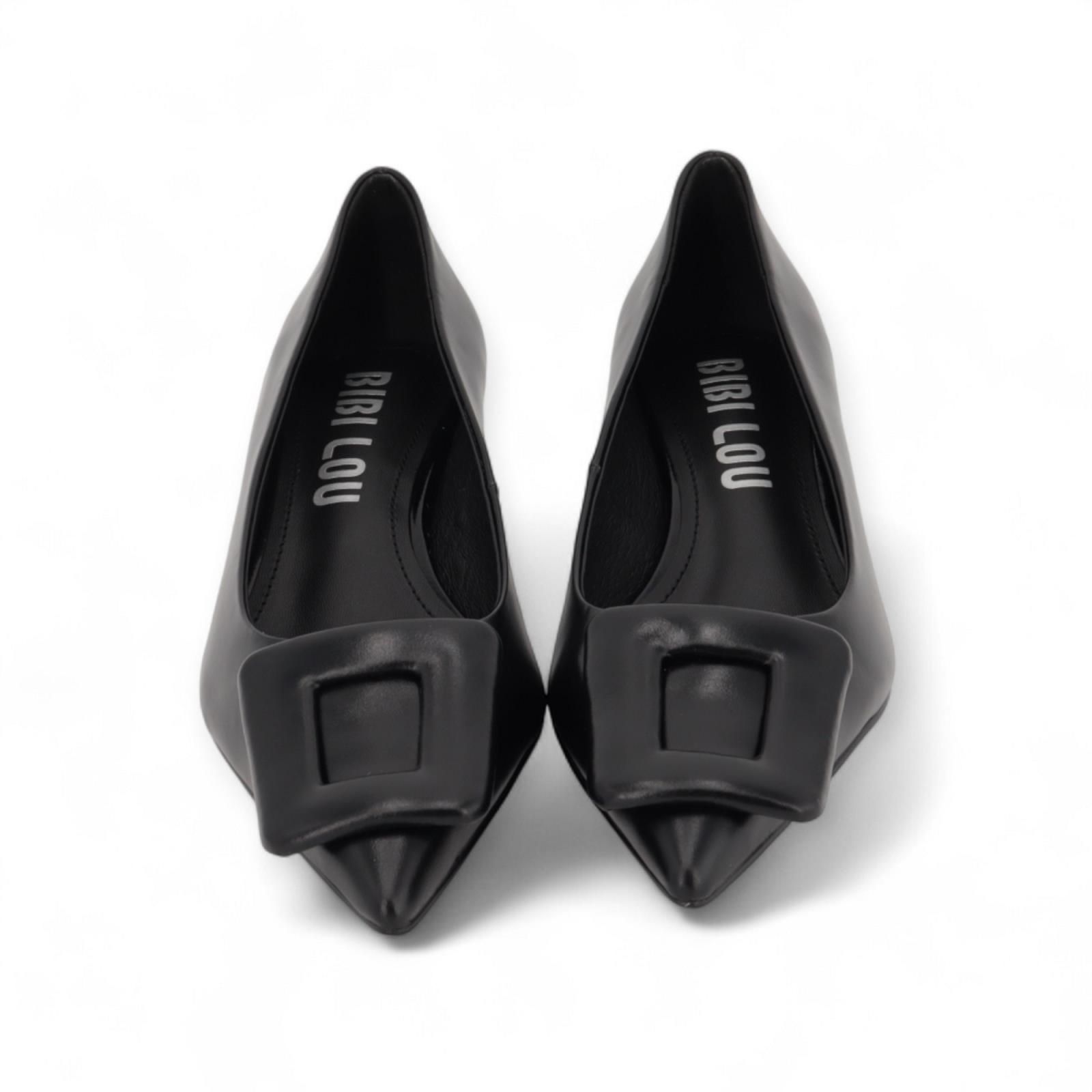 Pump van Bibi Lou voor dames. Deze pump is in zwart leer. Heeft een scherpe neus met boekel. Is op een klein geometrisch hakje van 2-2.5cm hoog.