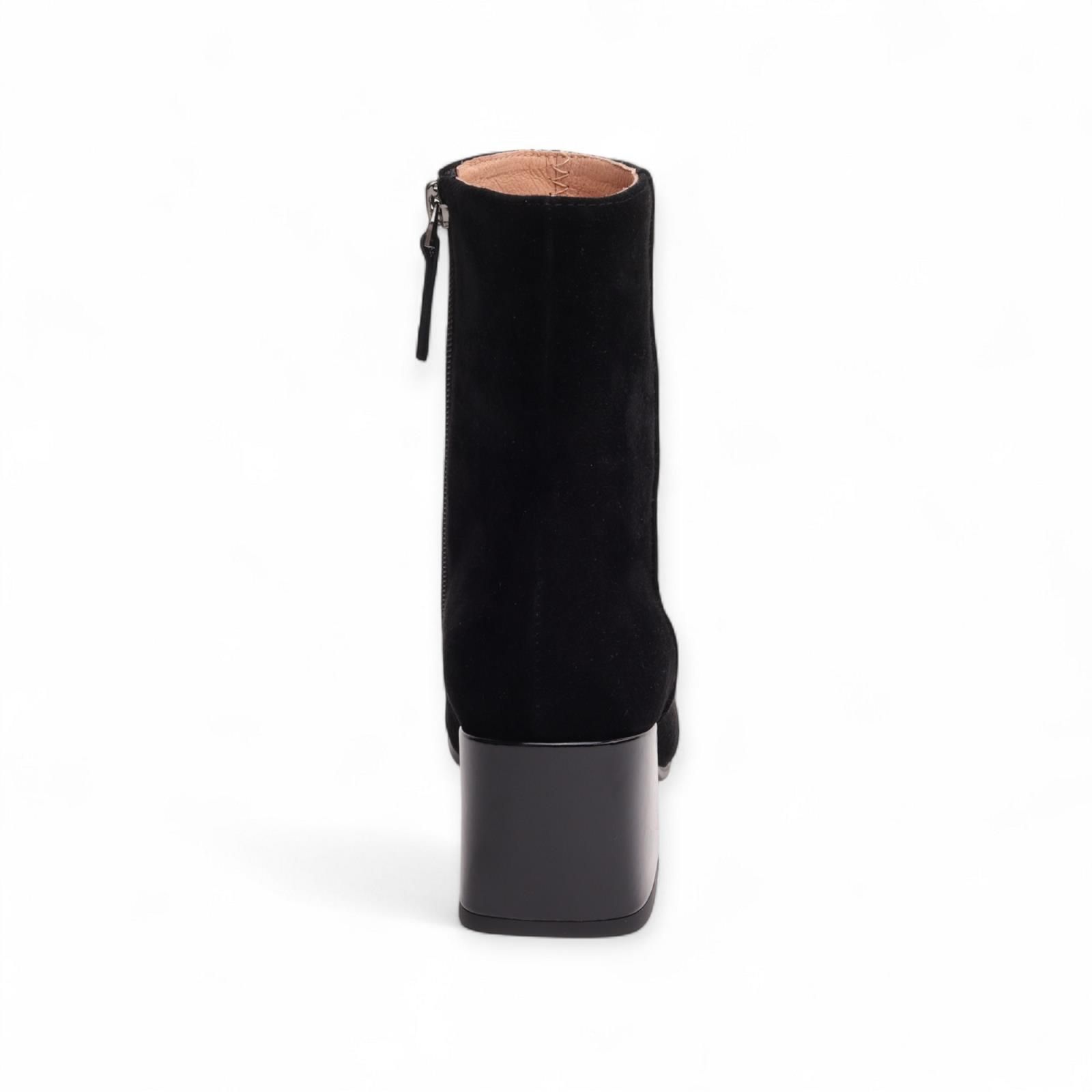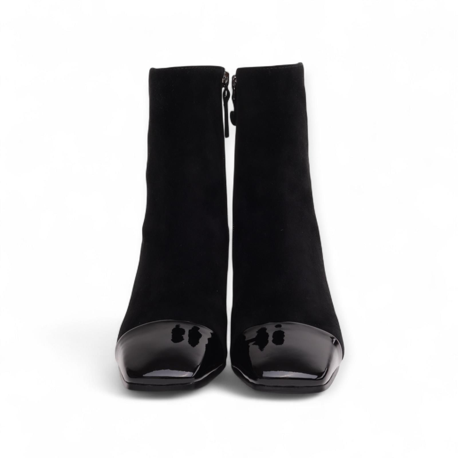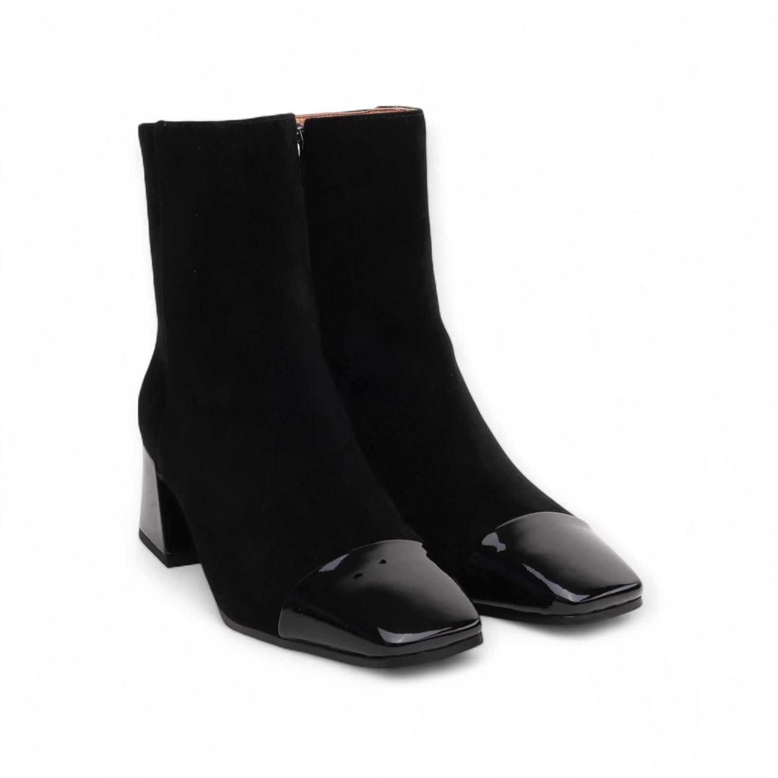 Enkellaarsje Daniella van Bibi Lou voor dames. Dit elegant enkellaarsje is in zwart suède afgewerkt met hak en neus in zwart lakleder. Is met een ritssluiting aan de zijkant. Heeft een blokhakje van 5-5.5cm hoog.