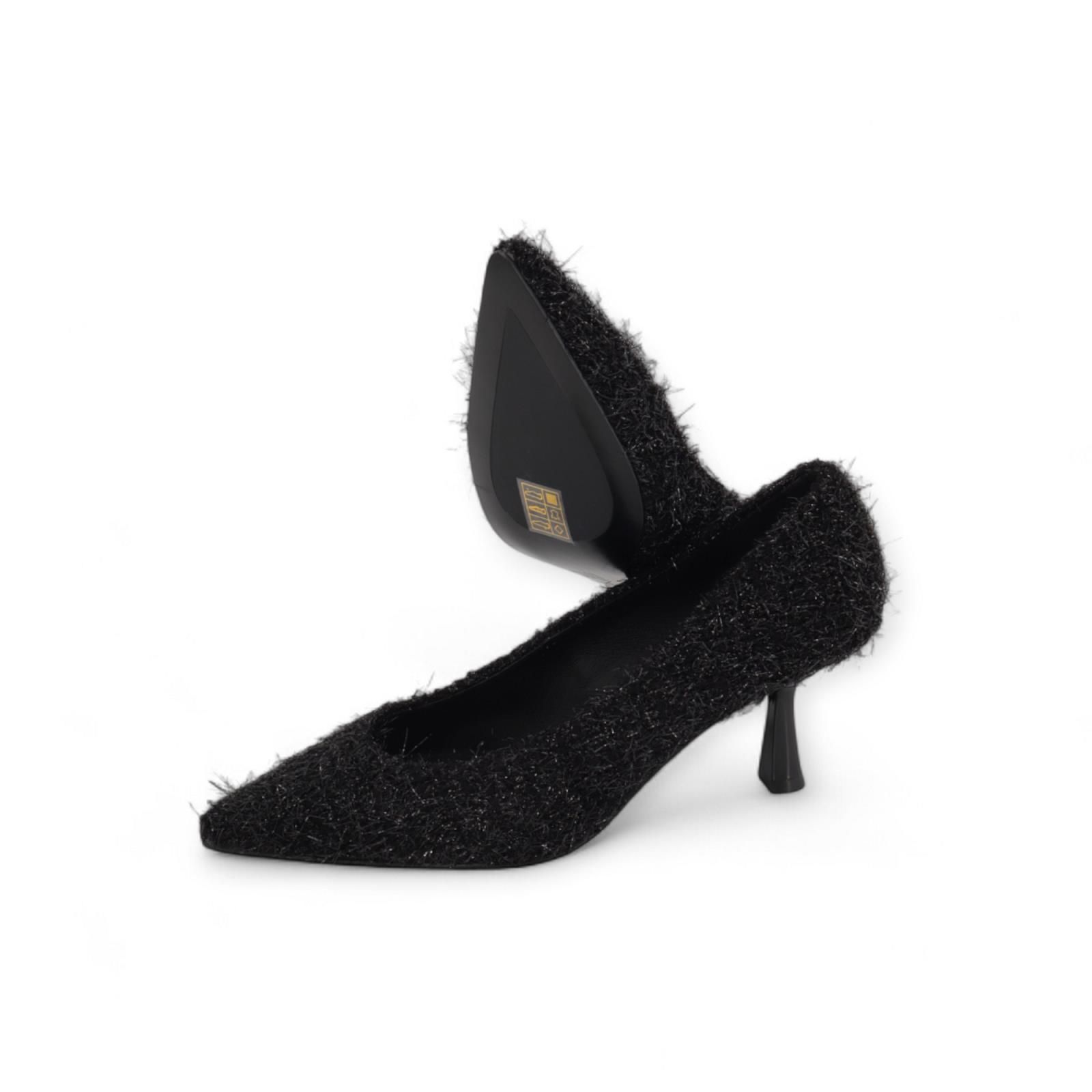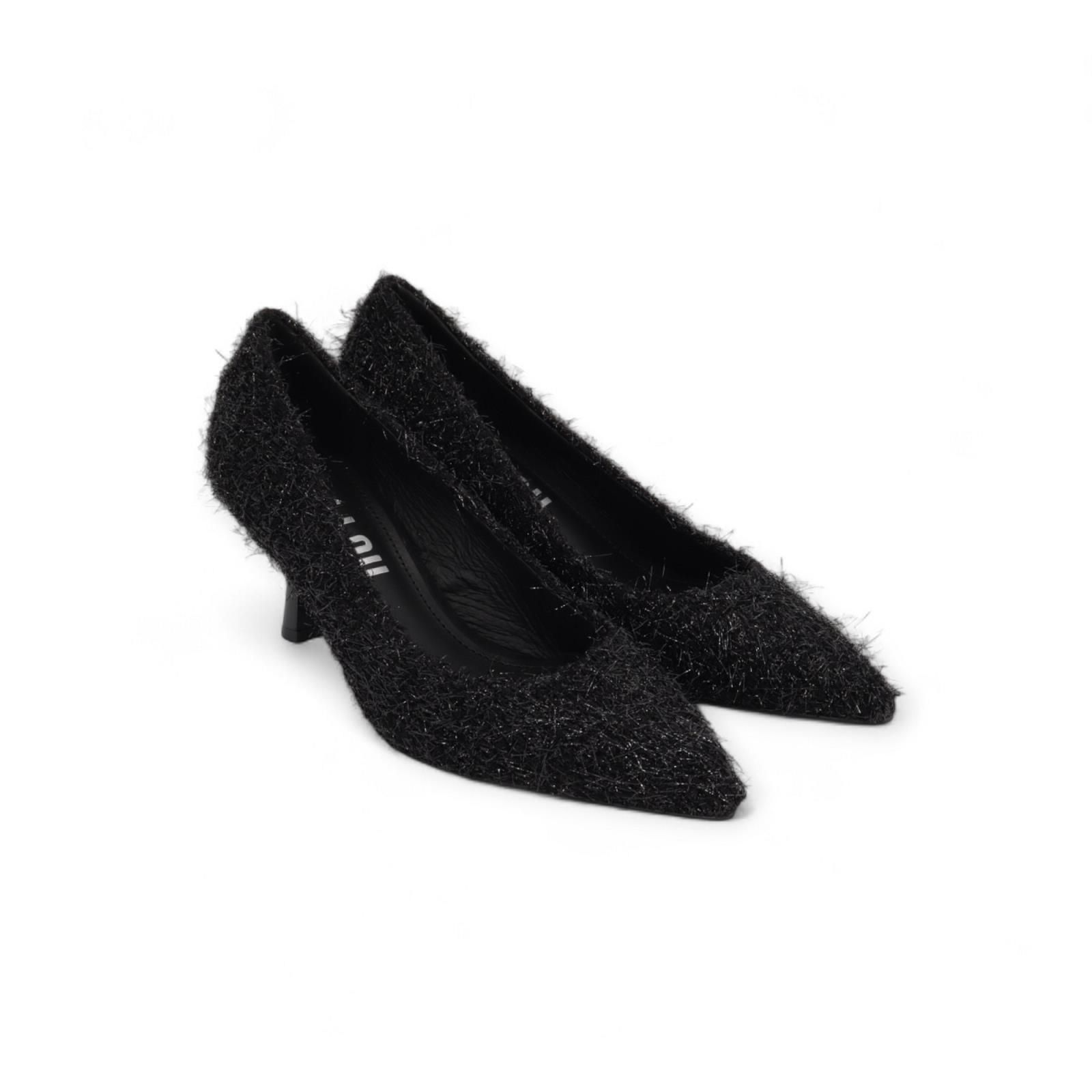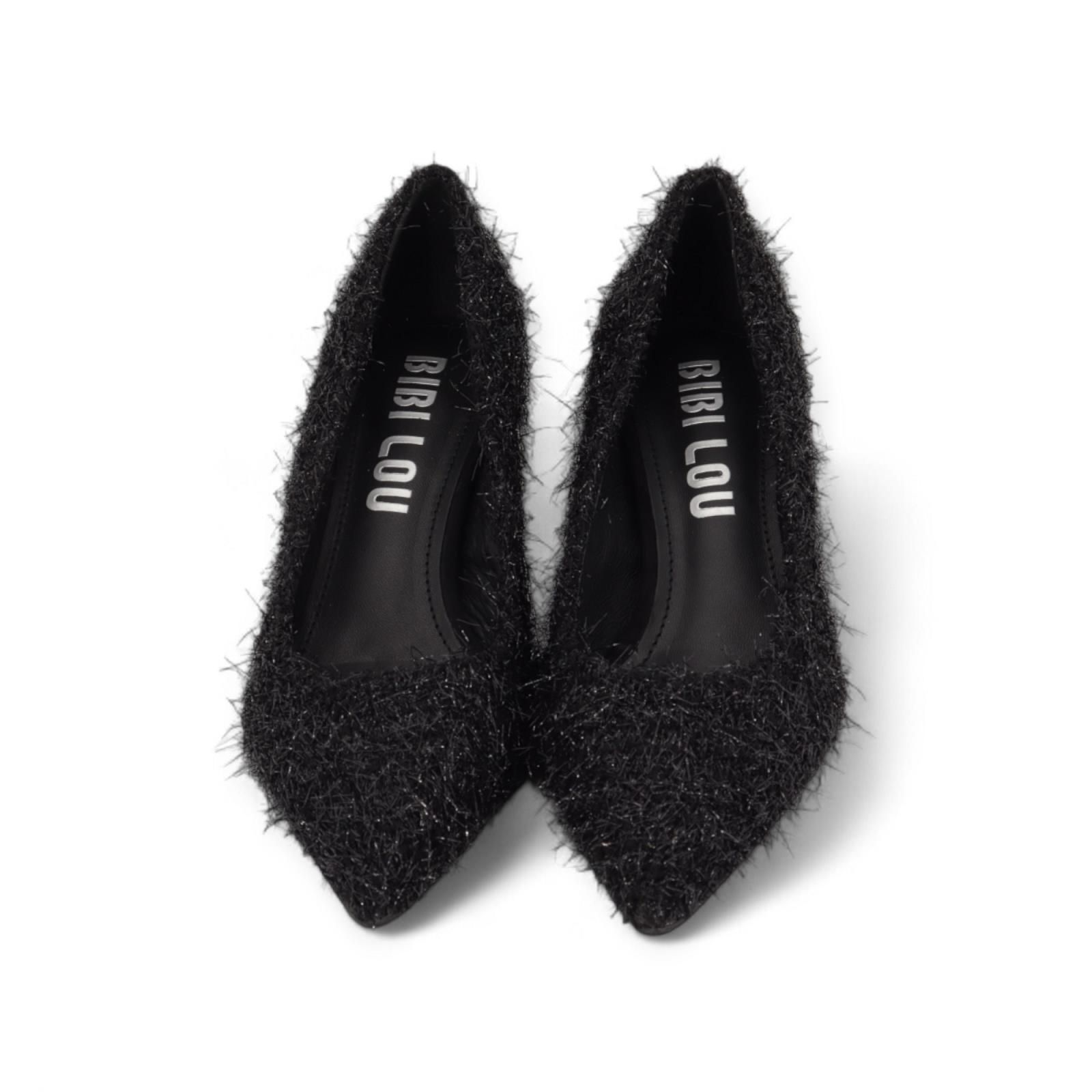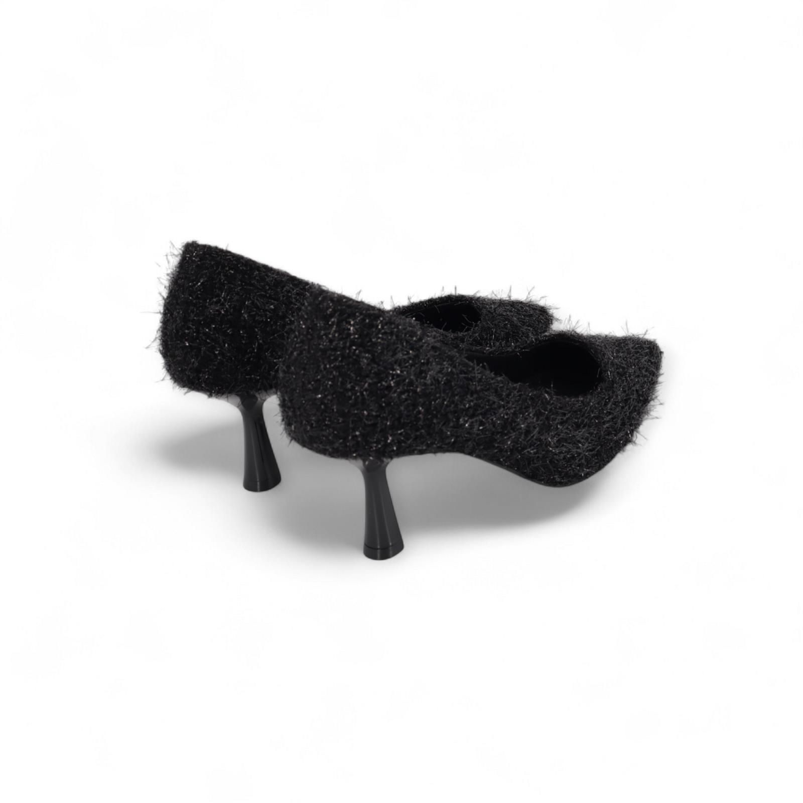 Pump Lobelia van Bibi Lou voor dames. Deze pump is in zwart ‘harige’ stof om een echte teddy winterse look te creëren. Heeft een scherpe neus met een fijne naaldhak van 7-7.5 cm hoog.