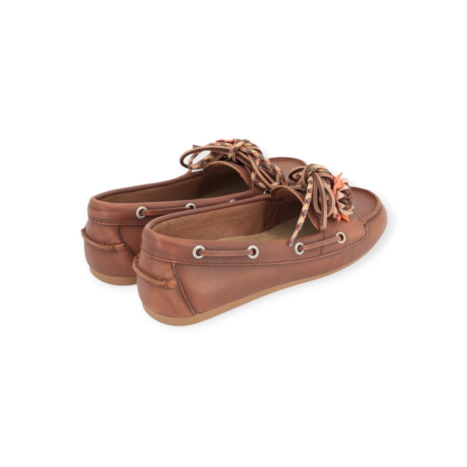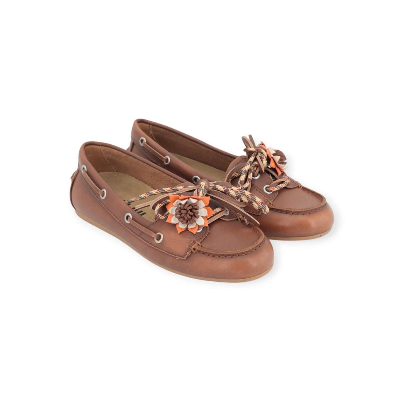 Mocassin Tana van Bibi Lou voor dames. Deze mocassin is in cognac leer. Is met veters langs de zijkant en een dubbele vetersluiting (cognac leer en oranje), verfraaid met mooie contrasterend bloemaccessoire. Hoort bij de nieuwste trend voor de zomer, de typische bootschoen stijl. De binnenkant is in leer met uitneembare zool en de buitenzool is in rubber. Voelt zeer licht aan de voet.