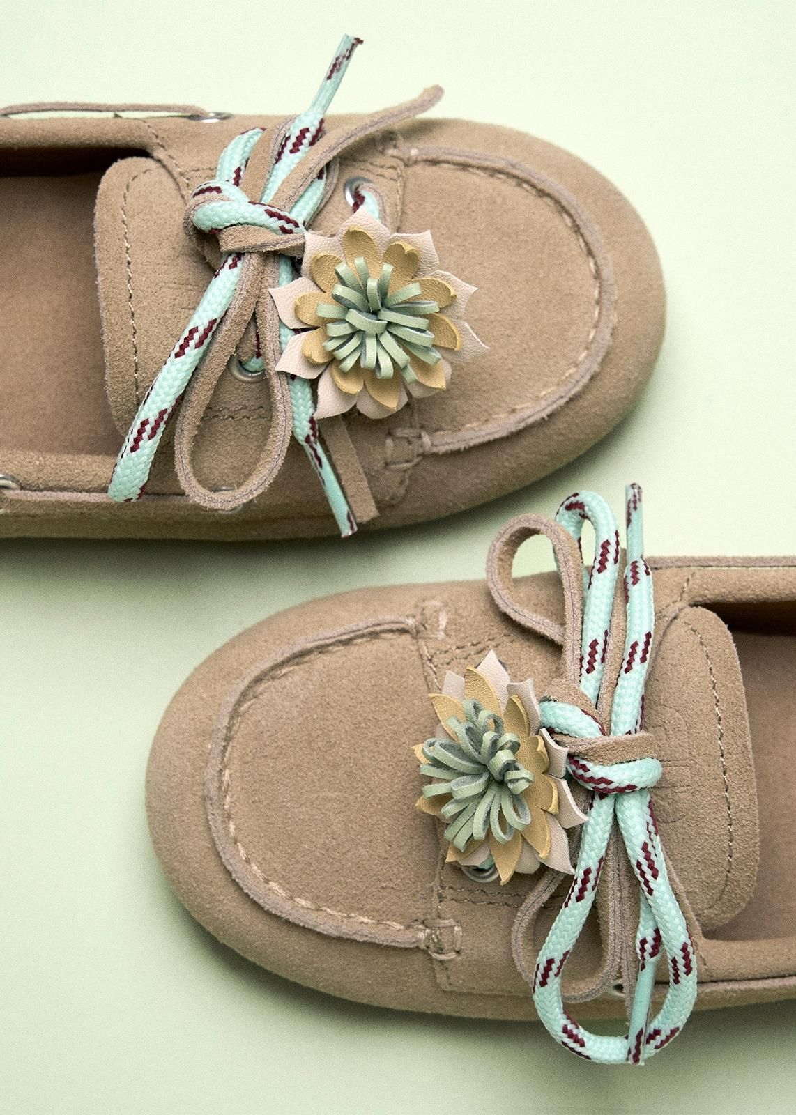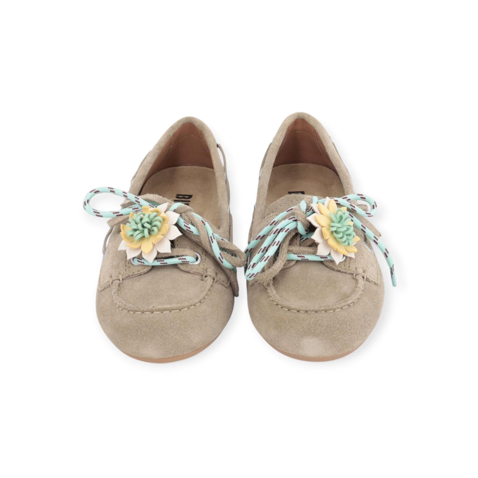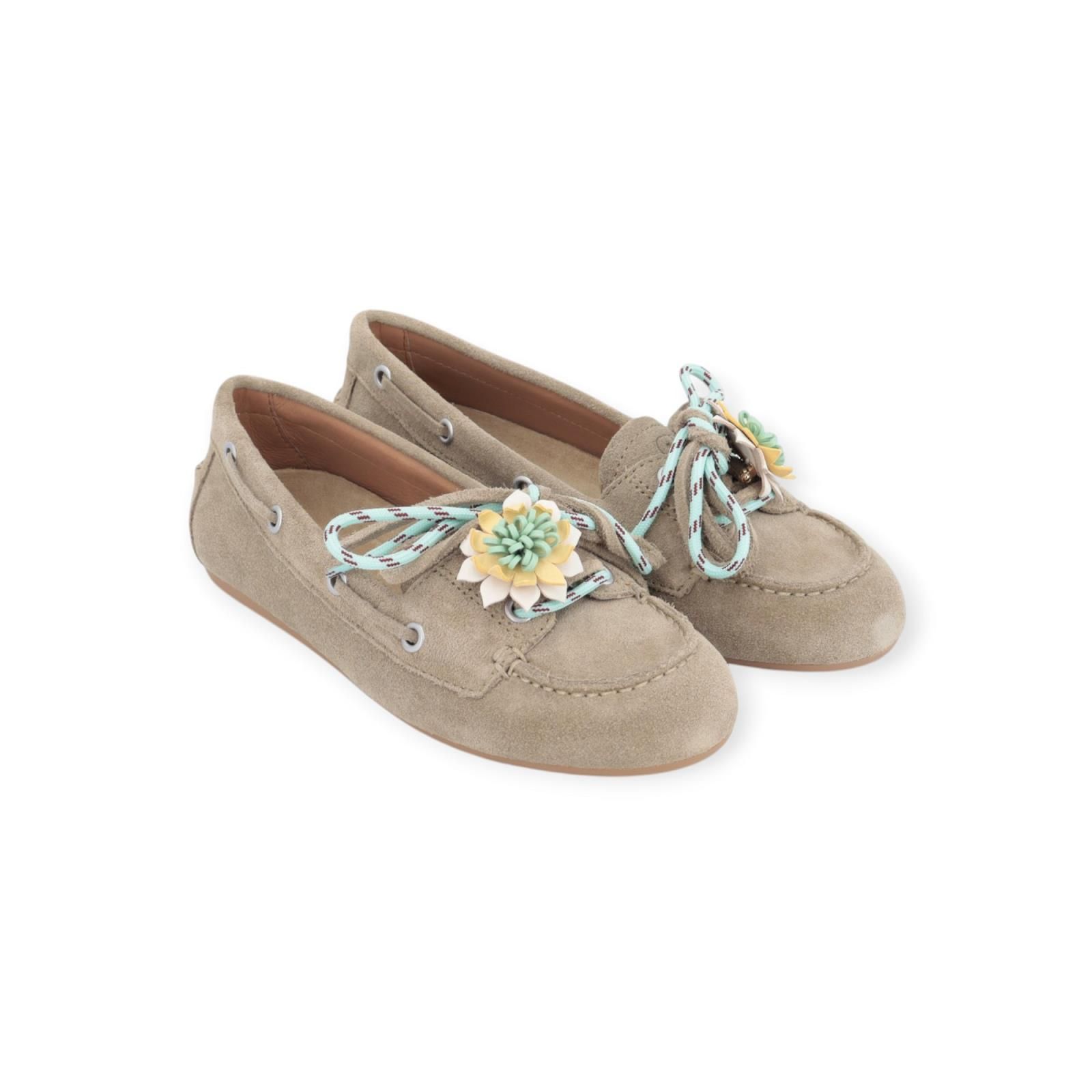 Mocassin Tana van Bibi Lou voor dames. Deze mocassin is in zand suède. Is met veters langs de zijkant en een dubbele vetersluiting (suède en turquoise), verfraaid met mooie contrasterend bloemaccessoire. Hoort bij de nieuwste trend voor de zomer, de typische bootschoen stijl. De binnenkant is in leer met uitneembare zool en de buitenzool is in rubber. Voelt zeer licht aan de voet.