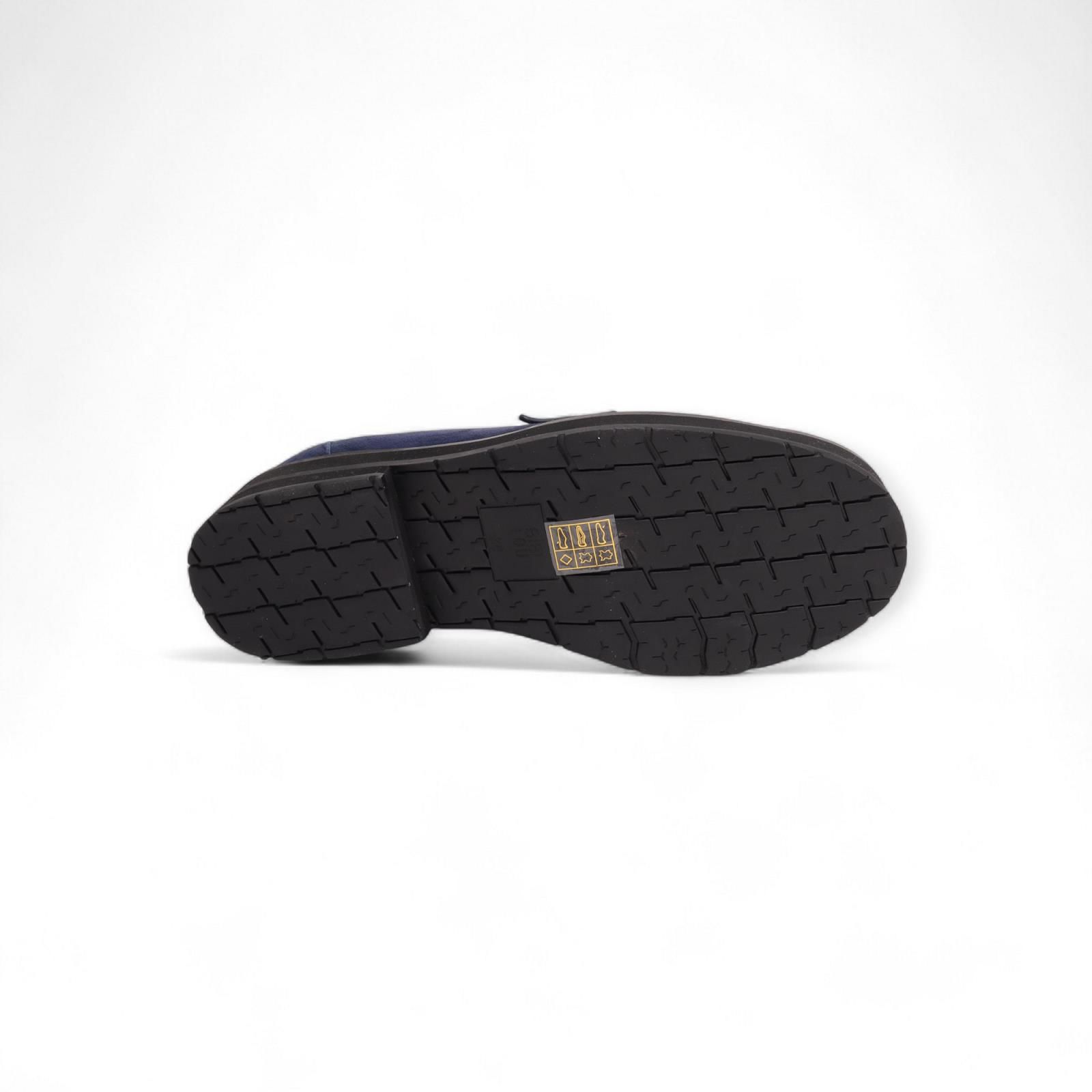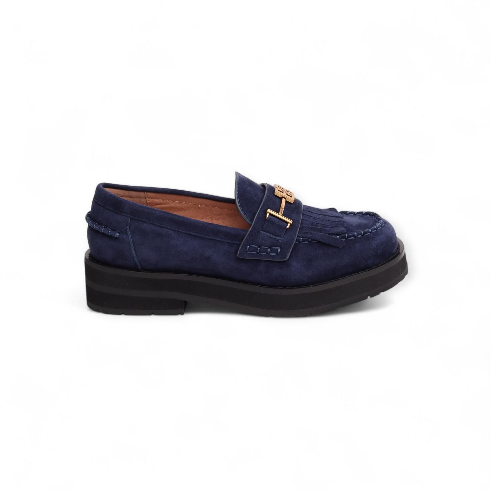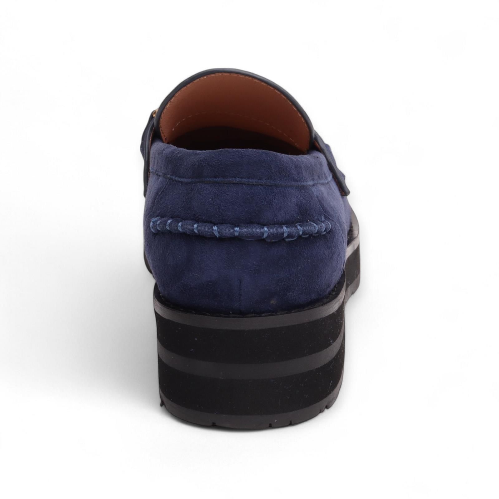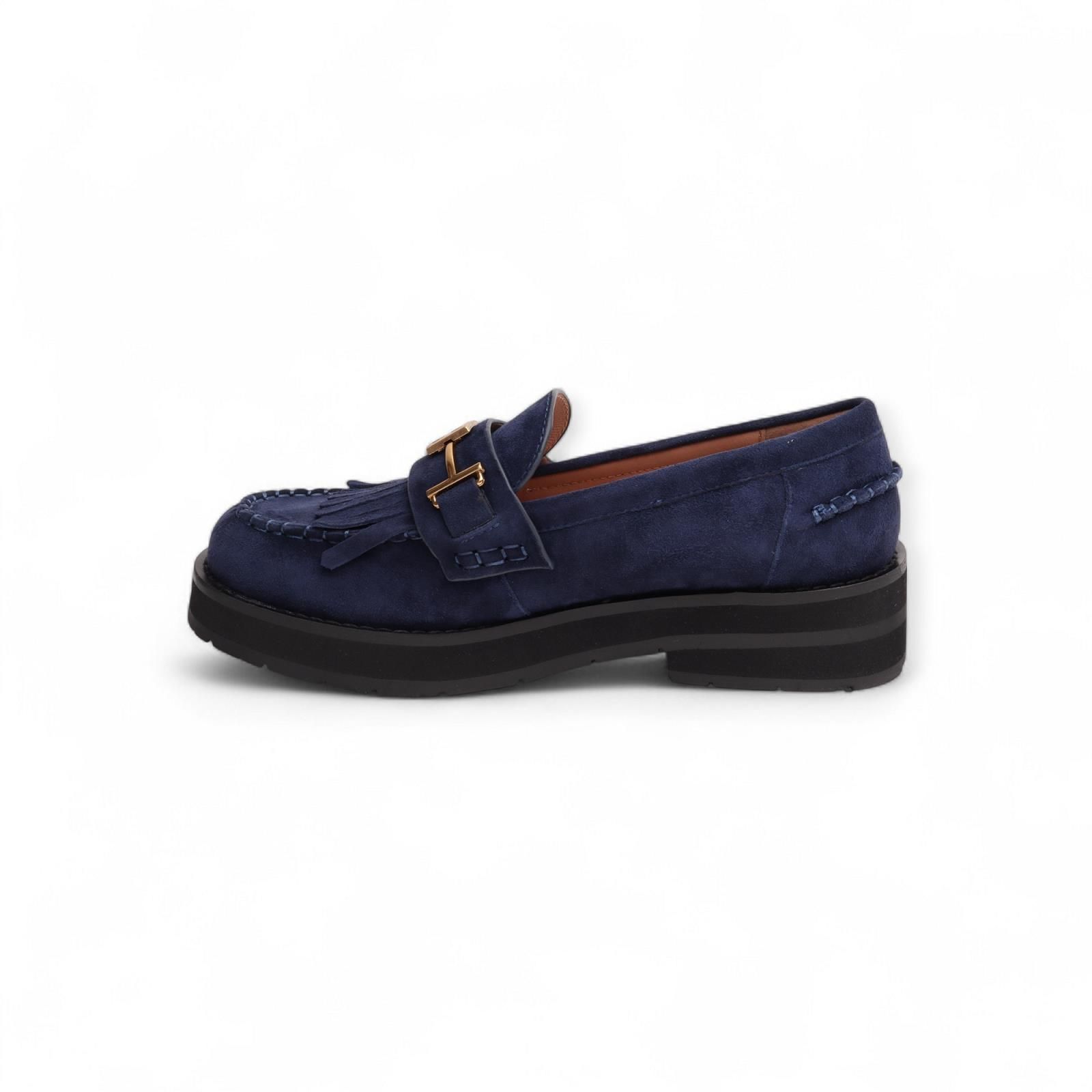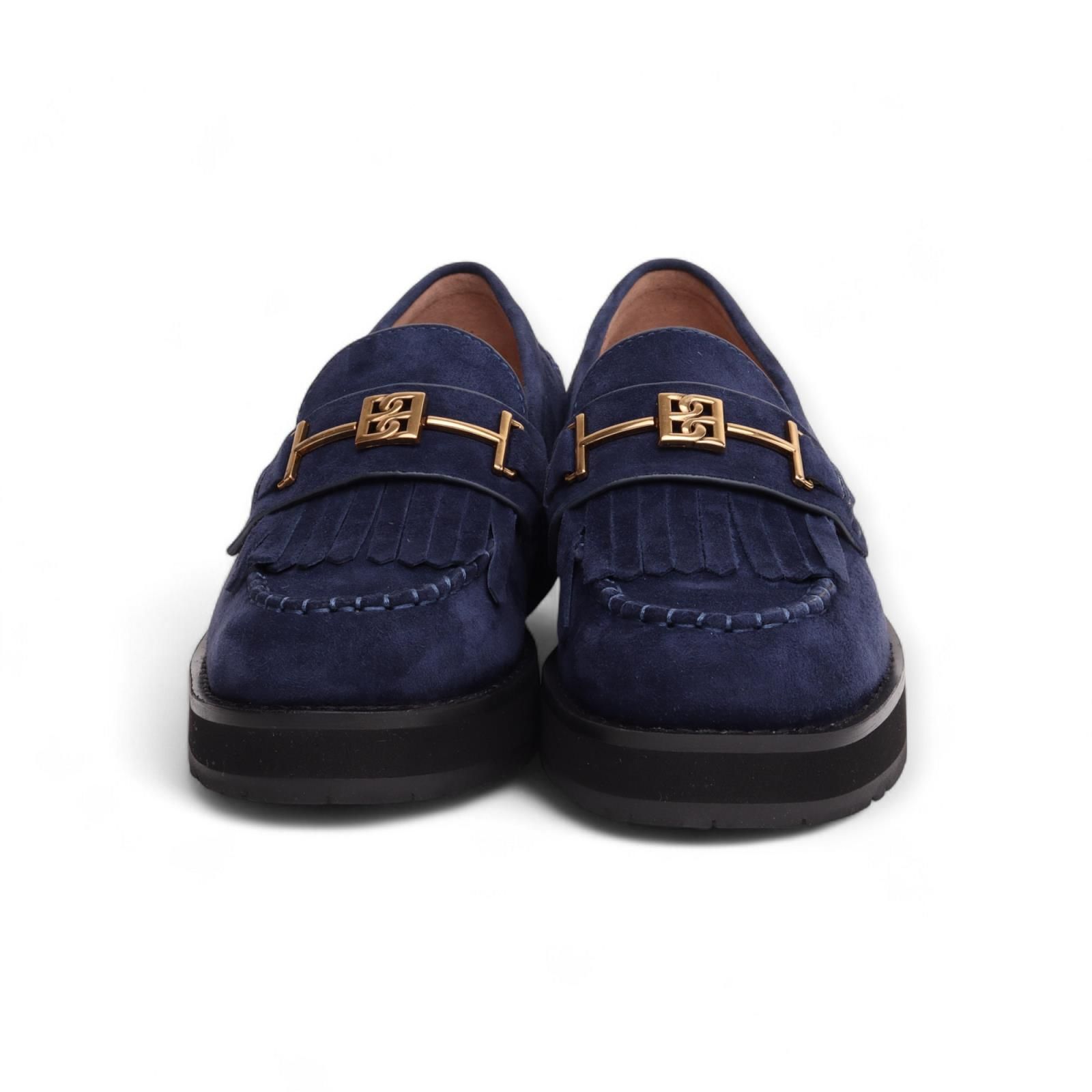 Mocassin van Tina voor dames. Deze loafer is in blauw suède leder met een dikke zwarte microzool die licht aan de voet voelt. Is mooi afgewerkt met een extra band over de wreef met gouden boekel en een extra flap.