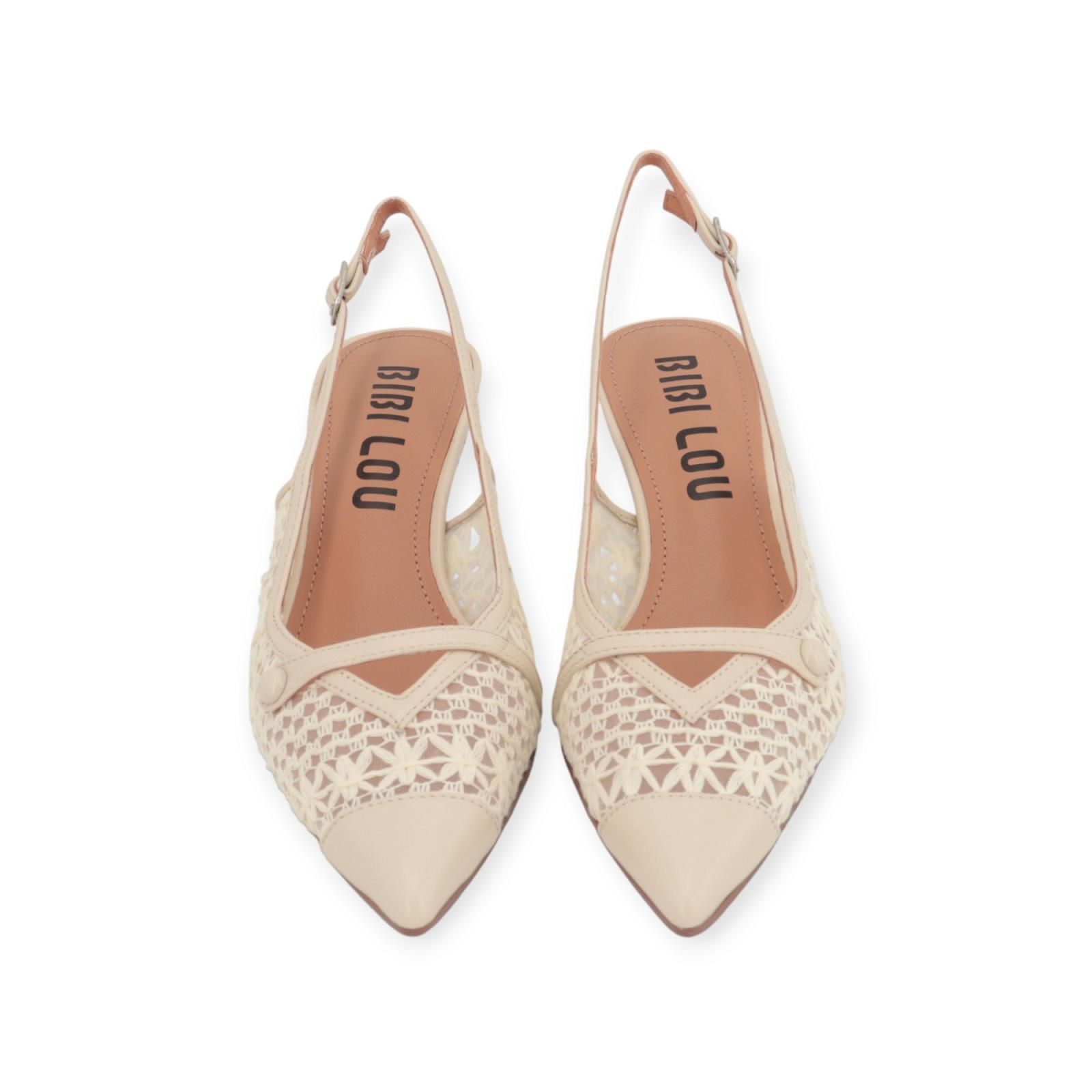 Pump Xaia van Bibi Lou voor dames. Dit elegant slingback model is in off wit leer. Heeft een gesloten neus met een open hiel , afgesloten met een bandje rond de hiel met gespsluiting. Is aan de zijkant met een lichte gaas en raffia patroon afgewerkt met leer. Heeft ook nog een fijn bandje over de wreef met een vaste knoopsluiting als detail. Is op een fijnhakje van 6cm hoog, een leren buitenzool met antislip.