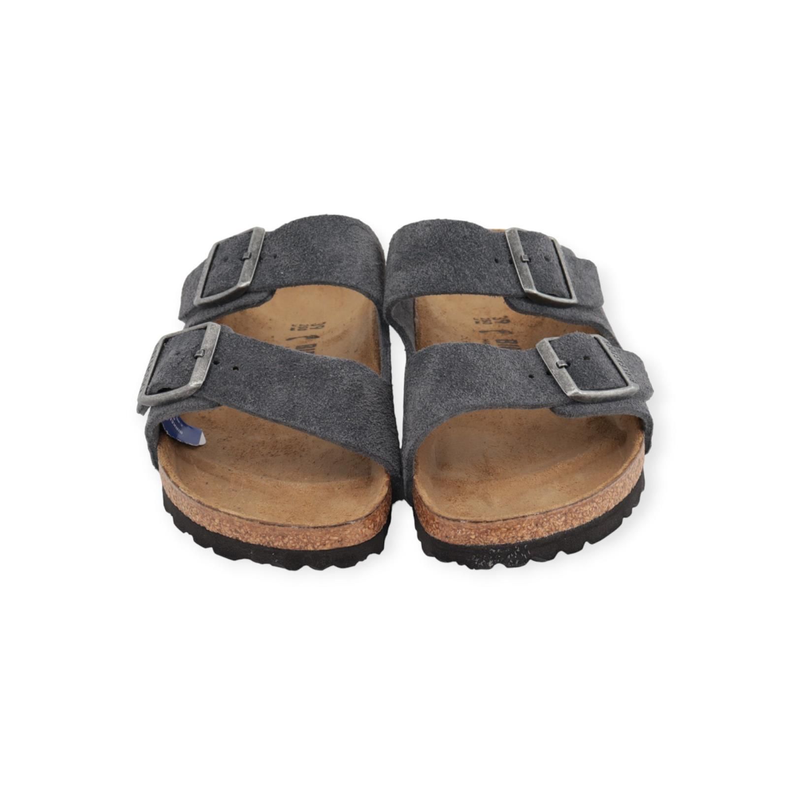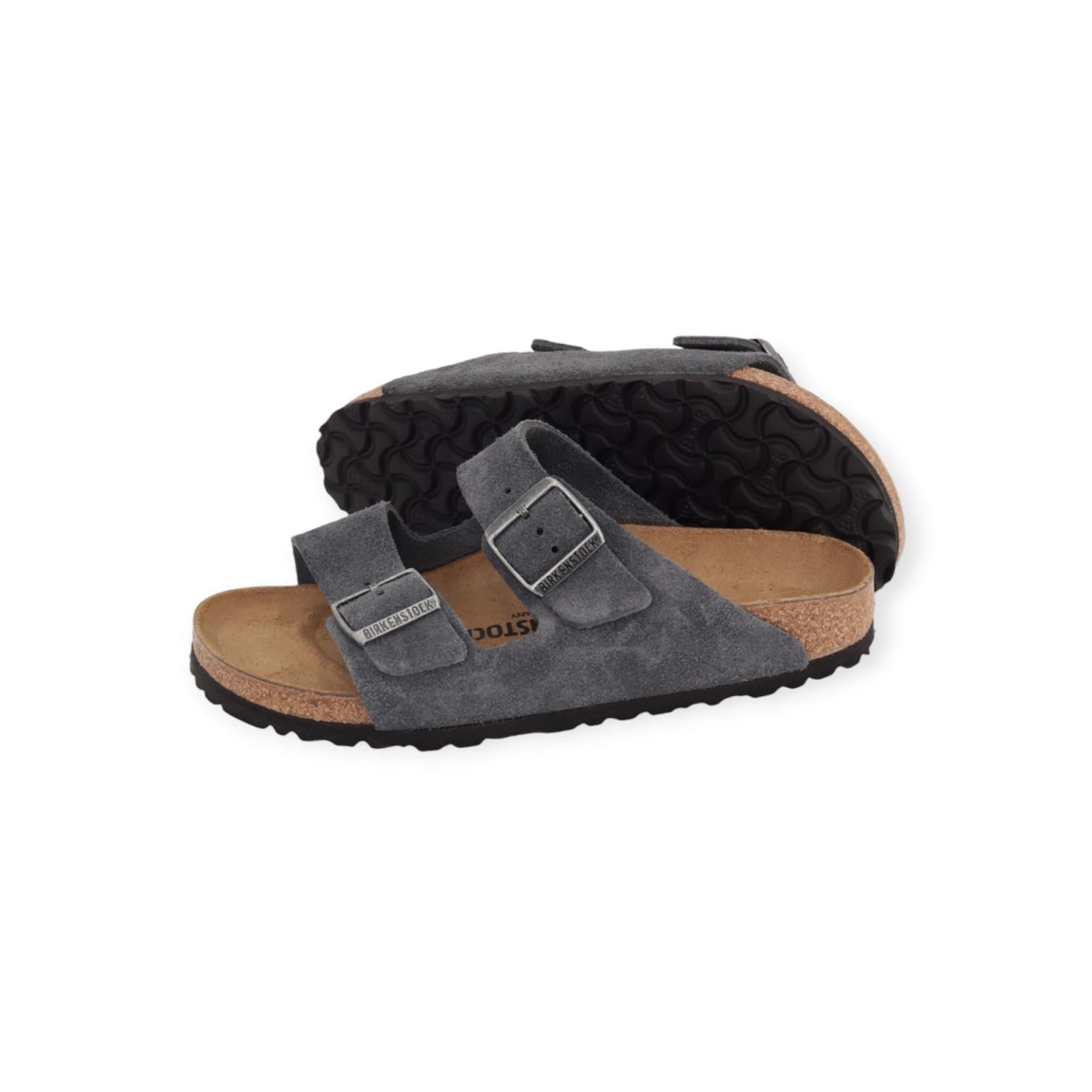 Arizona BS (Bettung Soft) slipper van Birkenstock voor dames. Deze slipper overtuigt door zijn goede pasvorm en zijn nonchalant, natuurlijk design. Het bovenmateriaal is in grijs - blauw suède die zeer zacht en soepel aanvoelt. Heeft als extra kenmerken het narrow fit (iets smaller) en het aangenaam soft- voetbed (BS) voetbed.