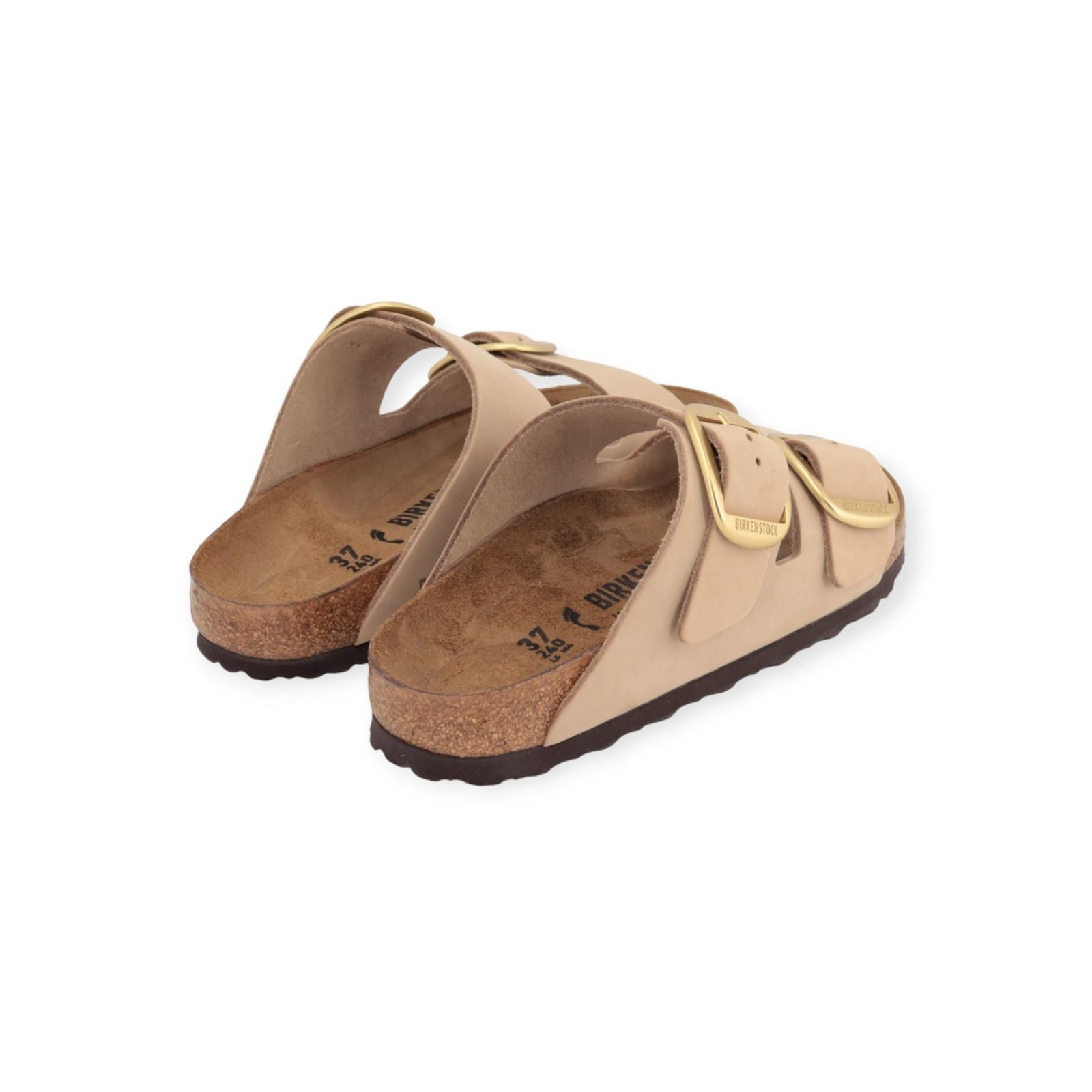 Arizona Big Buckle slipper van Birkenstock voor dames. Deze slipper overtuigt door zijn goed pasvorm en zijn nonchalant, natuurlijk design. Het bovenmateriaal is in zacht zand kleur (Sandcastle) nubuck, die zeer zacht en soepel aanvoelt. Deze variant is voorzien van hun populaire ‘Big Buckle’. Heeft als extra kenmerk narrow fit model(iets smaller).