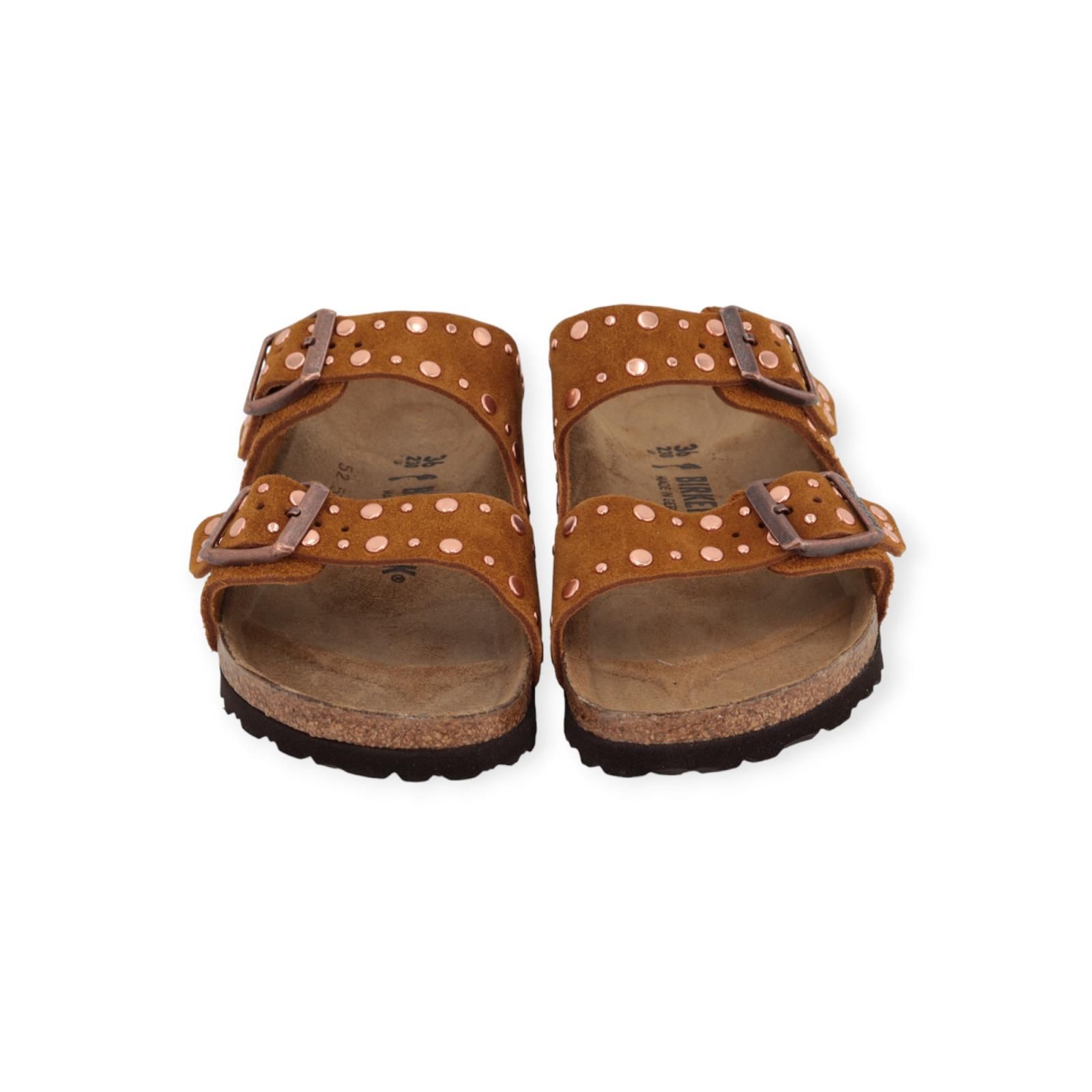 Arizona Rivet Border Suède slipper van Birkenstock voor dames. De Arizona is een echte klassieker die overtuigt door zijn goede pasvorm en zijn nonchalant, natuurlijk design. Deze Rivet variant is voorzien van klinknagels. Een echte eye-catcher. Het bovenmateriaal is in cognac suède die zeer zacht en soepel aanvoelt. Heeft als extra kenmerken het narrow fit (iets smaller).
