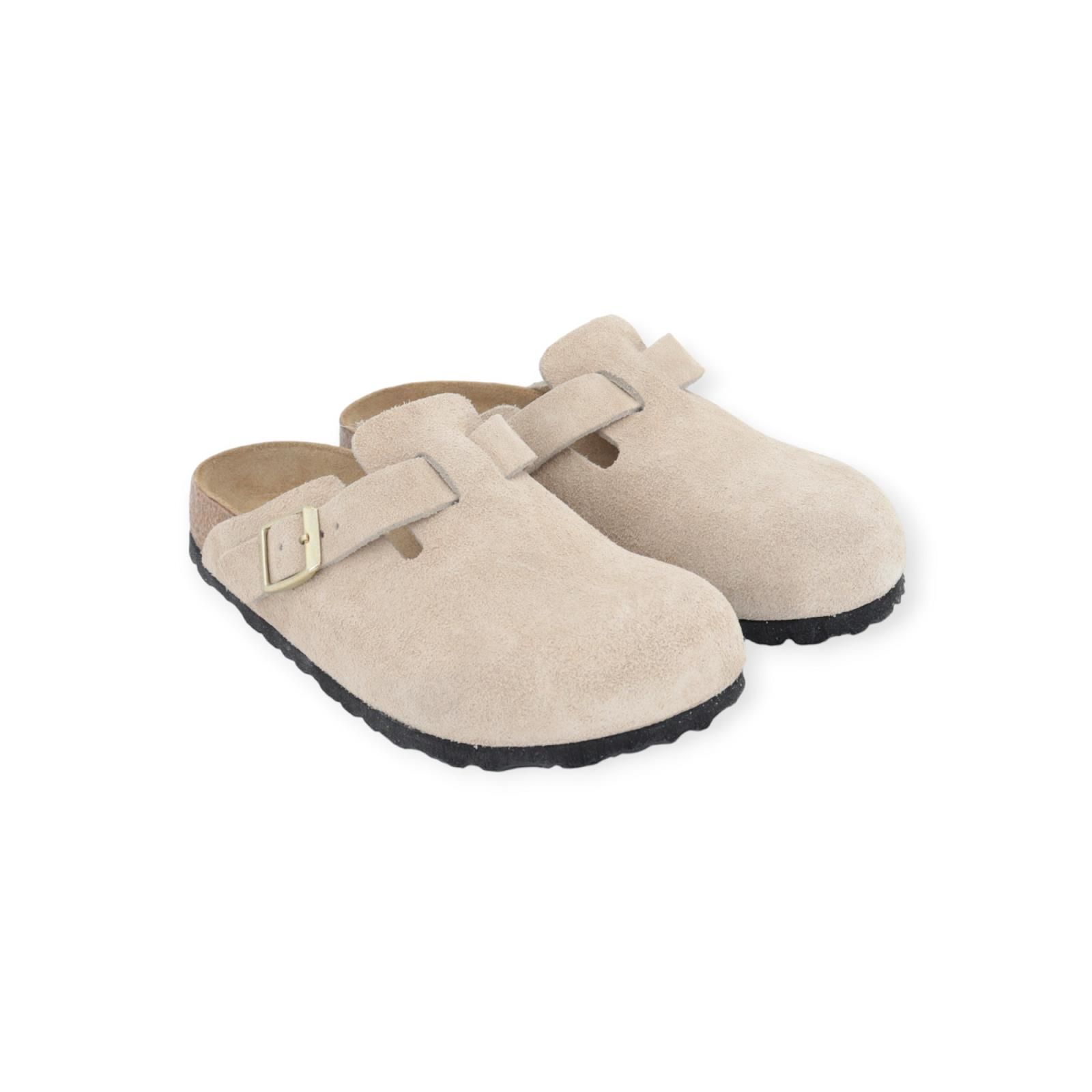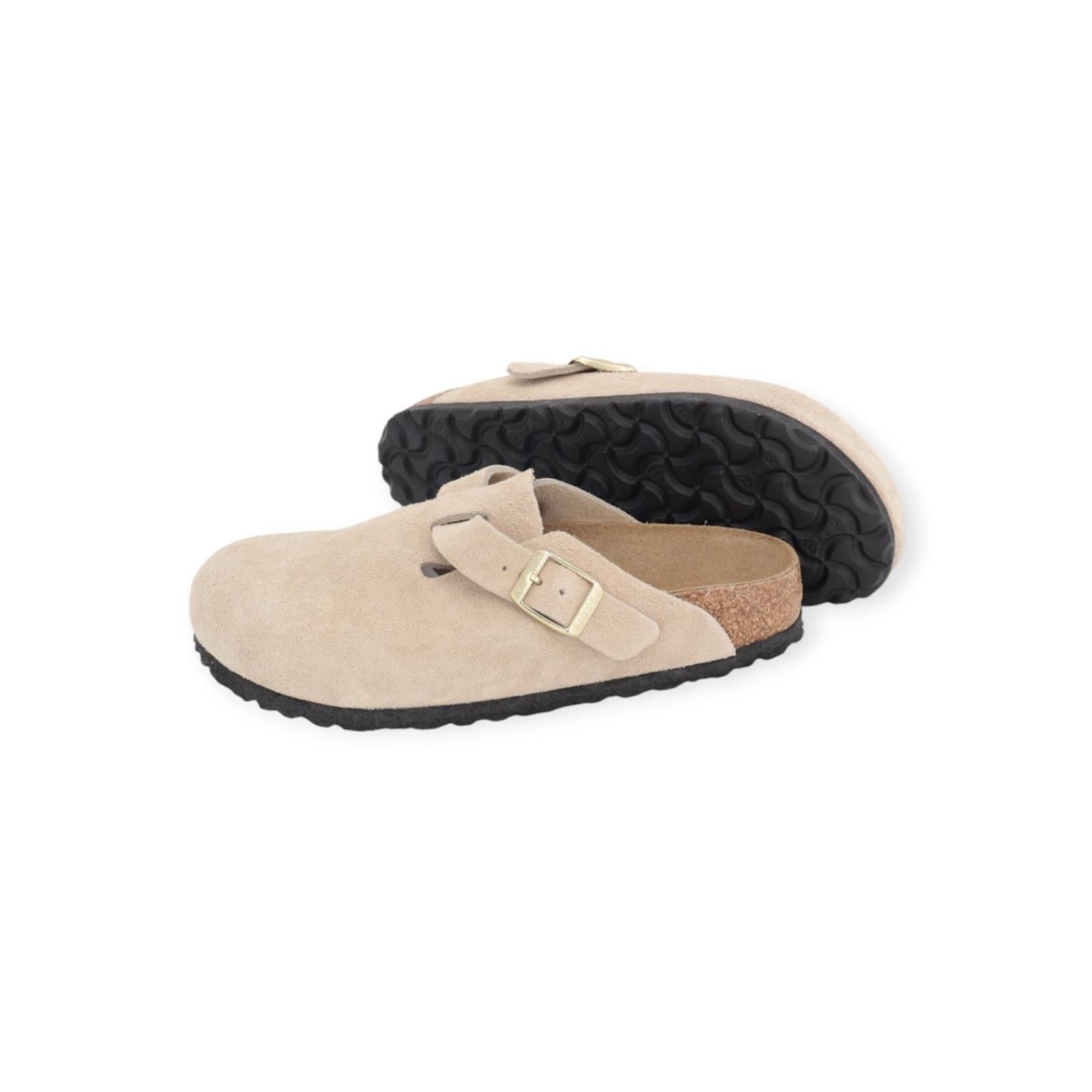 Slipper Boston BS van Birkenstock voor dames. Deze Birkenstock slipper is in zand suède met een suede leren verstelbare gesp. Deze Boston is nog specialer door hun zacht voetbed (BS). Heeft als extra kenmerk het narrow fit voetbed (iets smaller voetbed). Dankzij het ultra lichtgewicht biedt deze Birkenstock slipper optimale ondersteuning. De binnenkant is met een kurken zool en een leren bovenkant. Deze slipper is ideaal voor dagelijks gebruik.