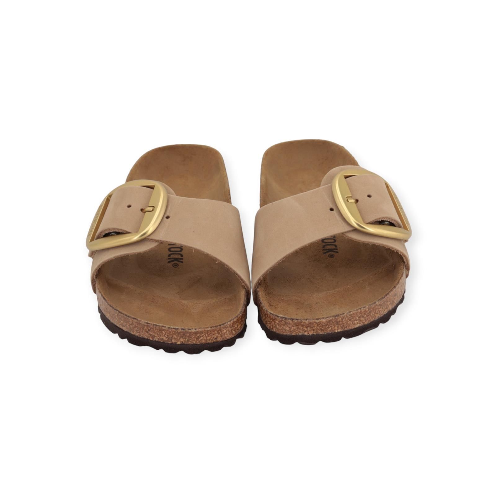 Madrid Big Buckle slipper van Birkenstock voor dames. Deze slipper is een echte klassieker die met zijn puristische design de modewereld inspireert. De variant Big Buckle is voorzien van een grote, elegante verstelbare gesp – een opvallende blikvanger op de verder zeer eenvoudig vormgegeven sandaal. Het bovenwerk bestaat uit zand ‘sandcastle’ nubuck dat opvalt door zijn natuurlijke, rustieke look. Is op een anatomisch gevormd voetbed.
