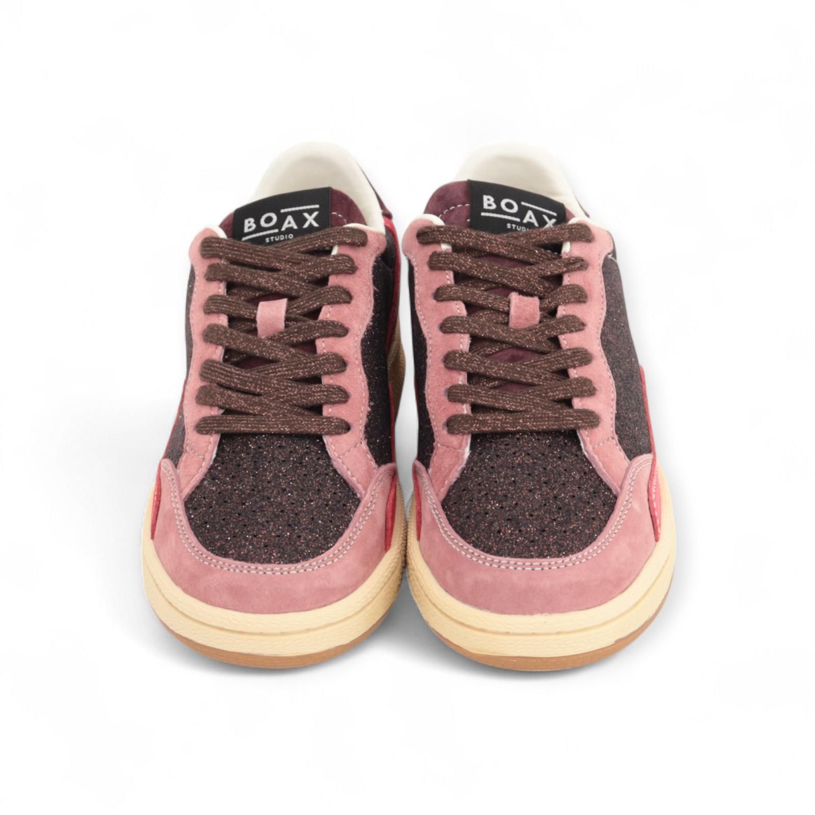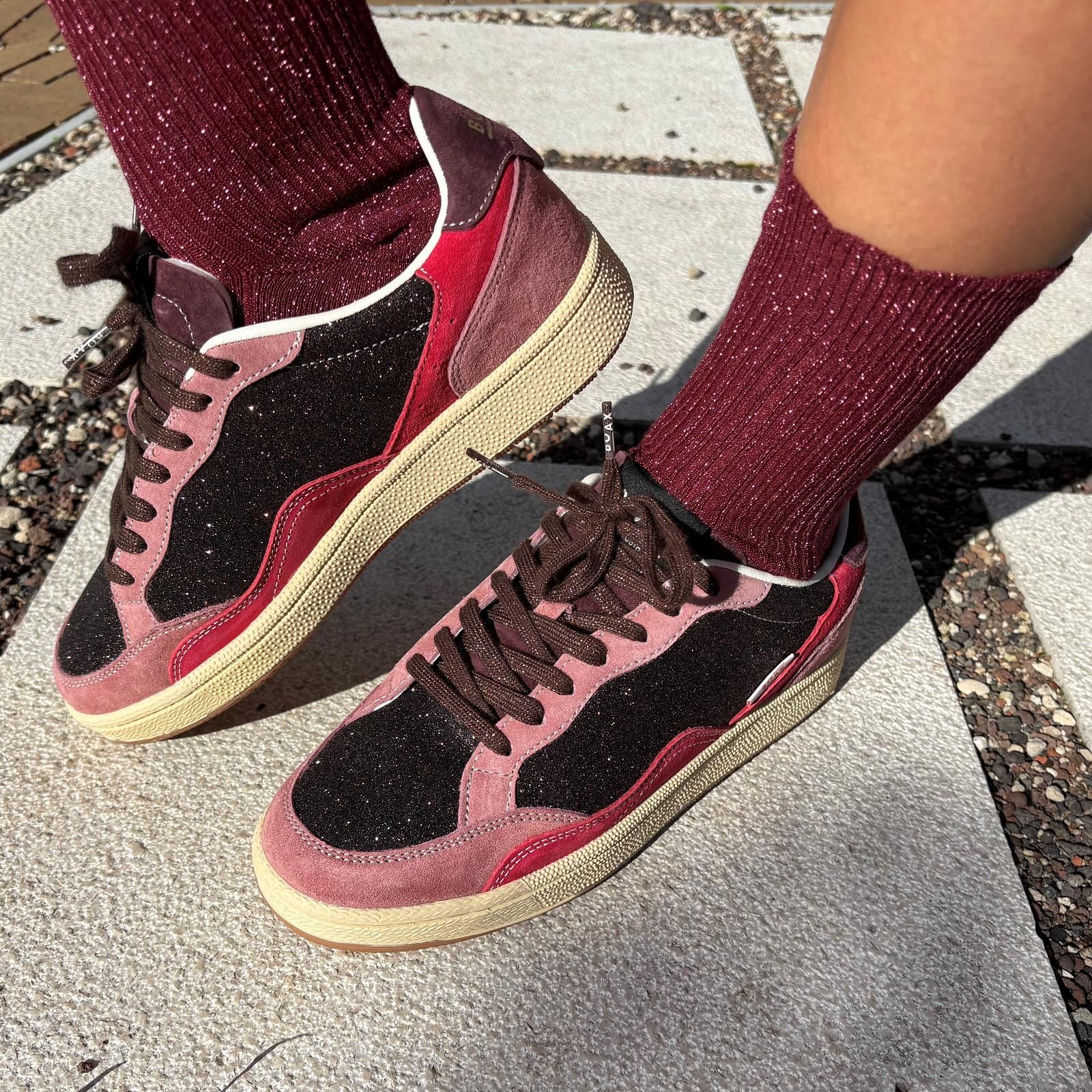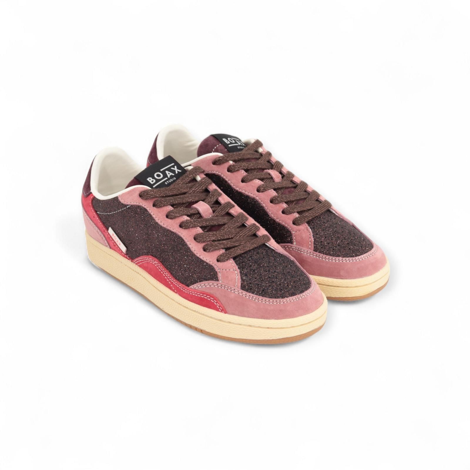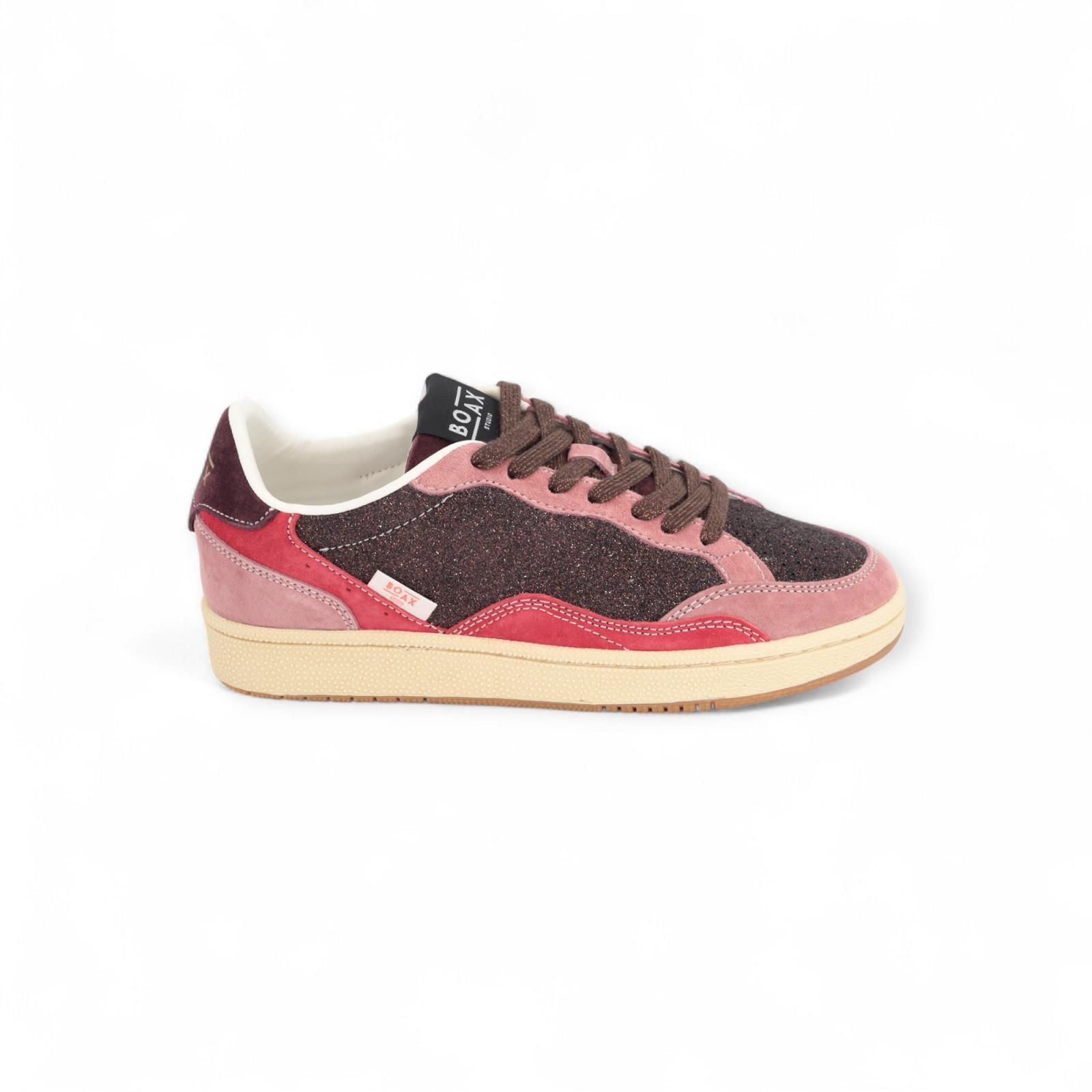Sneaker Ace van Boax voor dames. Deze sneaker is in bordeaux shining leer met roze tinten suède. Heeft een vaste zool en een uitneembare binnenzool.