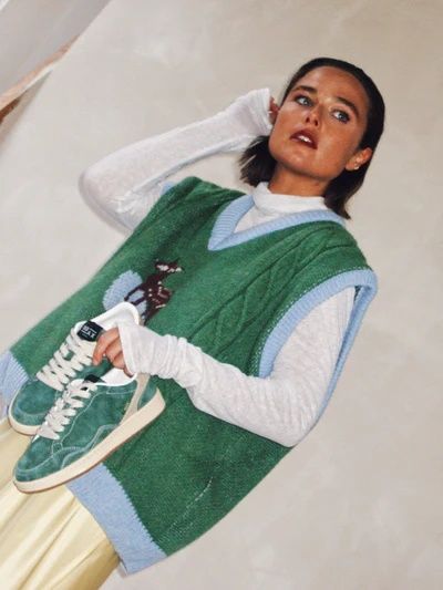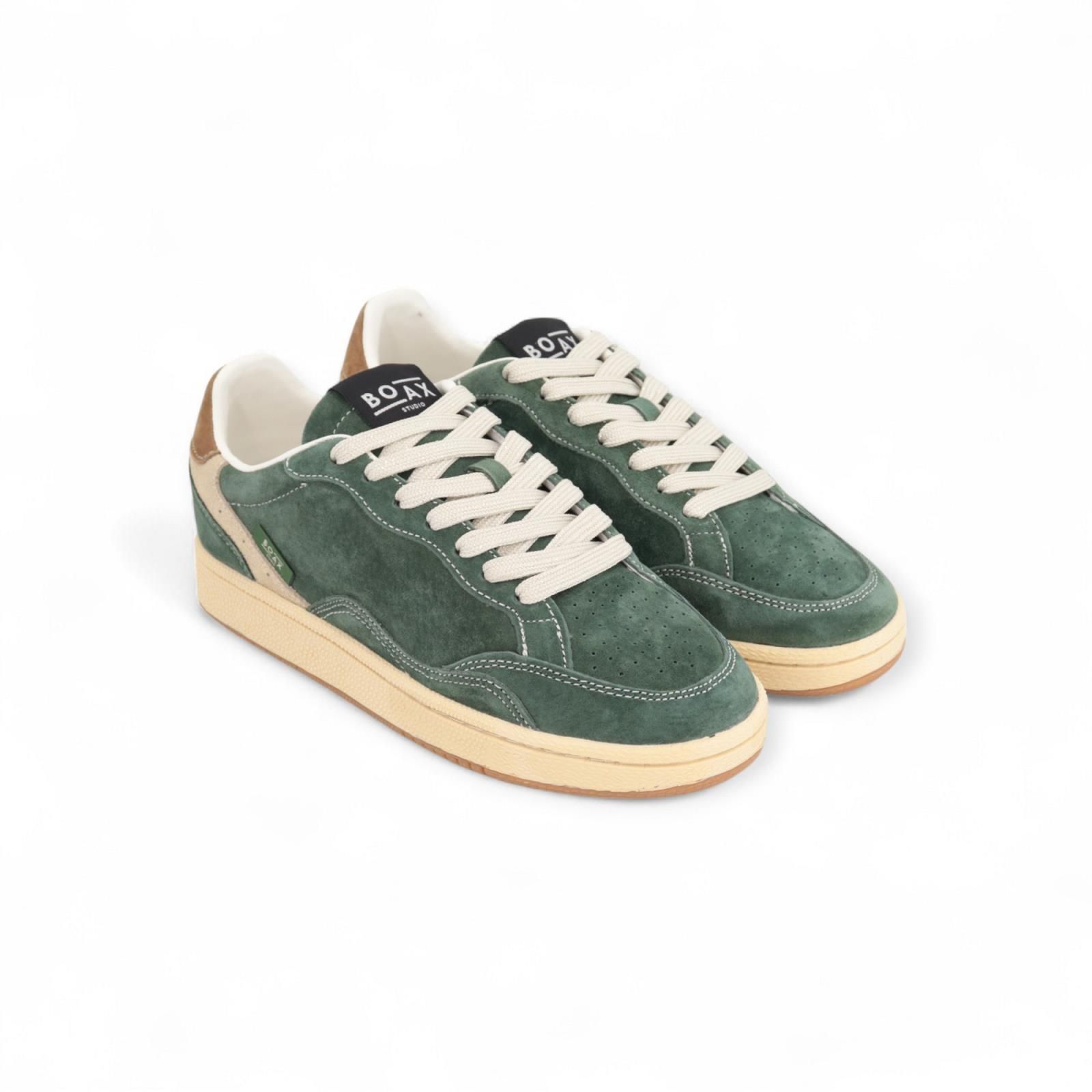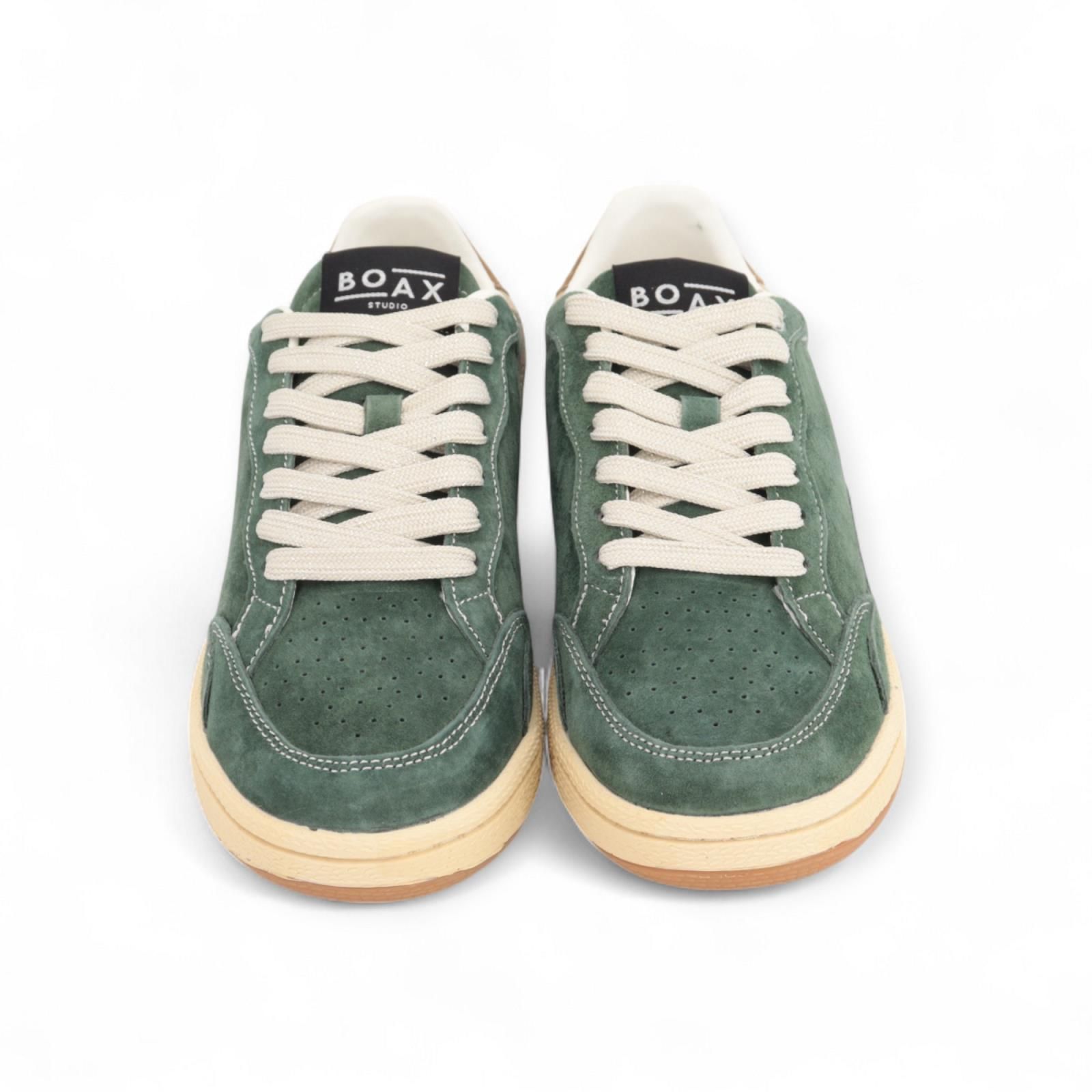Sneaker Ace van Boax voor dames. Deze sneaker is in groen suède afgewerkt met goud shining suède en een camel hielflap. Is op een vaste zool met een uitneembare binnenzool.