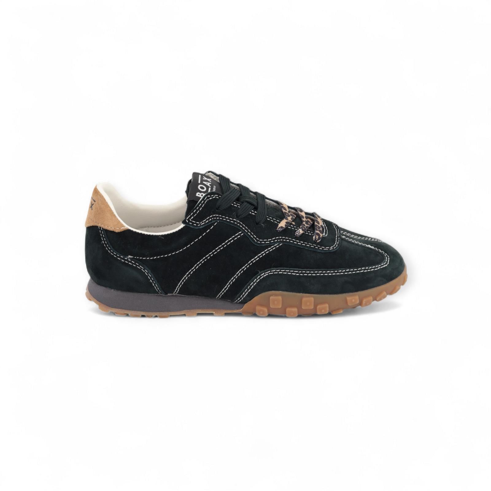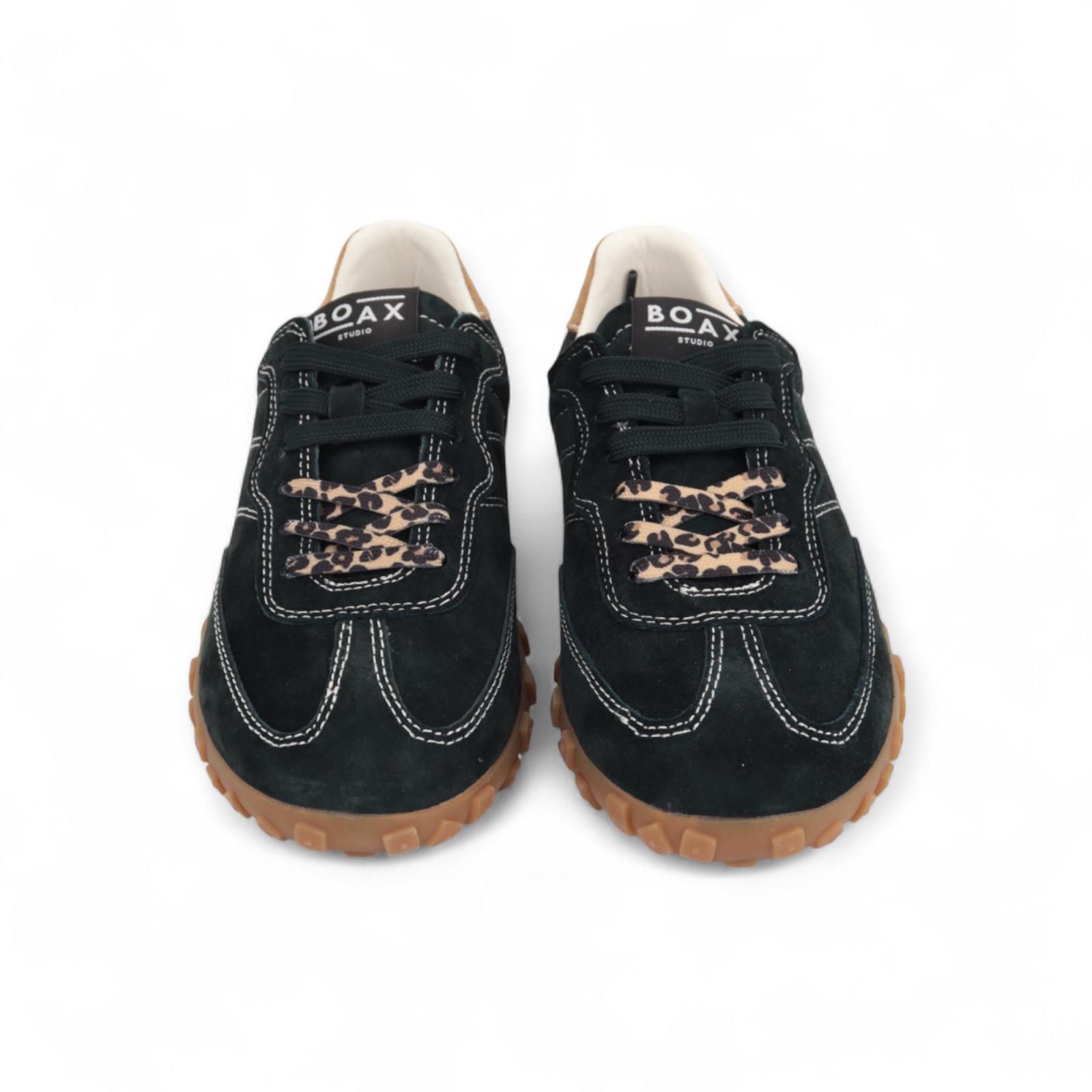 Sneaker Strike van Boax voor dames. Deze toffe sneaker is in zwart suède met wit stiksel en een camel hielflap. Combineer deze met de effen zwarte veters of de leopard veters. Heeft een bruine gummyzool die zeer licht aan de voet voelt. De binnenzool is uitneembaar.