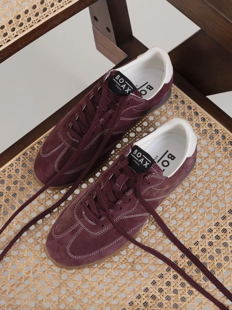 Sneaker Strike van Boax voor dames. Deze toffe sneaker is in bordeaux suède met wit stiksel en een zwarte hielflap. Heeft een bruine gummyzool die zeer licht aan de voet voelt. De binnenzool is uitneembaar.